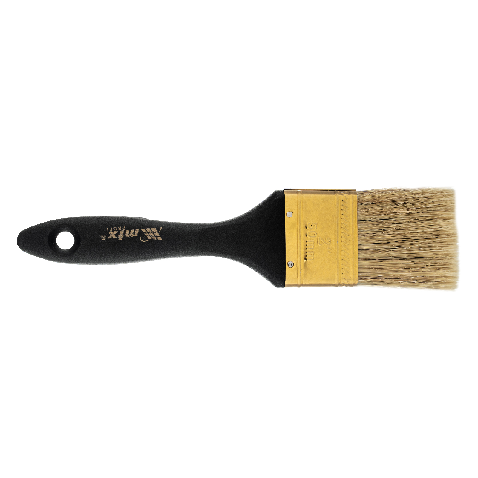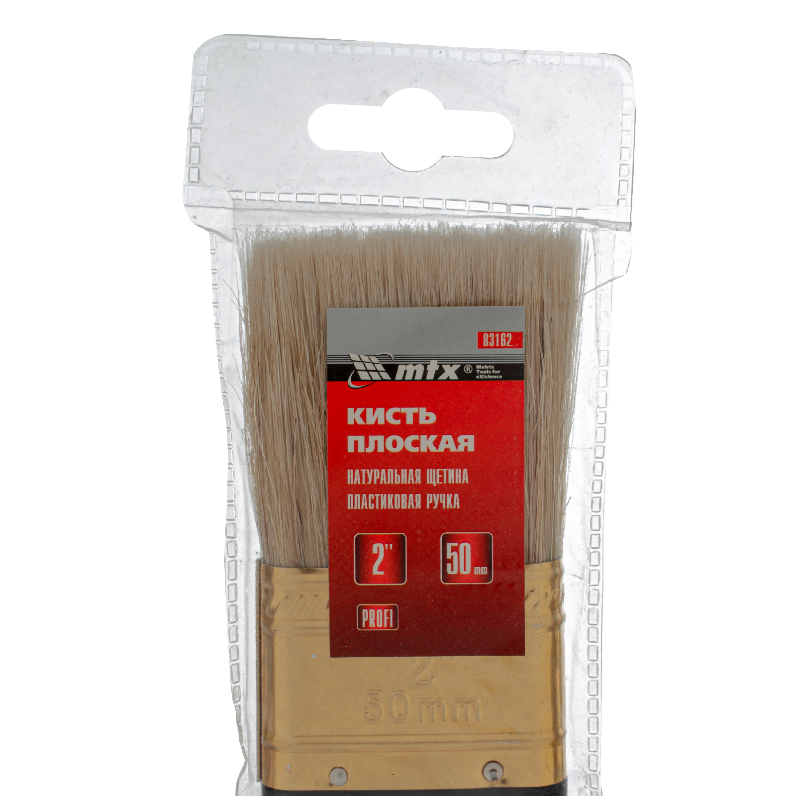 Плоская кисть «Профи» MTX 83162 шириной 2 дюйма, с натуральной щетиной и пластмассовой ручкой, рассчитана на профессиональное выполнение малярных работ. Натуральная щетина с увеличенной плотностью набивки подходит для нанесения различных типов ЛКМ, в том числе содержащих растворители.