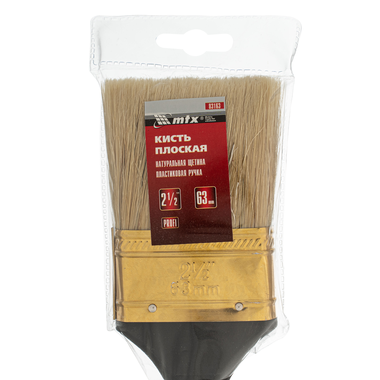 Плоская кисть «Профи» MTX 83163 шириной 2,5 дюйма, с натуральной щетиной и пластмассовой ручкой, рассчитана на профессиональное выполнение малярных работ. Натуральная щетина с увеличенной плотностью набивки подходит для нанесения различных типов ЛКМ, в том числе содержащих растворители.