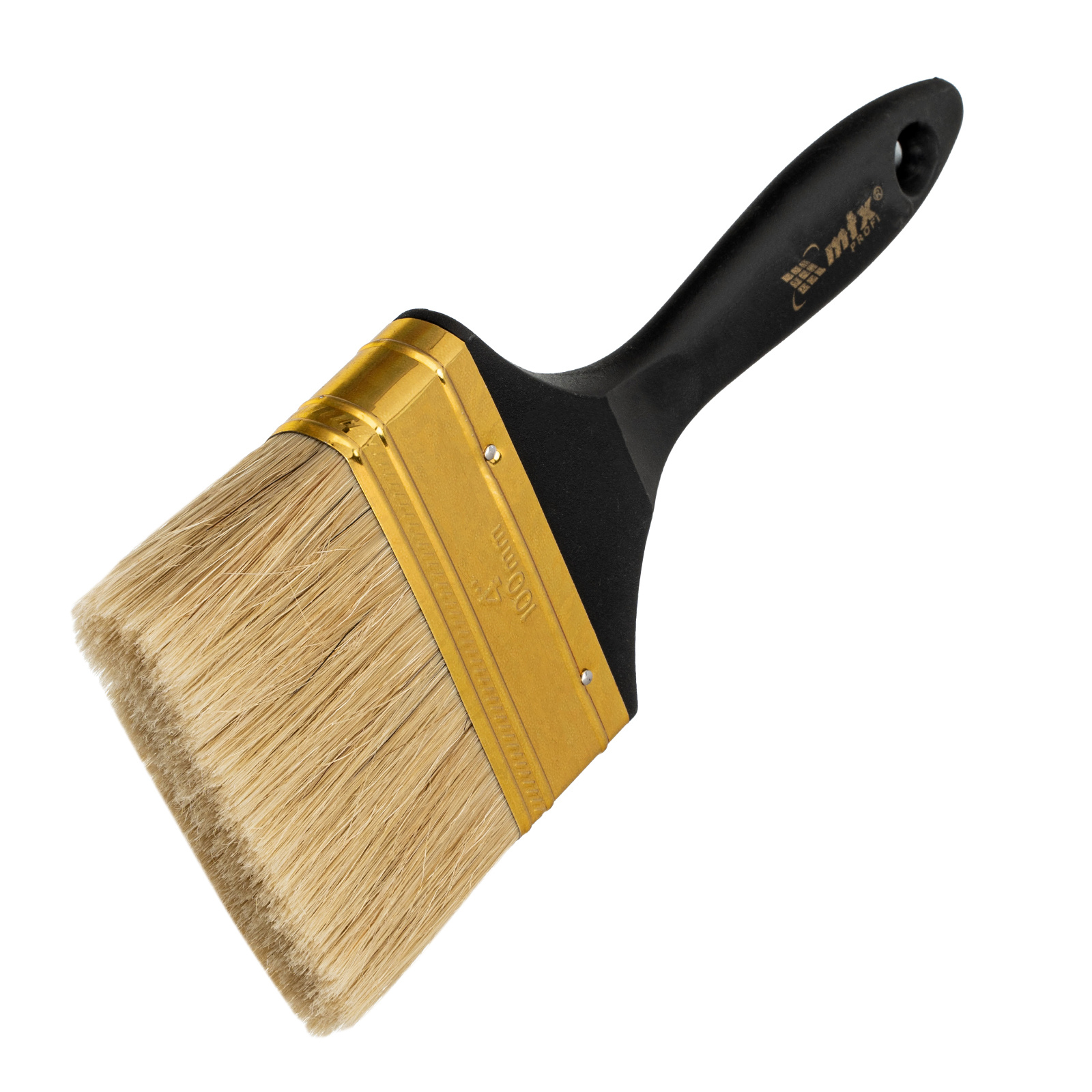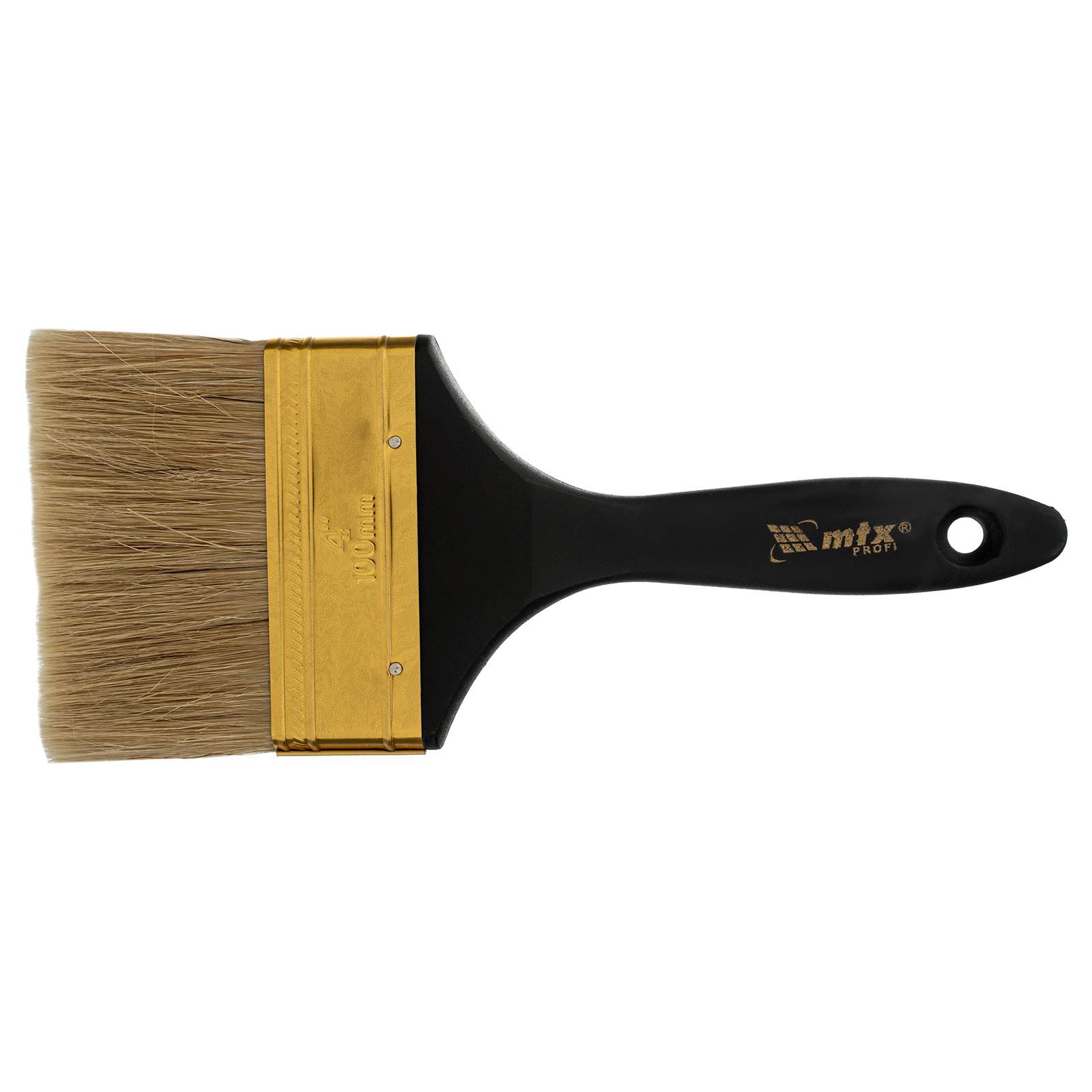 Плоская кисть «Профи» MTX 83165 шириной 4 дюйма, с натуральной щетиной и пластмассовой ручкой, рассчитана на профессиональное выполнение малярных работ. Натуральная щетина с увеличенной плотностью набивки подходит для нанесения различных типов ЛКМ, в том числе содержащих растворители.