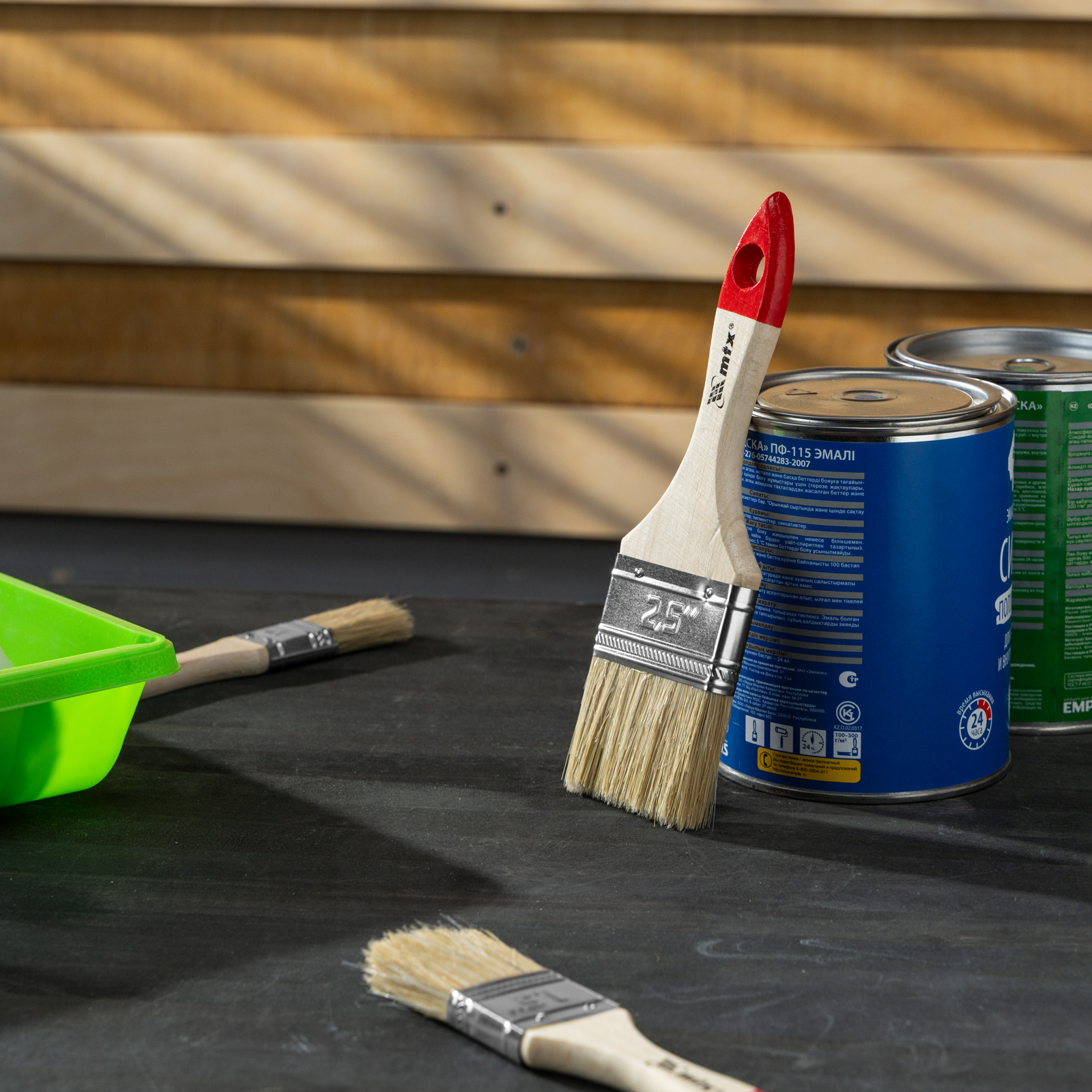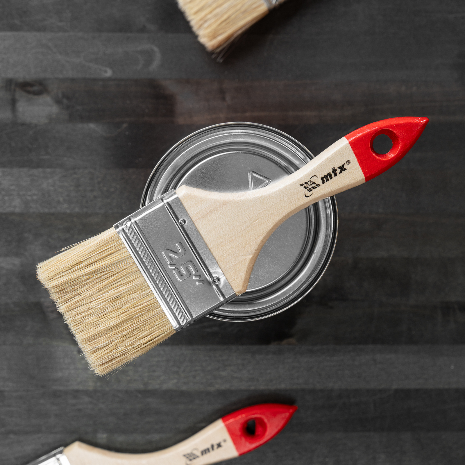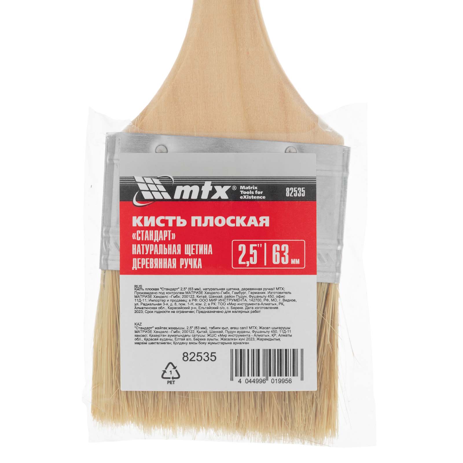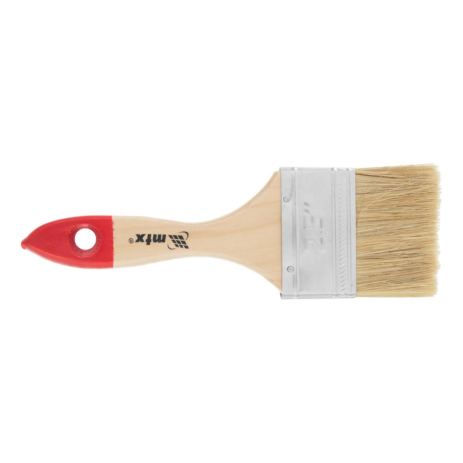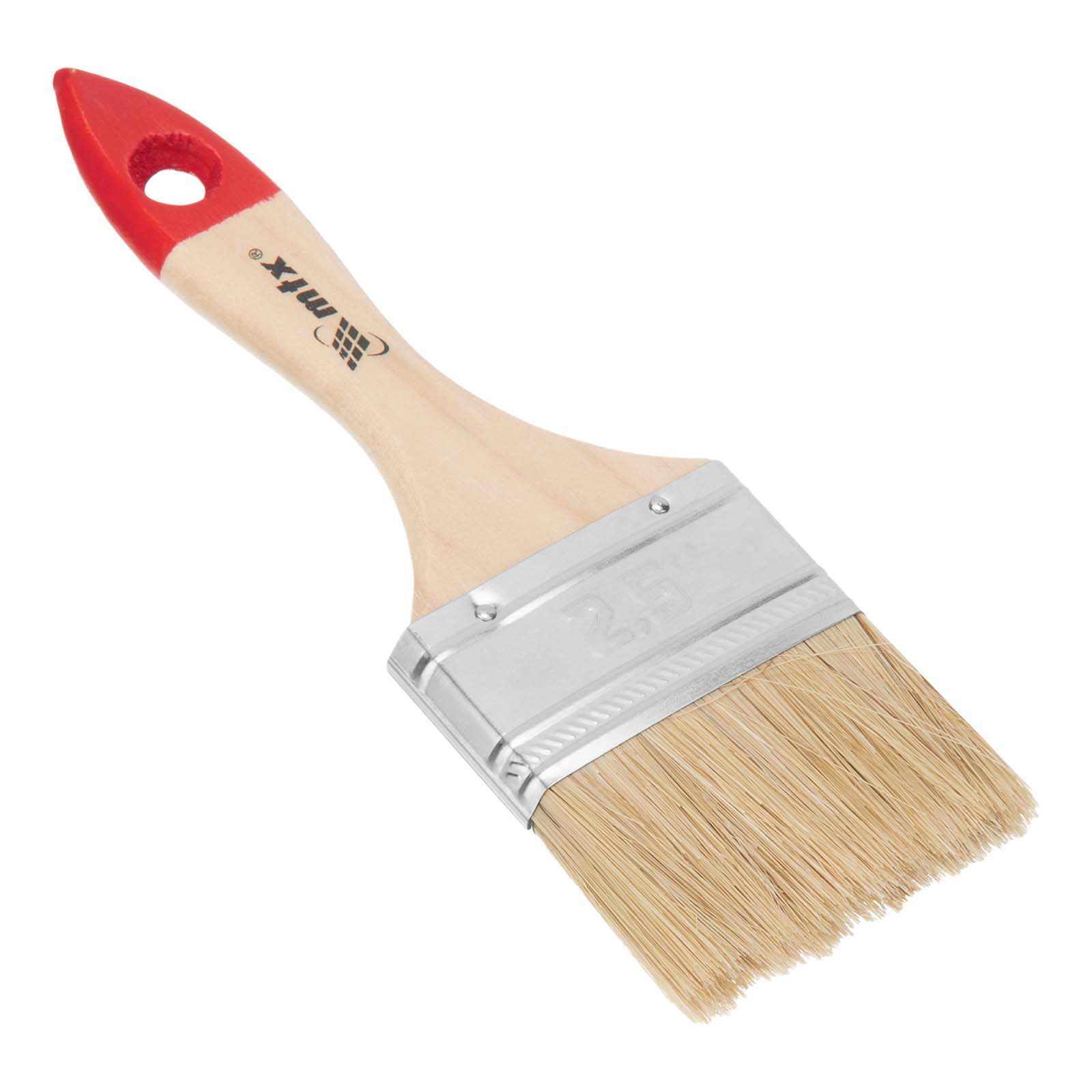 Плоская кисть MTX «Стандарт» 82535 шириной 2,5 дюйма (63 мм), с натуральной щетиной и деревянной ручкой, — инструмент для проведения бытовых малярных работ. Натуральная светлая щетина обладает высокой износоустойчивостью и подходит для нанесения красок на основе растворителей. За счет ширины 63 мм кисть подходит для окрашивания участков небольшой площади.