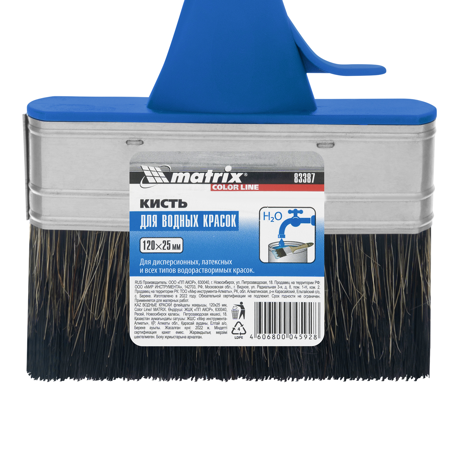 Плоская кисть Matrix Color Line «ВОДНЫЕ КРАСКИ» 83387 шириной 120 мм и толщиной 25 мм разработана специально для использования с составами на водной основе, в том числе деревообрабатывающими. Комбинированная щетина оптимальна для работы с водными лакокрасочными материалами — искусственные волокна препятствуют деформации, а натуральные удерживают большой объем краски.