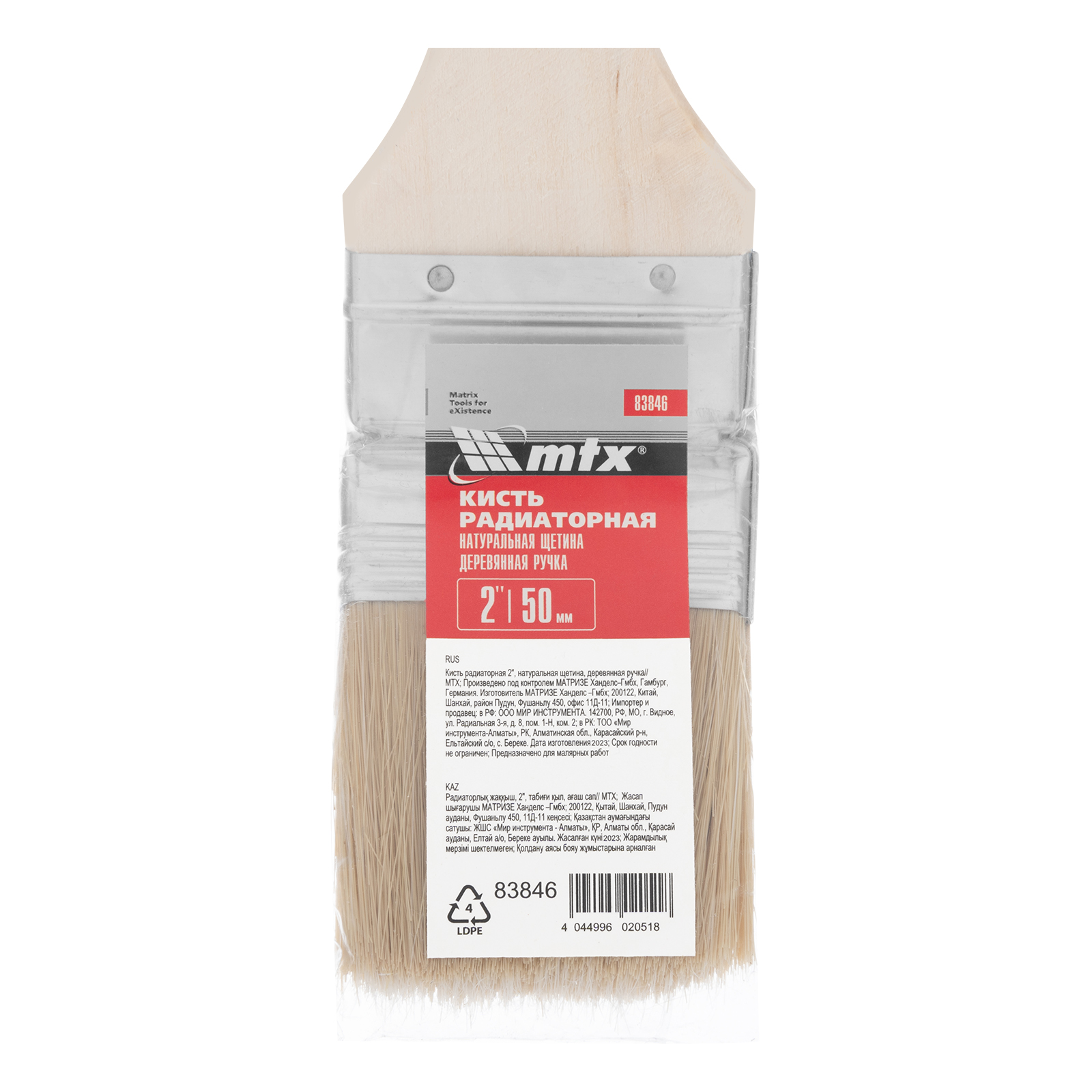 Радиаторная кисть MTX 83846 шириной 2", с натуральной щетиной и деревянной ручкой, используется для окрашивания радиаторов водяного отопления, металлических проволочных конструкций, труб, а также углов и стыков стен. Решение этих задач облегчает удлиненная ручка изогнутой формы. Натуральная щетина устойчива к агрессивным средам, поэтому кисть может применяться с эмалями и масляными красками.