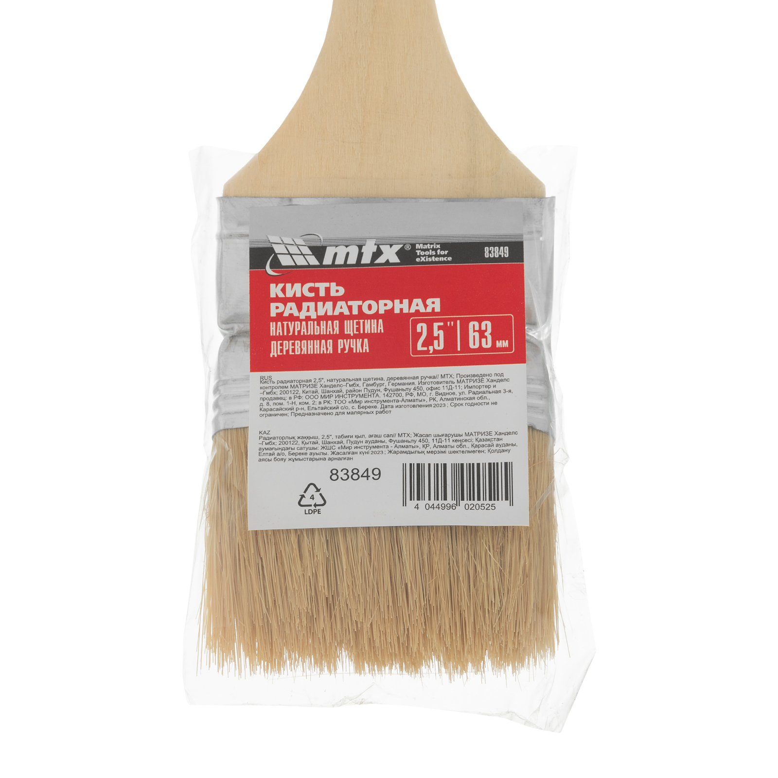 Радиаторная кисть MTX 83849 шириной 2,5", с натуральной щетиной и деревянной ручкой, используется для окрашивания радиаторов водяного отопления, металлических проволочных конструкций, труб, а также углов и стыков стен. Решение этих задач облегчает удлиненная ручка изогнутой формы. Натуральная щетина устойчива к агрессивным средам, поэтому кисть может применяться с эмалями и масляными красками.