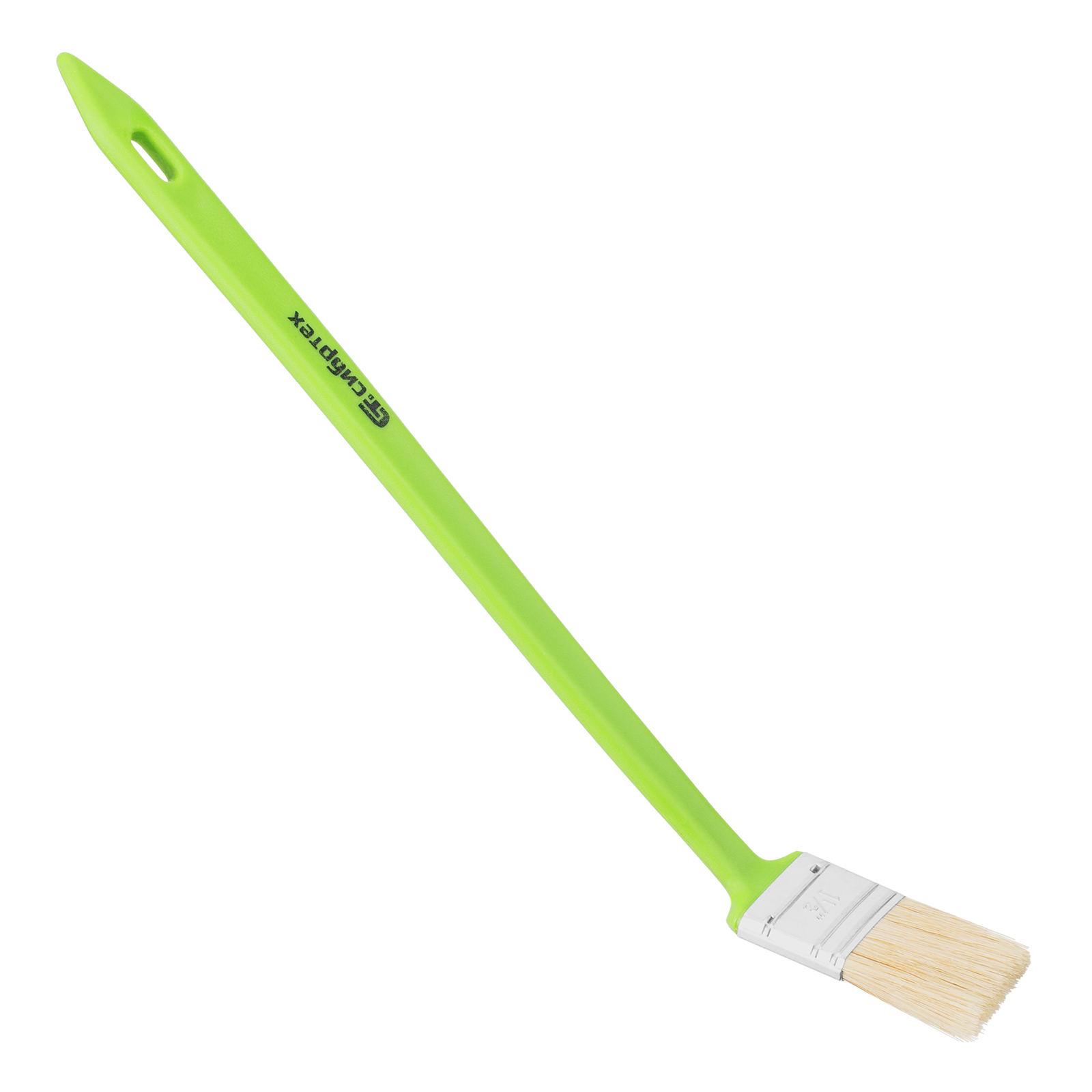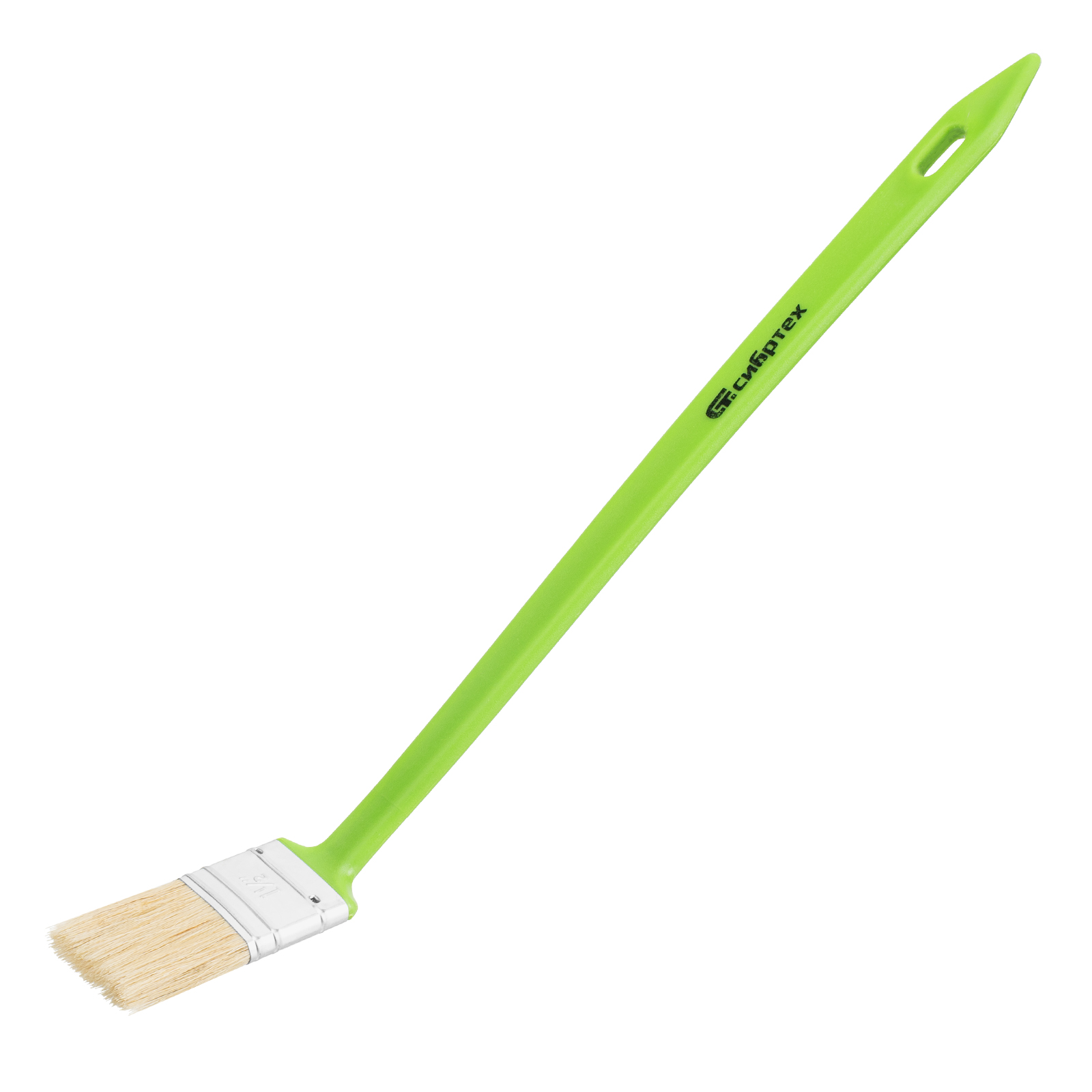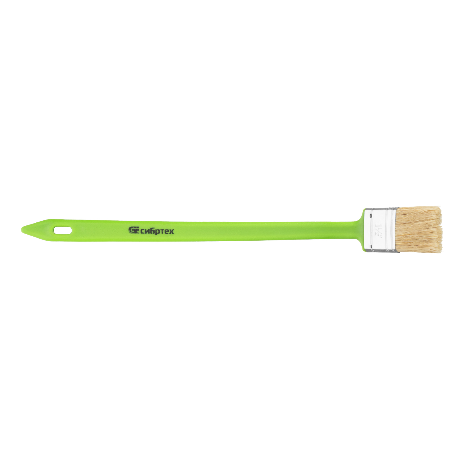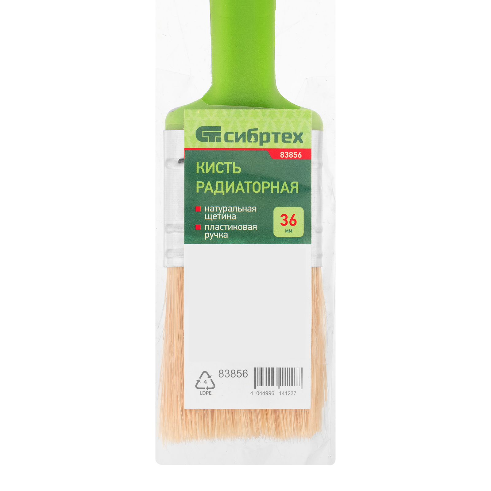 Радиаторная кисть Сибртех 83856 шириной 36 мм, с натуральной щетиной и пластиковой ручкой, позволяет окрашивать радиаторы, трубы, проволочные конструкции. Особенно удобна для покраски углов и стыков пола или потолка со стенами. Удлиненная ручка облегчает проведение малярных работ. Натуральная щетина с добавлением искусственного ворса устойчива к деформации и сохраняет упругость и краскообменные качества при использовании масляных красок и эмалей.