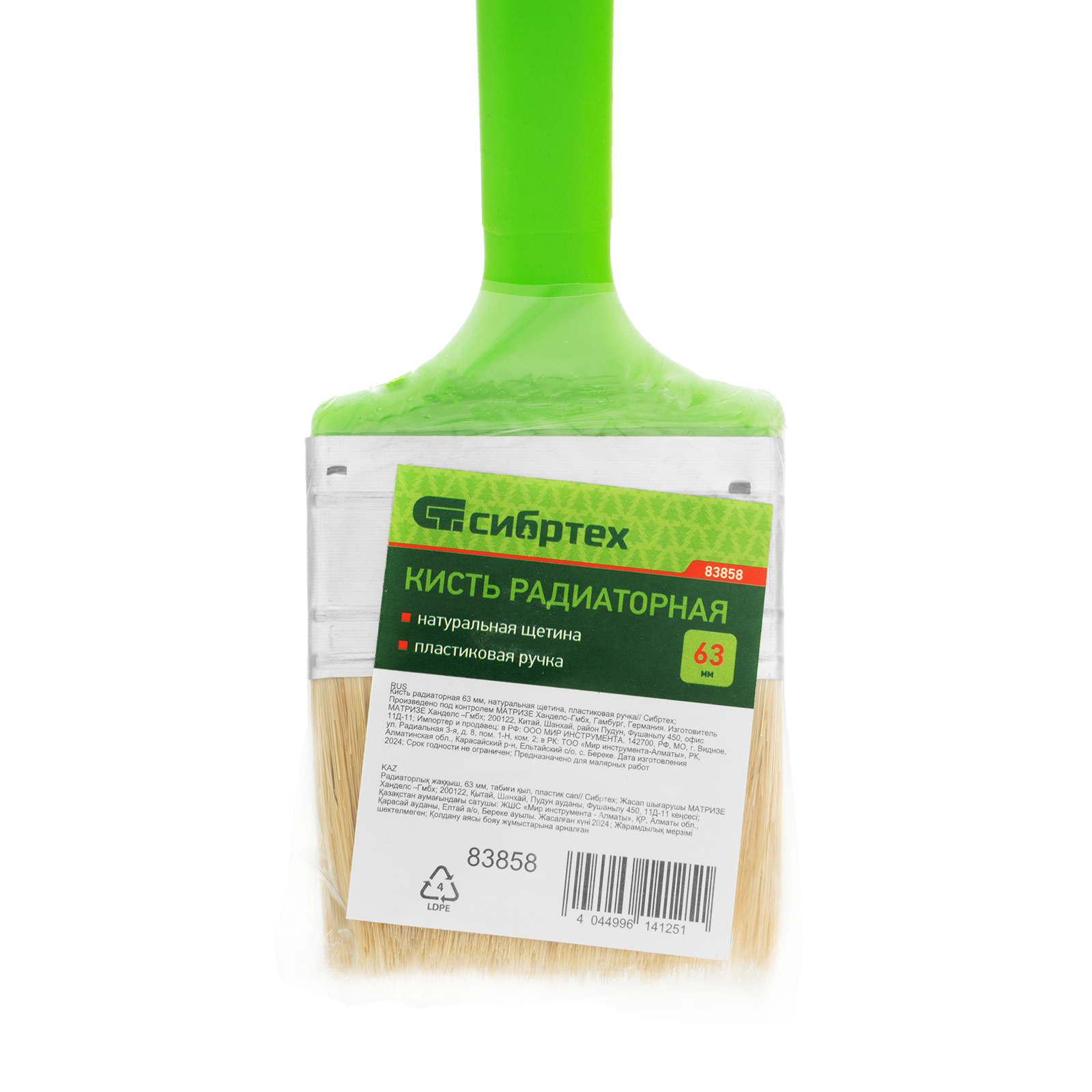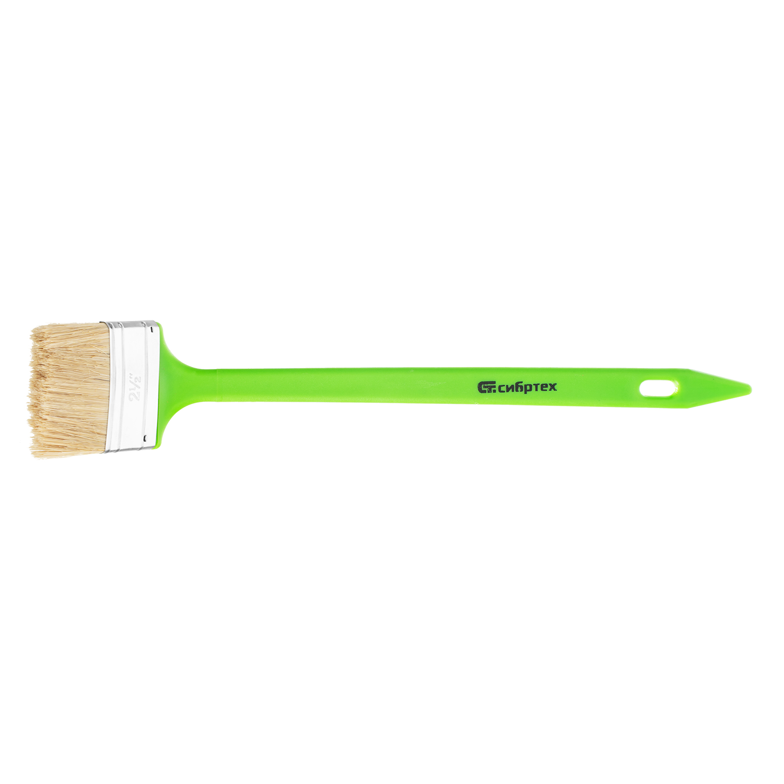 Радиаторная кисть Сибртех 83858 шириной 63 мм, с натуральной щетиной и пластиковой ручкой, позволяет окрашивать радиаторы, трубы, проволочные конструкции. Особенно удобна для покраски углов и стыков пола или потолка со стенами. Удлиненная ручка облегчает проведение малярных работ. Натуральная щетина с добавлением искусственного ворса устойчива к деформации и сохраняет упругость и краскообменные качества при использовании масляных красок и эмалей.
