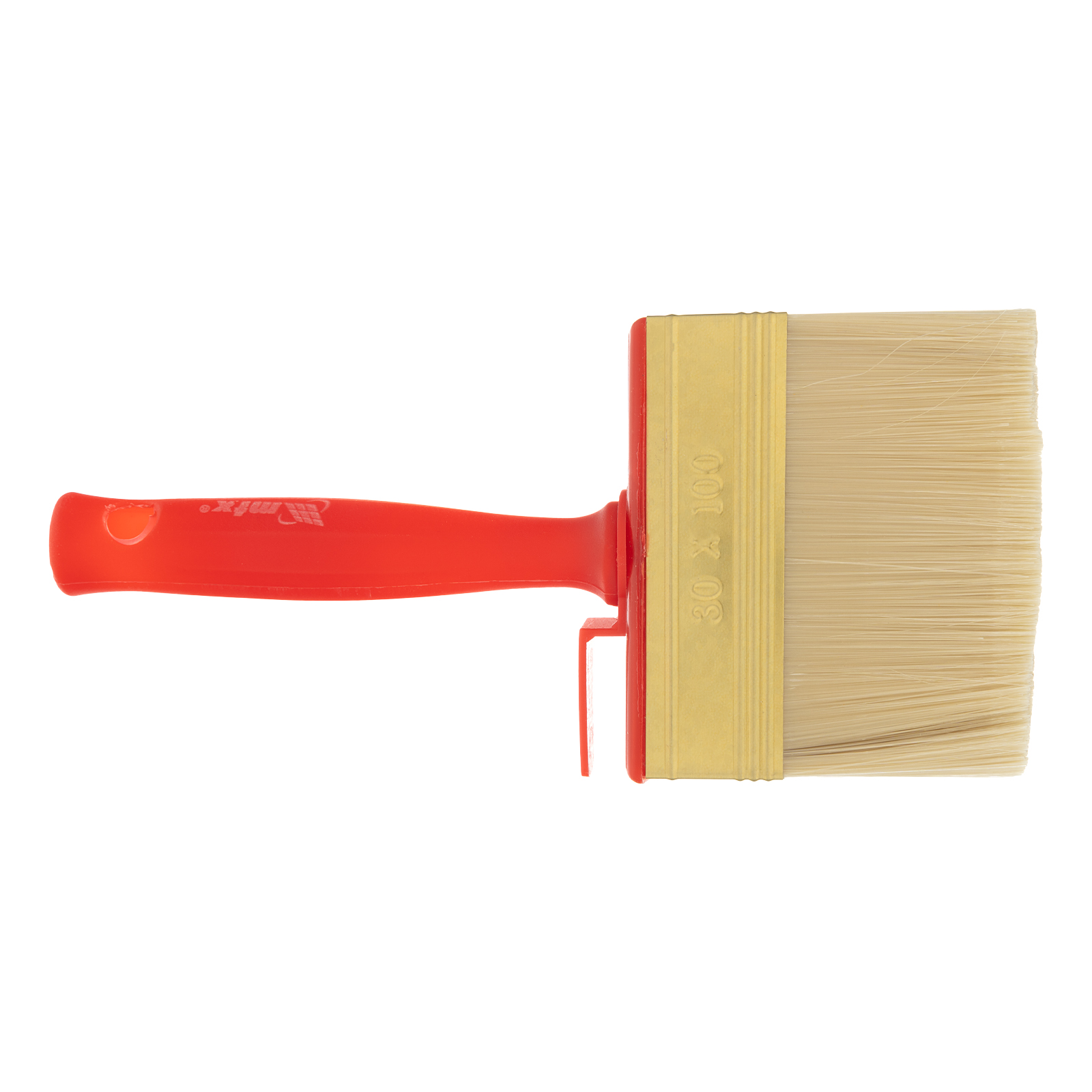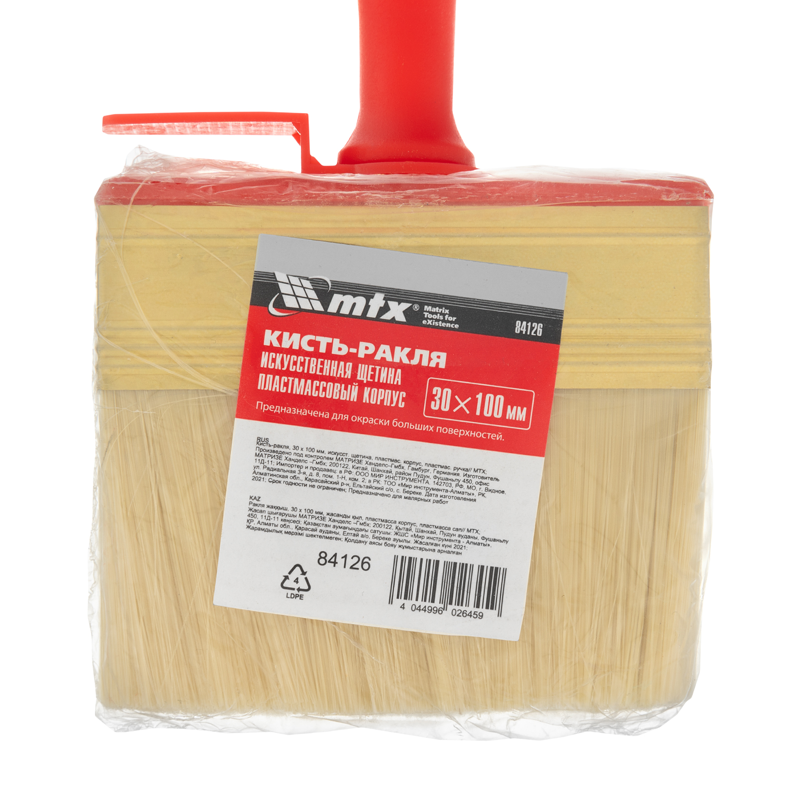 Кисть-ракля MTX 84126 толщиной 30 мм и шириной 100 мм, с искусственной щетиной, пластмассовыми корпусом и ручкой, используется для малярных работ на участках большой площади, поэтому удобна для обработки стен, потолков и фасадов. Подходит для работы с ЛКМ на водной основе, поскольку искусственная щетина не деформируется и сохраняет упругость при контакте с ними.