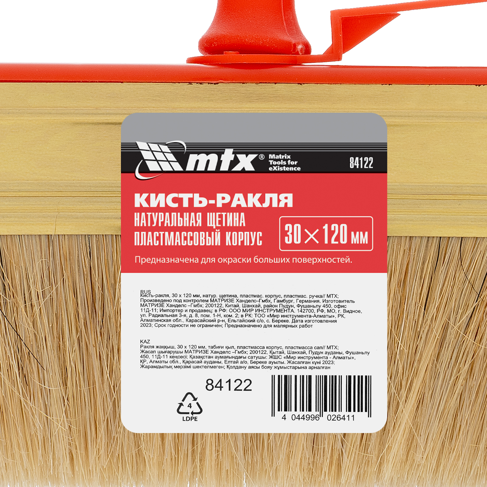 Кисть-ракля MTX 84122 толщиной 30 мм и шириной 120 мм, с натуральной щетиной, пластмассовыми корпусом и ручкой, используется для малярных работ на участках большой площади, поэтому удобна для обработки стен, потолков и фасадов. Натуральная щетина устойчива к химическому воздействию, поэтому не деформируется и сохраняет упругость при работе с ЛКМ на водной основе, грунтовками, масляными красками и клеящими составами.