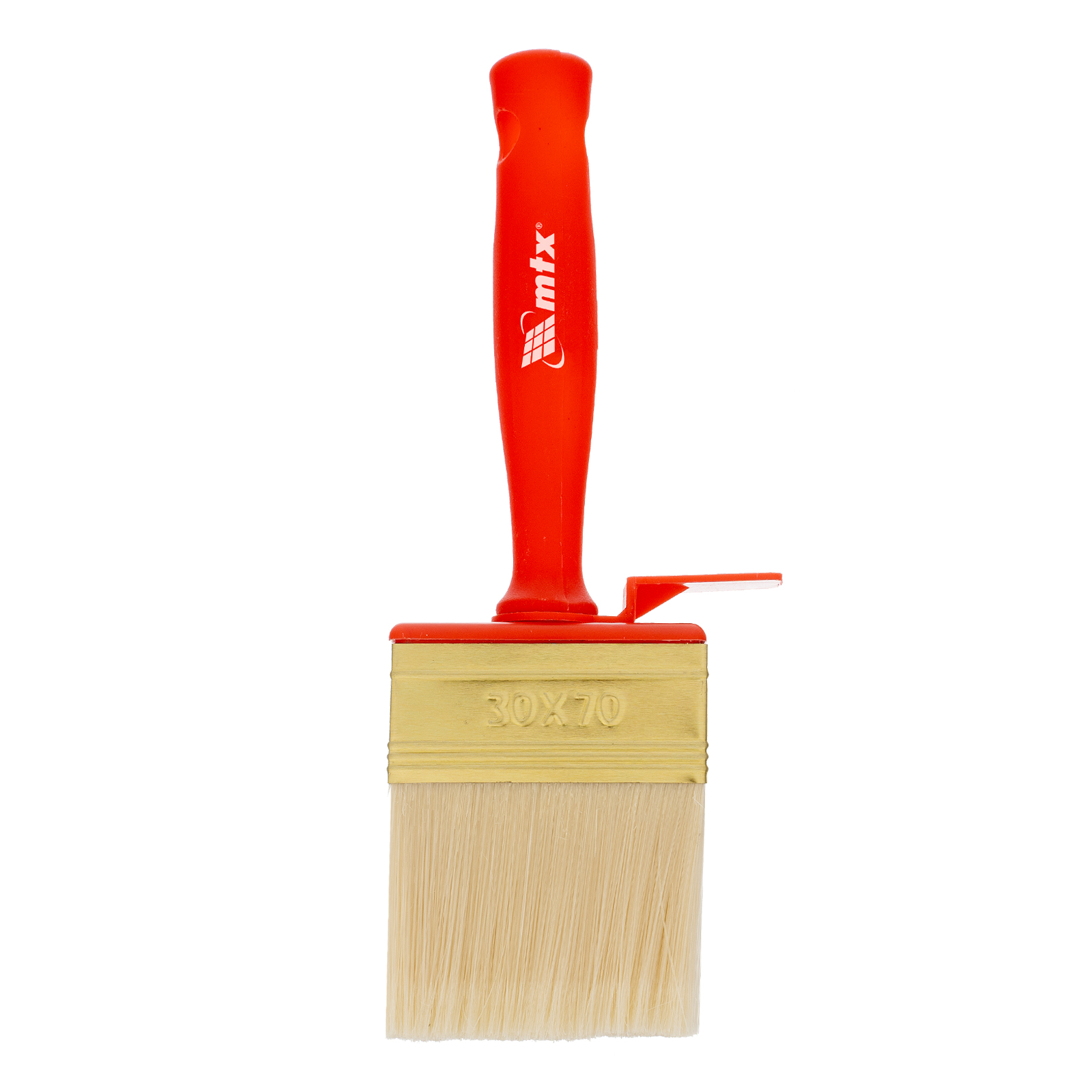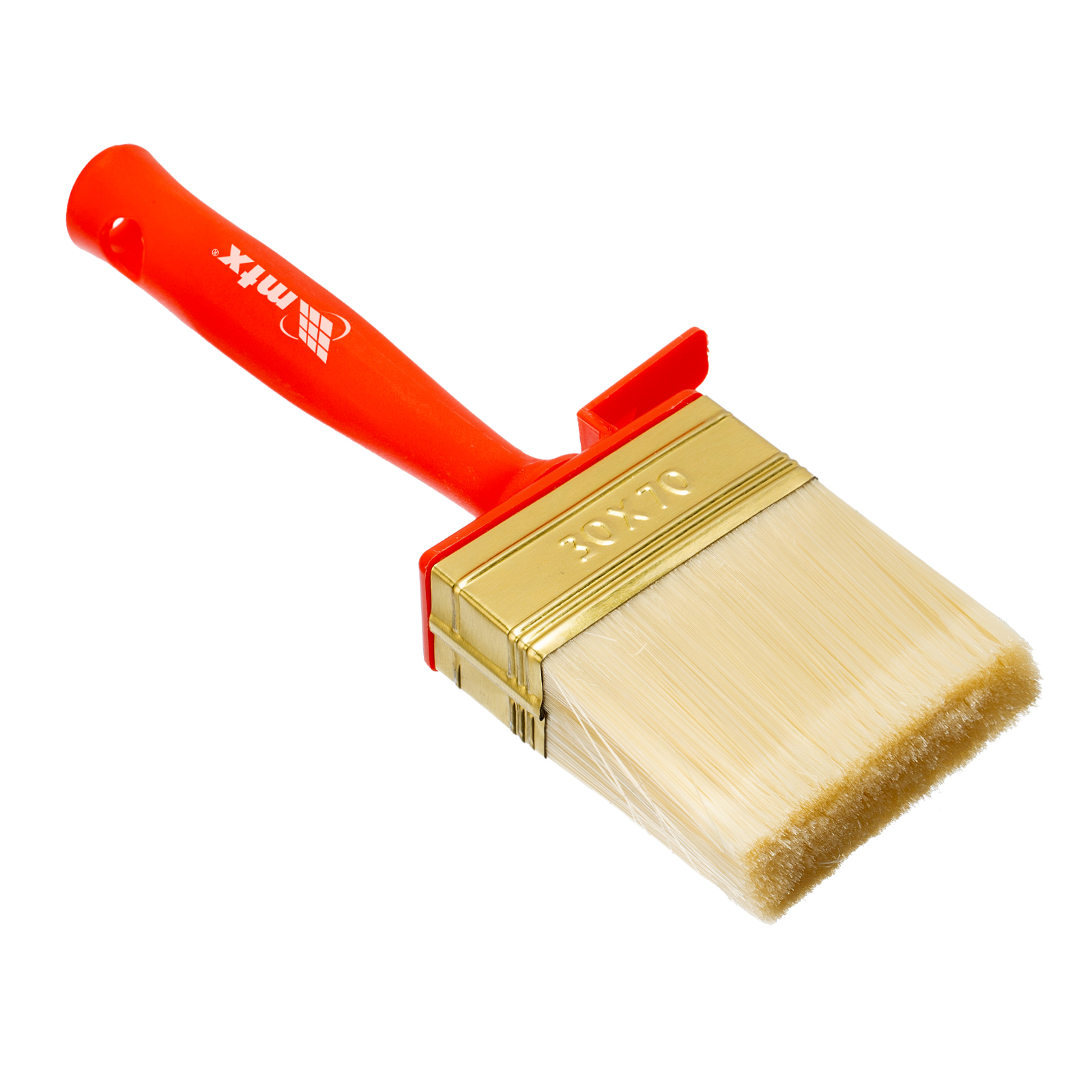 Кисть-ракля MTX 84125 толщиной 30 мм и шириной 70 мм, с искусственной щетиной, пластмассовыми корпусом и ручкой, используется для малярных работ на участках большой площади, поэтому удобна для обработки стен, потолков и фасадов. Подходит для работы с ЛКМ на водной основе, поскольку искусственная щетина не деформируется и сохраняет упругость при контакте с ними.