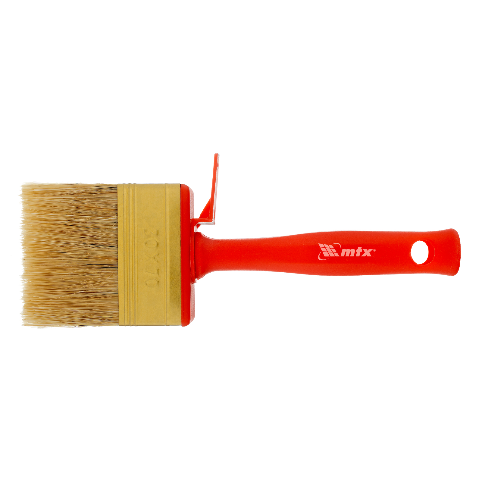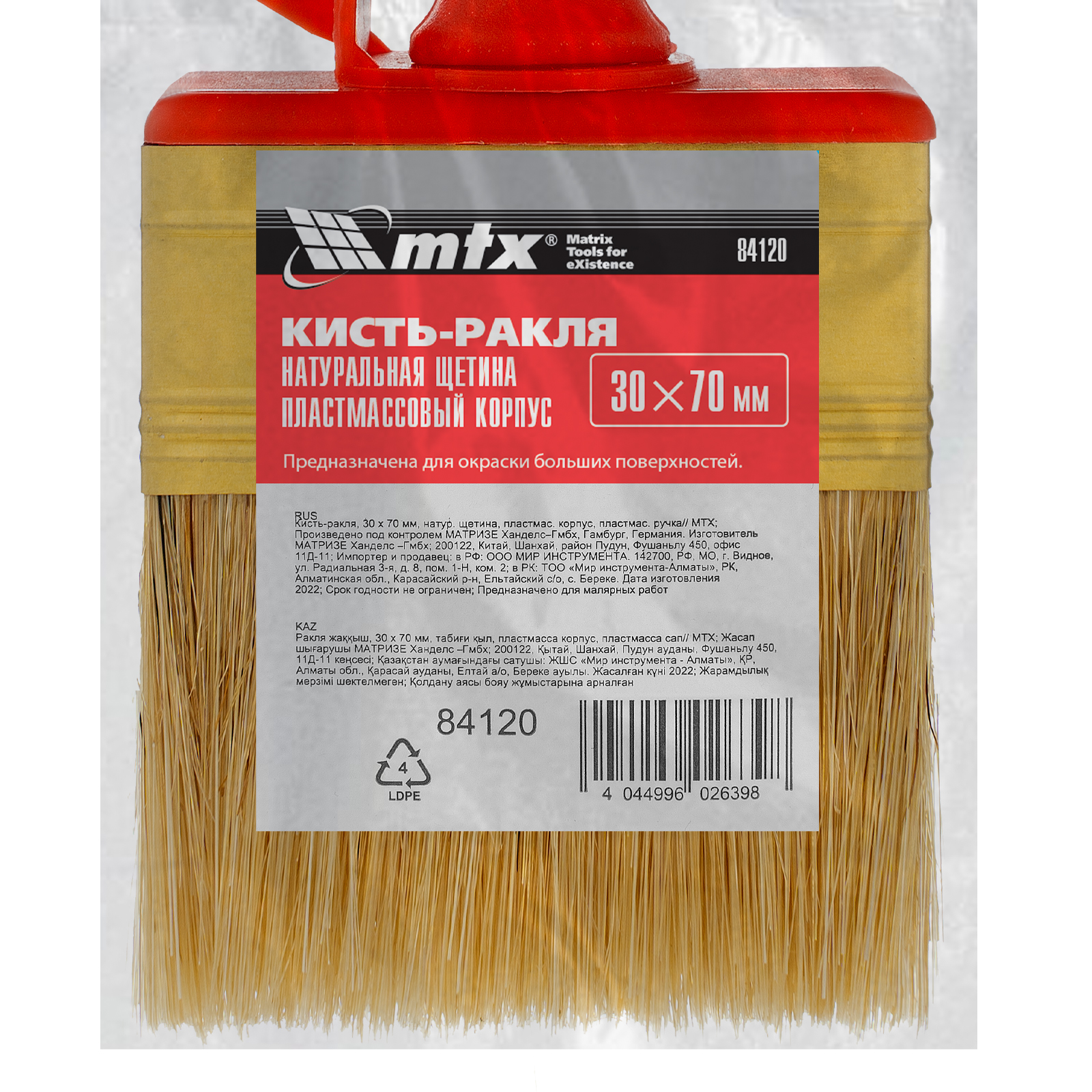 Кисть-ракля MTX 84120 толщиной 30 мм и шириной 70 мм, с натуральной щетиной, пластмассовыми корпусом и ручкой, используется для малярных работ на участках большой площади, поэтому удобна для обработки стен, потолков и фасадов. Натуральная щетина устойчива к химическому воздействию, поэтому не деформируется и сохраняет упругость при работе с ЛКМ на водной основе, грунтовками, масляными красками и клеящими составами.