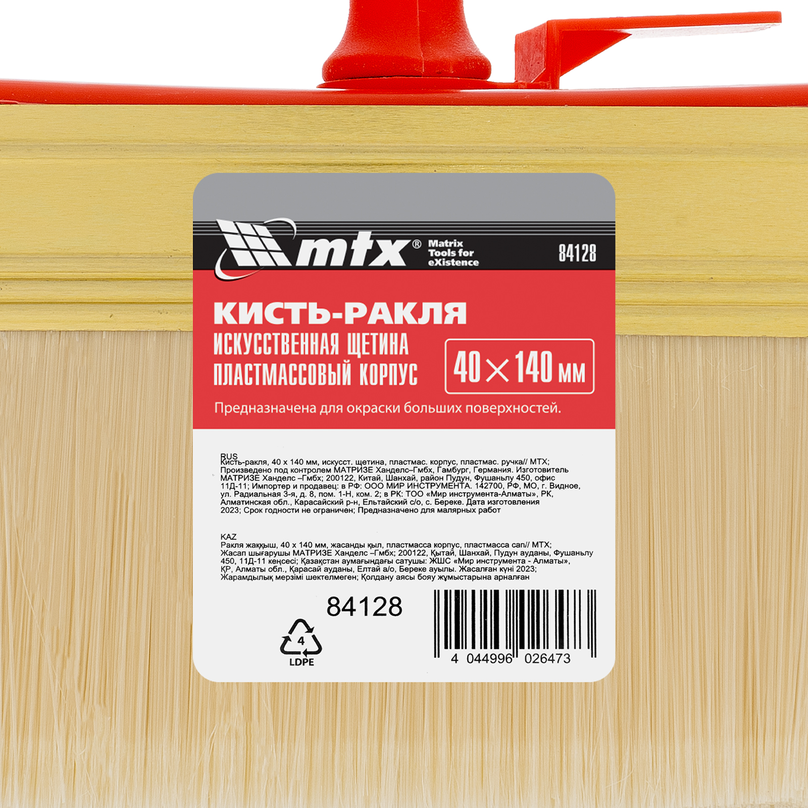 Кисть-ракля MTX 84128 толщиной 40 мм и шириной 140 мм, с искусственной щетиной, пластмассовыми корпусом и ручкой, используется для малярных работ на участках большой площади, поэтому удобна для обработки стен, потолков и фасадов. Подходит для работы с ЛКМ на водной основе, поскольку искусственная щетина не деформируется и сохраняет упругость при контакте с ними.