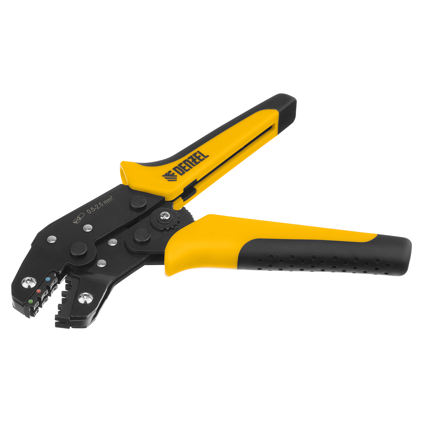 Клещи Denzel 17747 предназначены для обжима изолированных кольцевых наконечников НКИ и вилочных НВИ, разъемов плоских РПИ, гильз соединительных ГСИ сечением 0,5-2,5 мм². Инструмент пригодится частным и профессиональным мастерам при проведении электромонтажных работ.