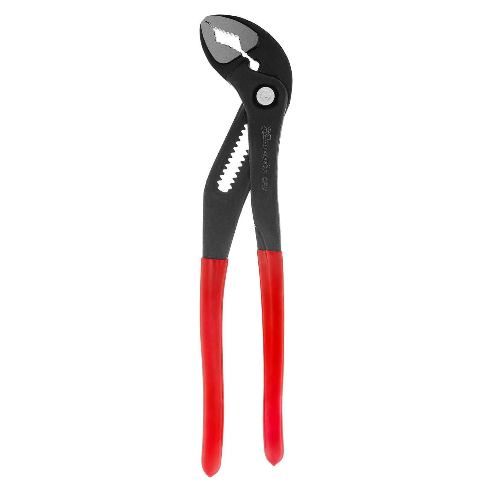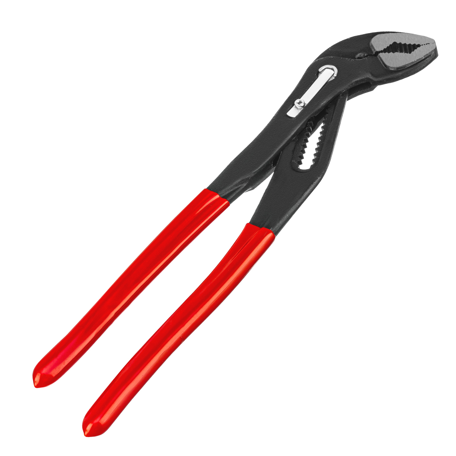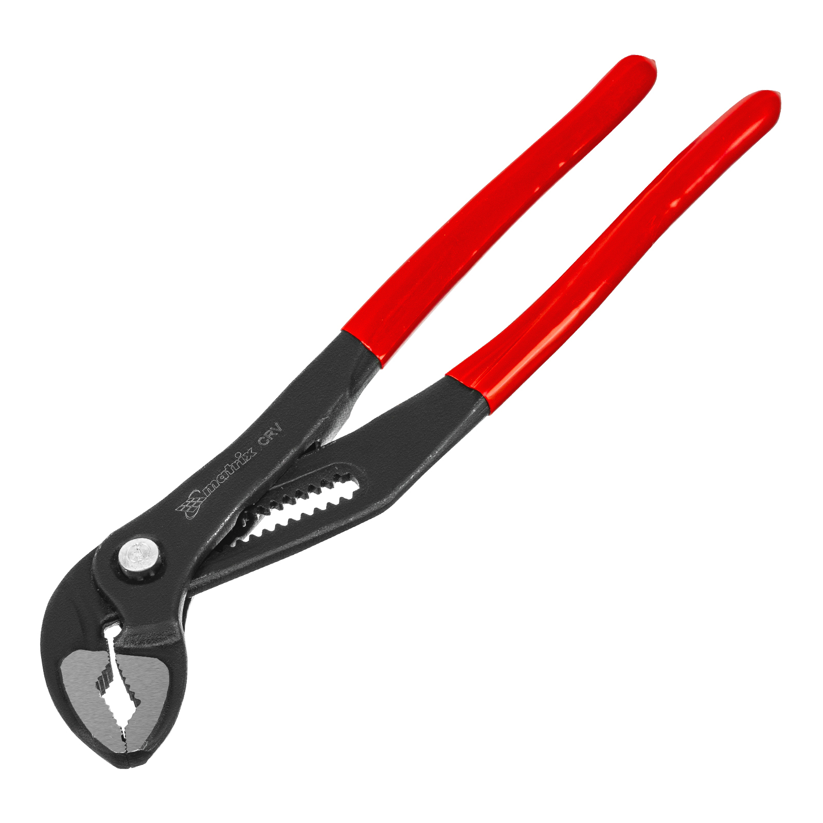 Переставные клещи Matrix 17927 длиной 300 мм, выполненные из хромованадиевой стали, с кнопочным механизмом и обливными рукоятками, используются для проведения монтажных и слесарных работ. Универсальный инструмент заменяет ключи различных размеров и применяется для фиксации заготовок, откручивания гаек, зажима и удержания труб диаметром до 64 мм.