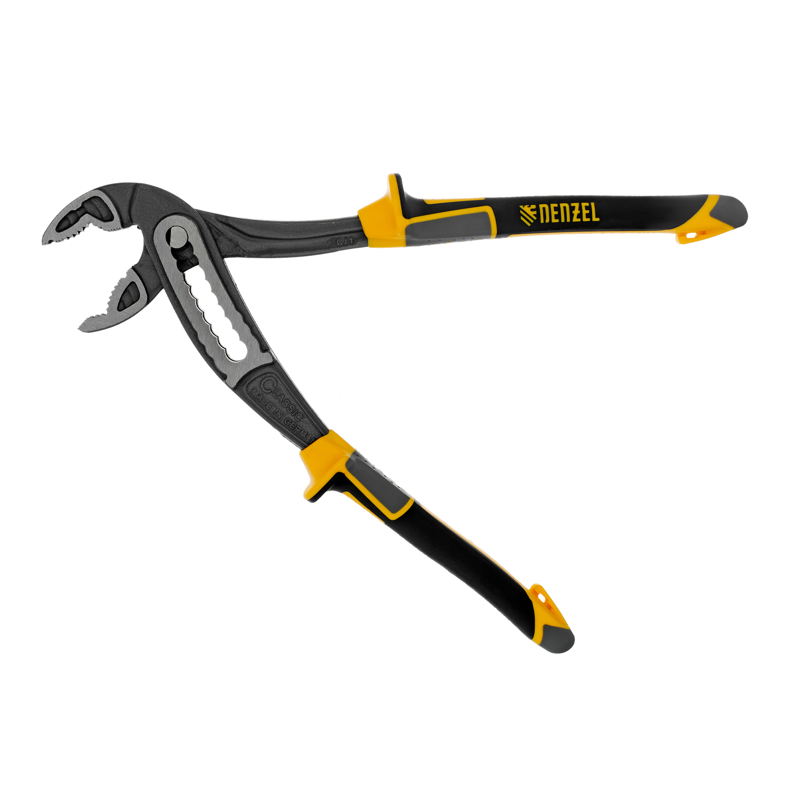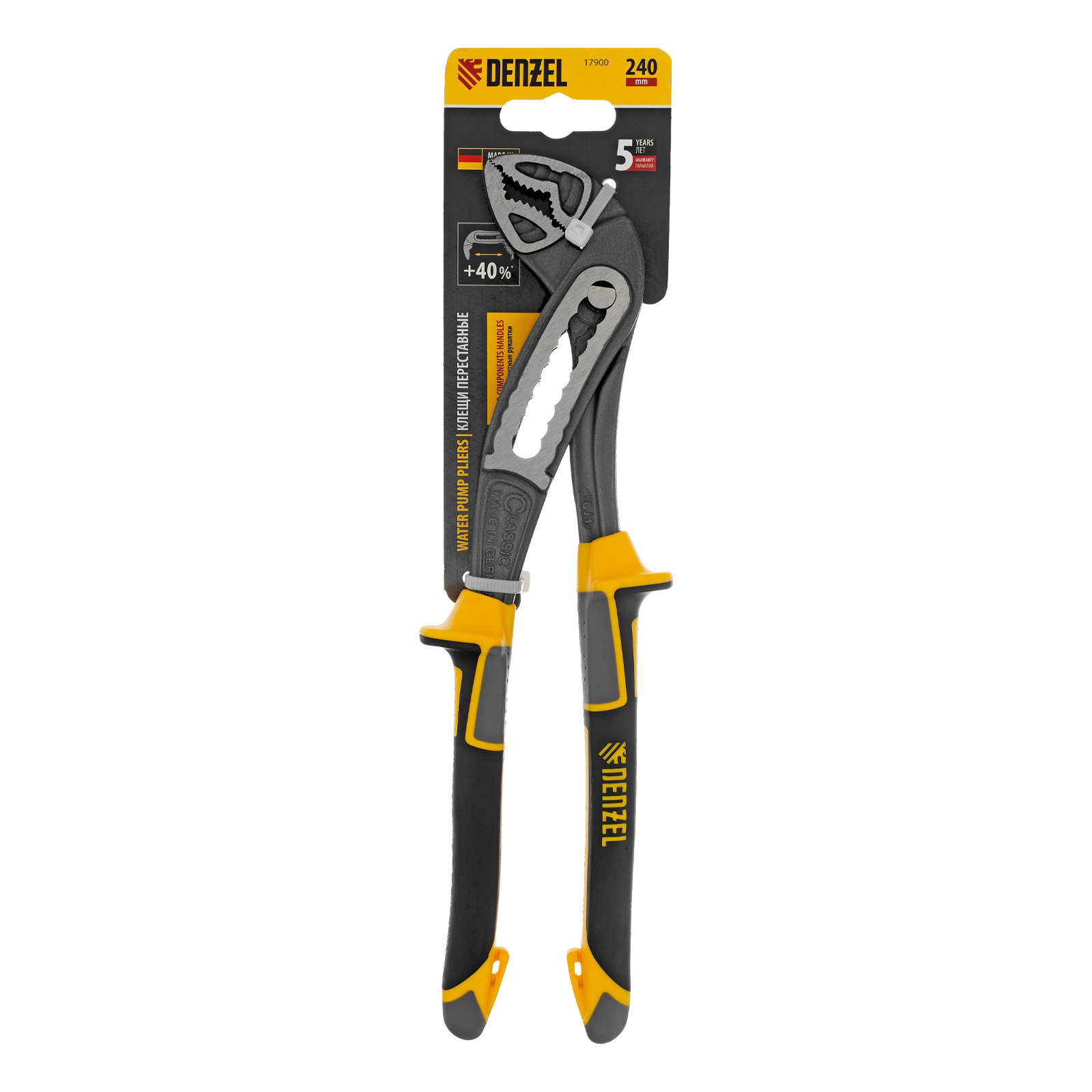 Переставные клещи Denzel 17900 длиной 240 мм, с трехкомпонентными рукоятками, предназначены для фиксации и вращения деталей и заготовок различной формы. Подходят для захвата фитингов, труб, крепежных элементов. Инструмент используется при проведении ремонтных, монтажных, сантехнических работ.