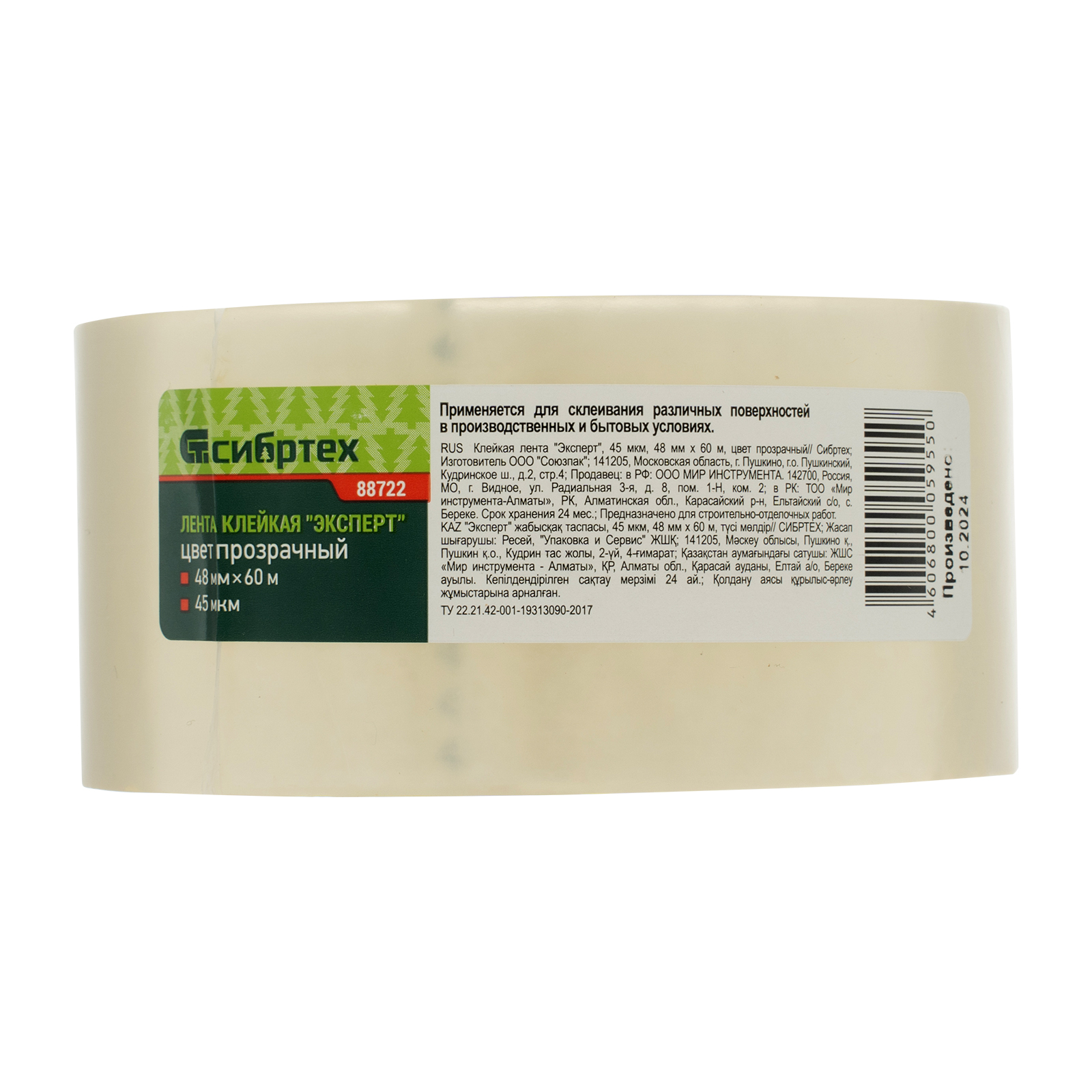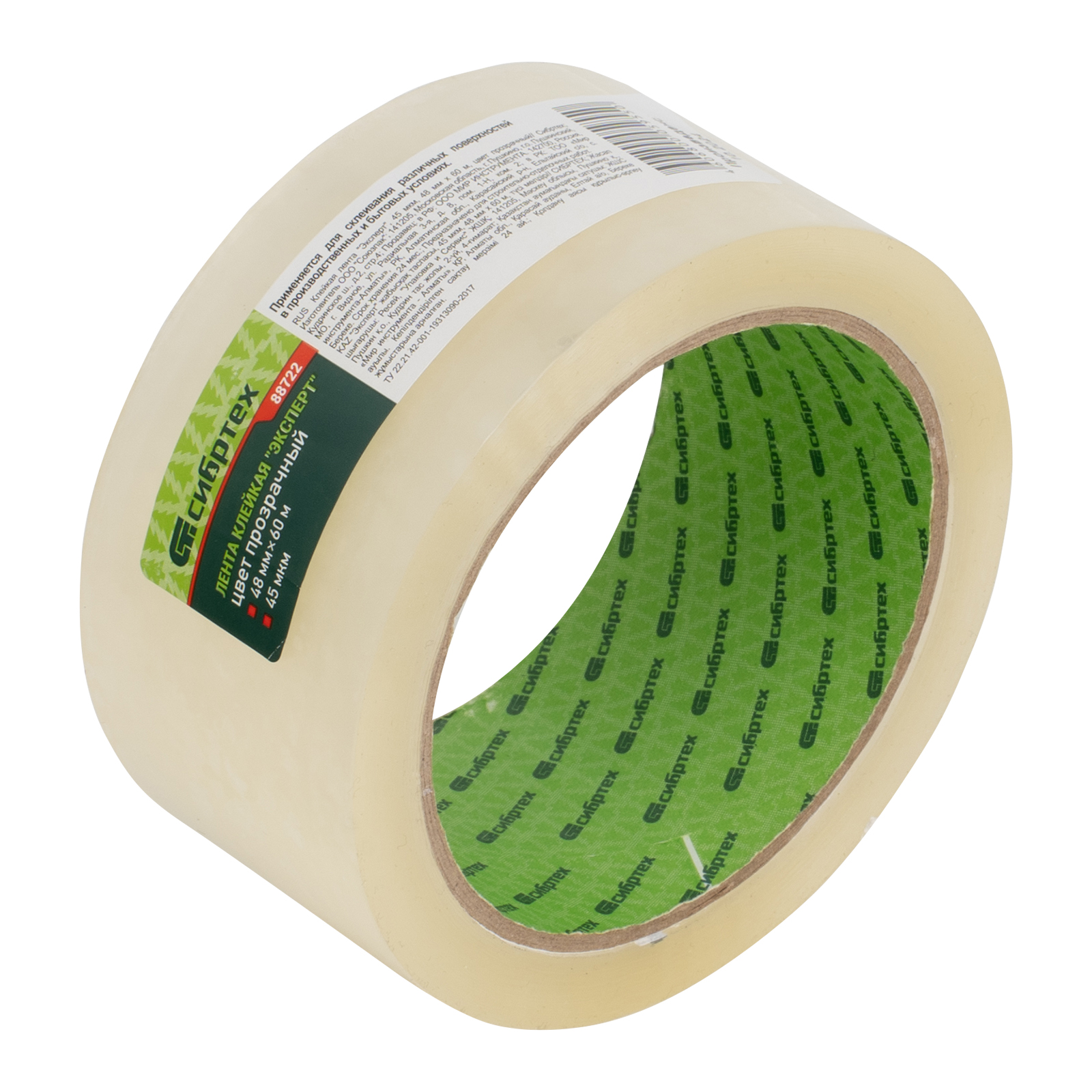 Клейкая лента Сибртех «Эксперт» 88722 толщиной 45 мкм, длиной намотки 60 м и шириной 48 мм, прозрачного цвета, пригодится в быту, цеху, на строительной площадке для упаковки коробок для последующей транспортировки. Высокие адгезионные характеристики обеспечивают надежное сцепление ленты с материалами, в том числе с шероховатым картоном.