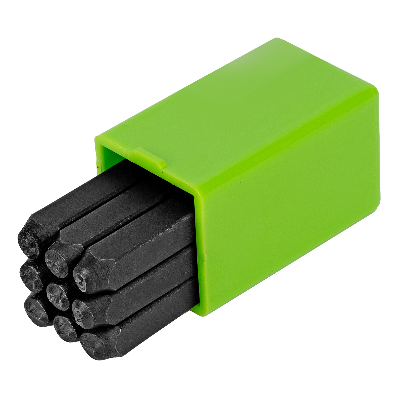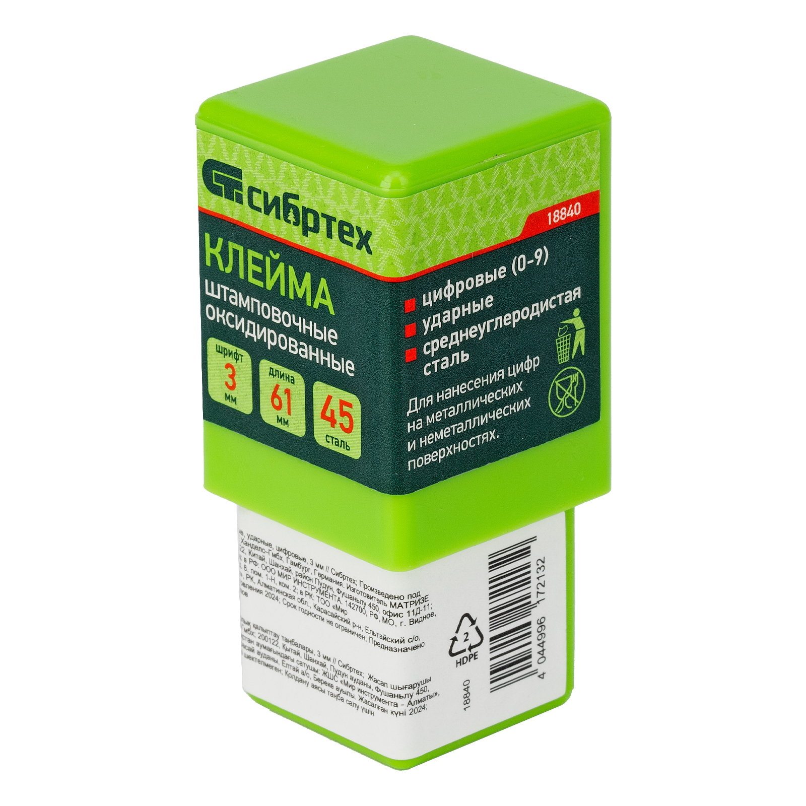 Штамповочные клейма Сибртех 18840 с размером шрифта 3 мм используются для нанесения цифровой маркировки на изделия из металла и других материалов методом ударного воздействия. Изделия обработаны на станках с числовым программным управлением, поэтому отличаются точностью и высокой четкостью получаемых цифр.