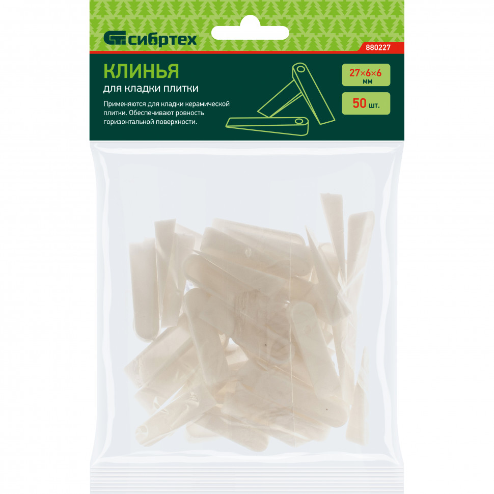 Клинья Сибртех 880227 размером 27 х 6 х 6 мм, 50 шт. в упаковке, предназначены для выравнивания первого ряда плитки и корректировки толщины швов во время кладки. Клинья предотвращают смещение плитки в процессе застывания клея. Удобны для выкладывания нижнего ряда плитки на стене или на ступеньках.