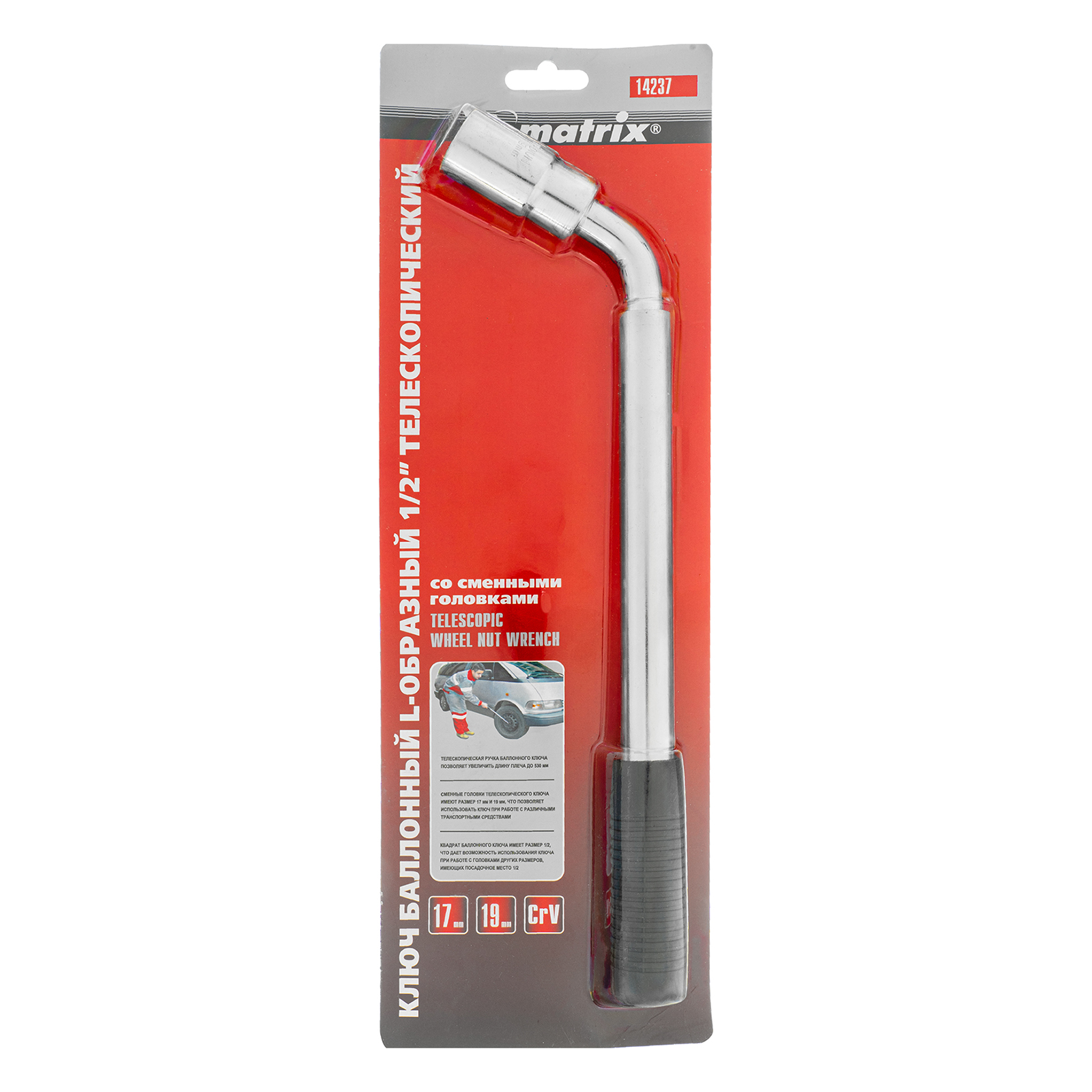 Телескопический Г-образный баллонный ключ Matrix 14237 с присоединительным размером 1/2" поставляется с двойной съемной торцевой головкой 17 х 19 мм и применяется для снятия и установки автомобильных колес. Г-образная форма облегчает работу с крепежом. Ключ будет полезен в гараже, на станции шиномонтажа или в автосервисе, а также поможет быстро заменить колесо в дороге.