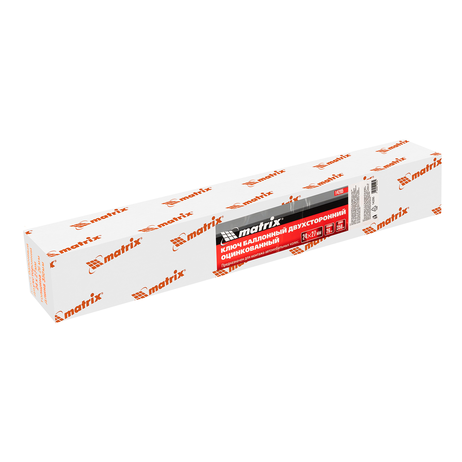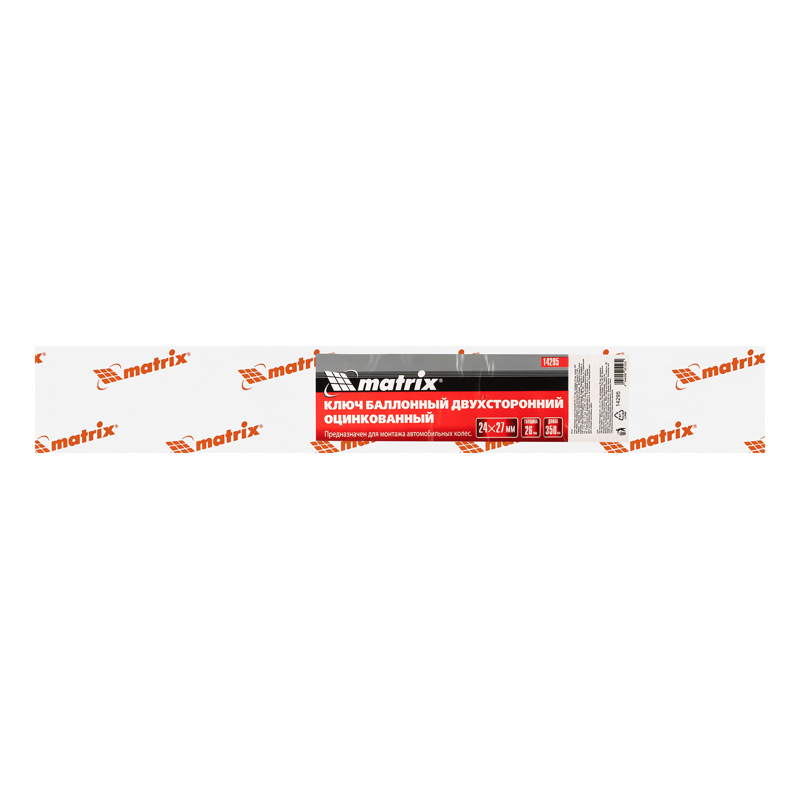 Двухсторонний баллонный ключ Matrix 14295, 24 х 27 мм, толщиной 26 мм и длиной 350 мм, используется для шиномонтажных работ на грузовом транспорте и автобусах. Две несъемные торцевые шестигранные головки подходят под крепеж 24 и 27 мм. Инструмент применяется на станциях техобслуживания.
