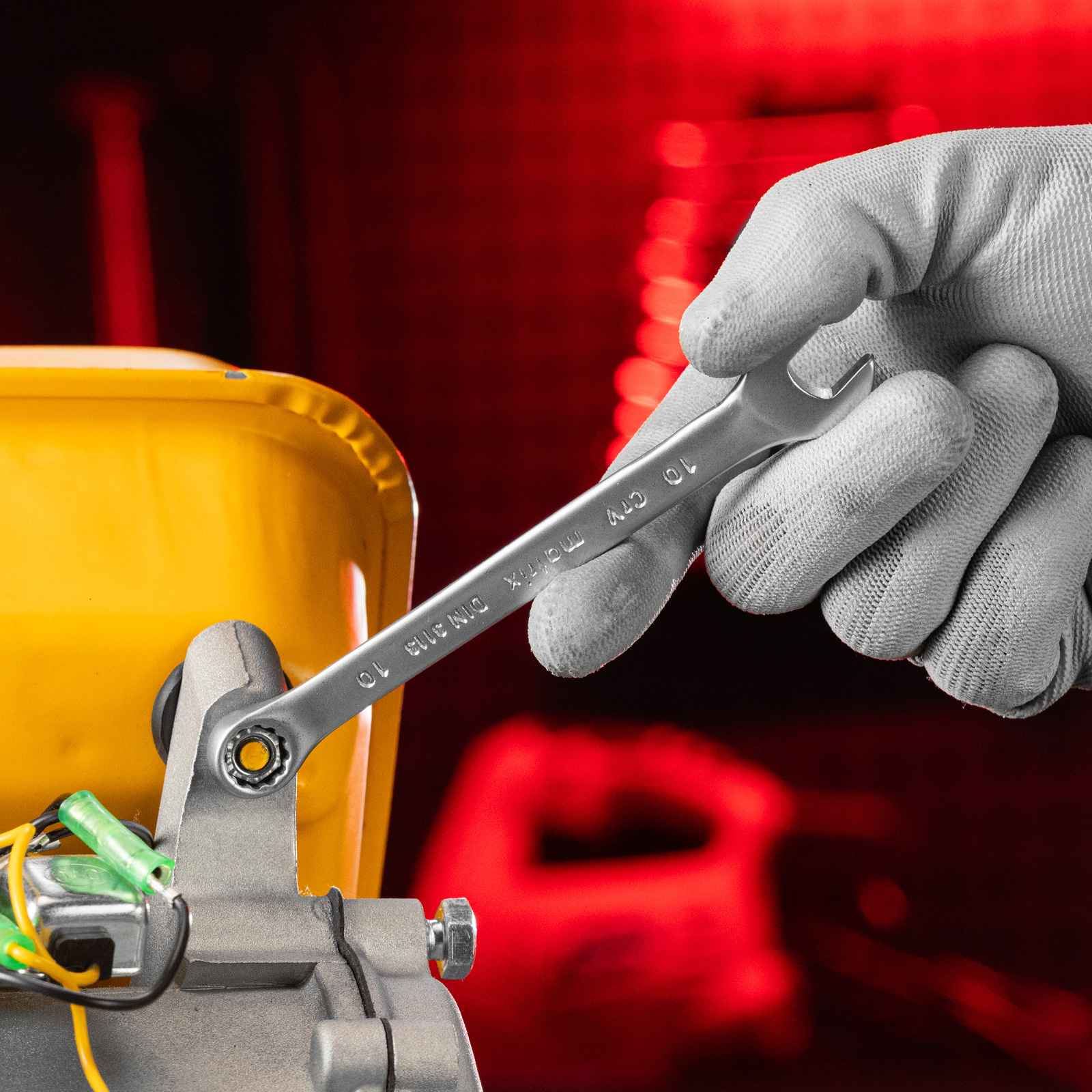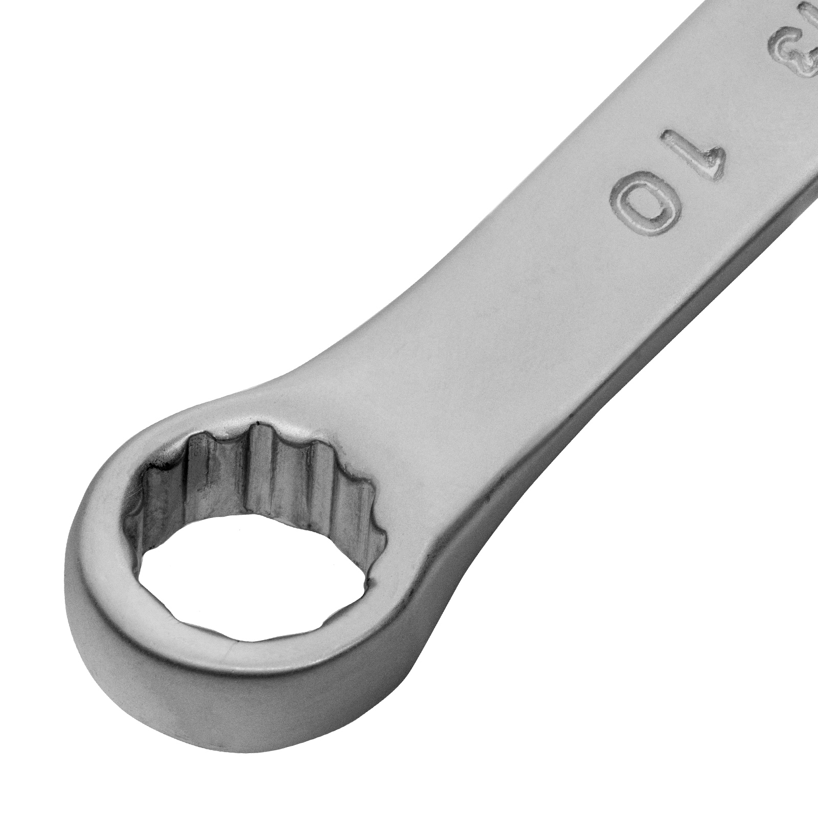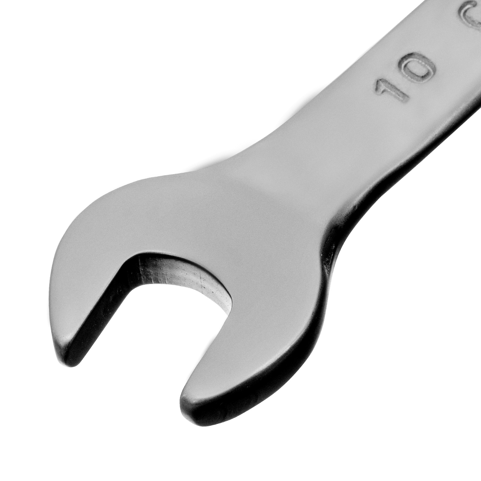 Комбинированный ключ Matrix 15106 размером 10 мм, из стали CrV, с покрытием «матовый хром», пригодится во время ремонтных работ дома или в гараже. С его помощью можно быстро монтировать и демонтировать крепежные элементы. Угол наклона кольцевого зева относительно плоскости инструмента составляет 15°, поэтому ключом удобно работать в труднодоступных местах.