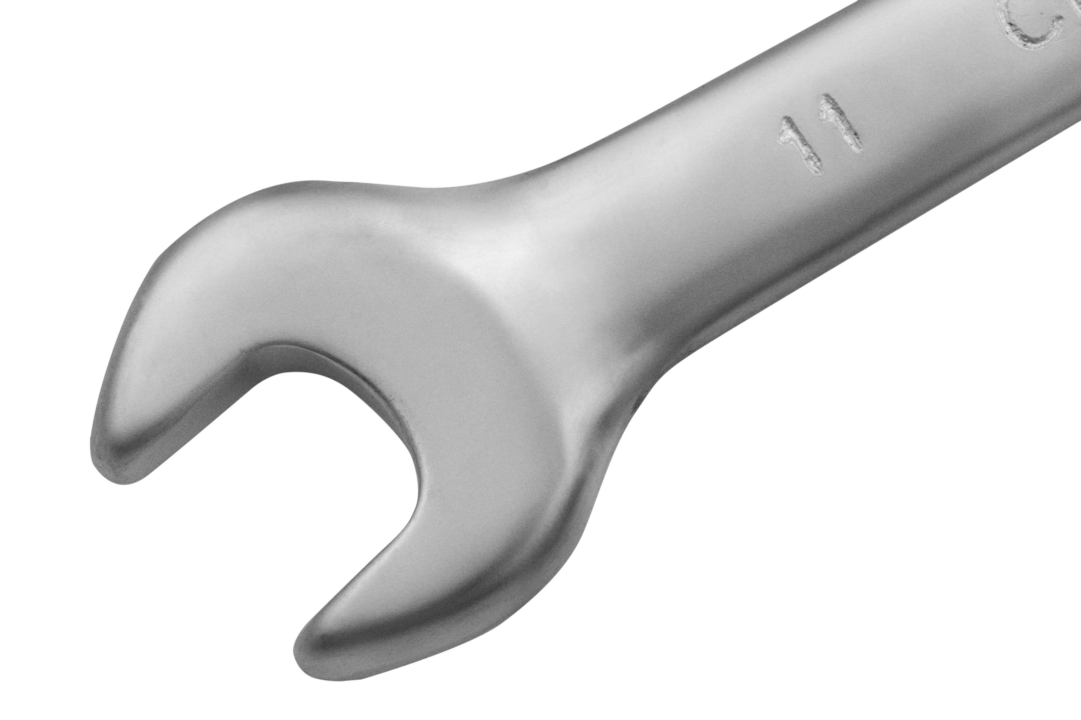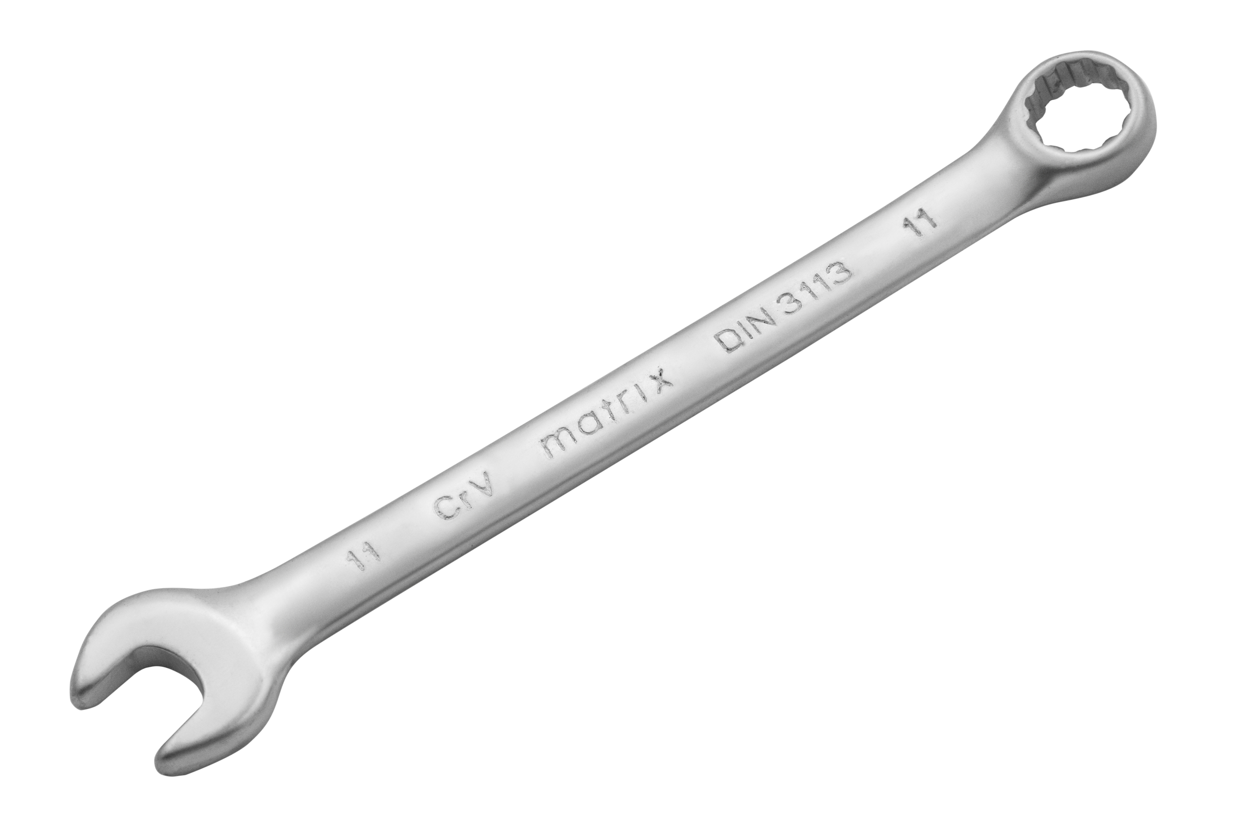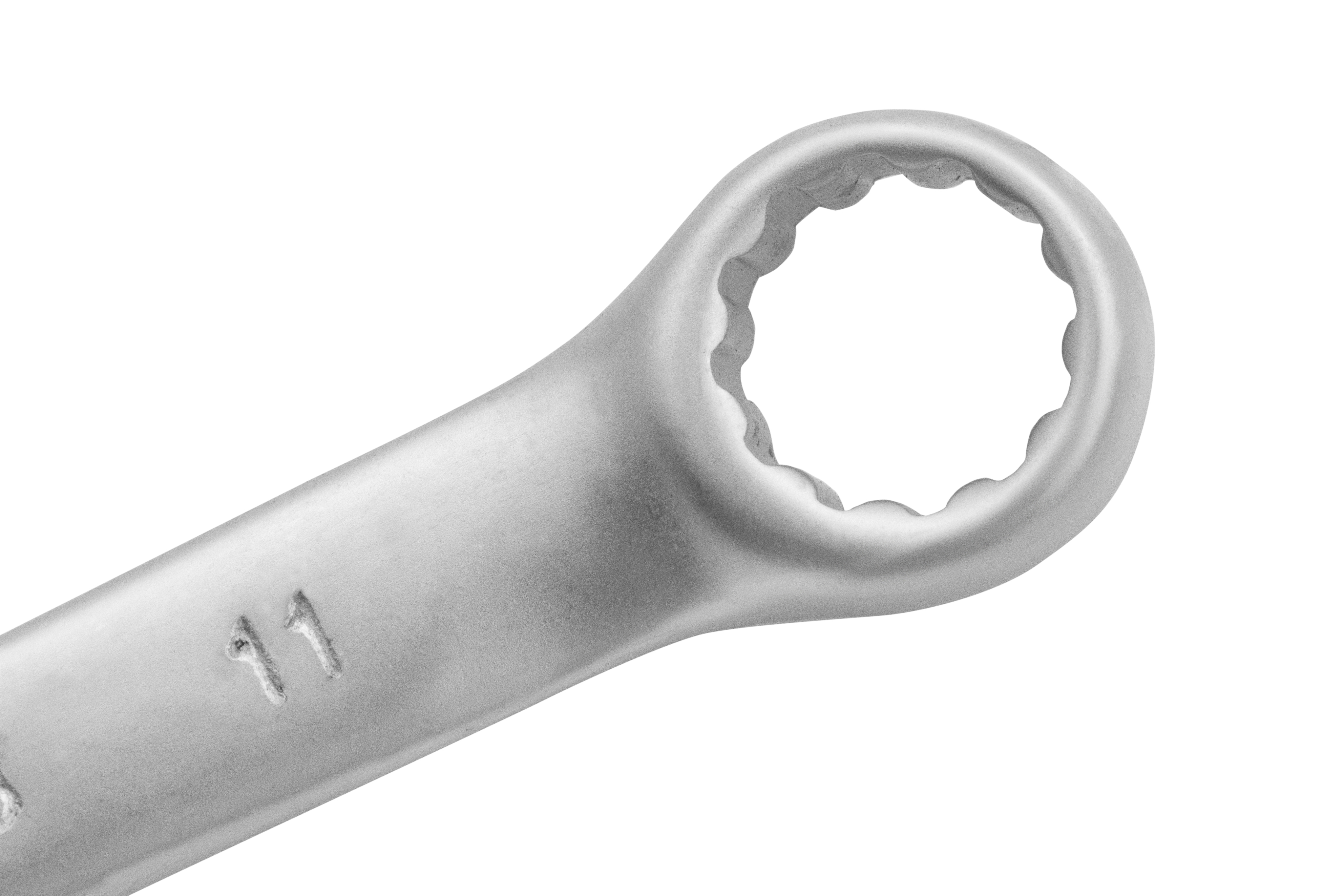 Комбинированный ключ Matrix 15107 размером 11 мм, из стали CrV, с покрытием «матовый хром», пригодится во время ремонтных работ дома или в гараже. С его помощью можно быстро монтировать и демонтировать крепежные элементы. Угол наклона кольцевого зева относительно плоскости инструмента составляет 15°, поэтому ключом удобно работать в труднодоступных местах.