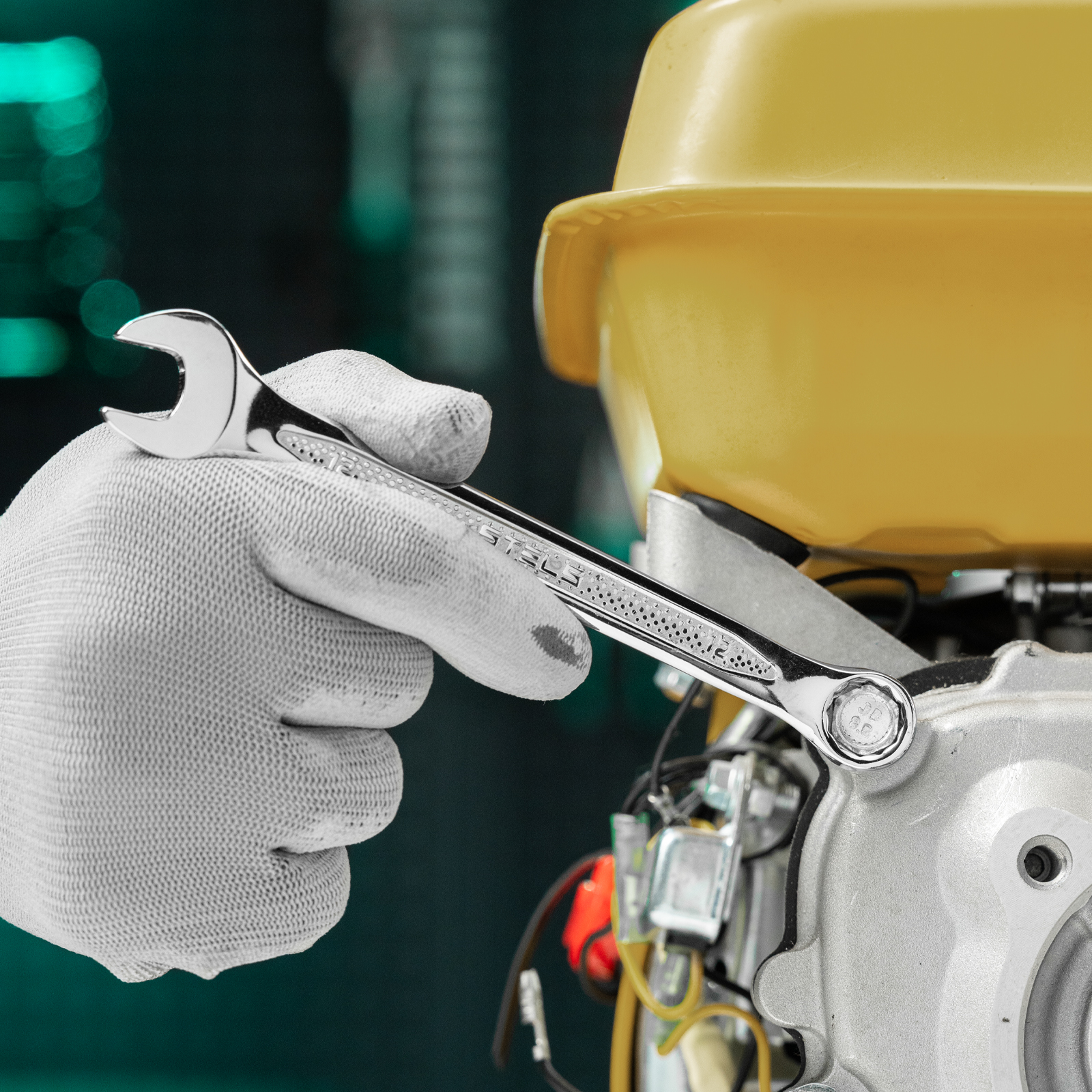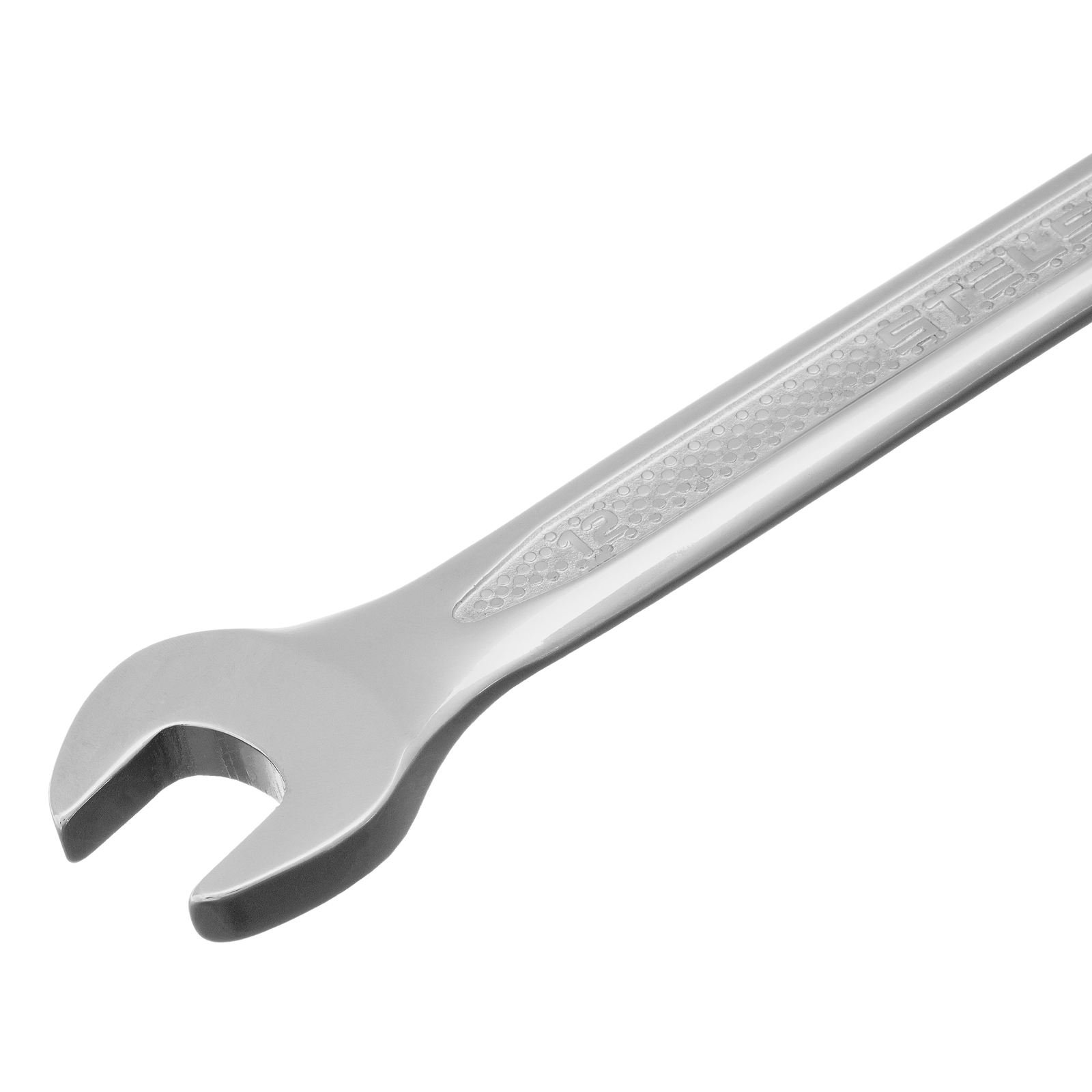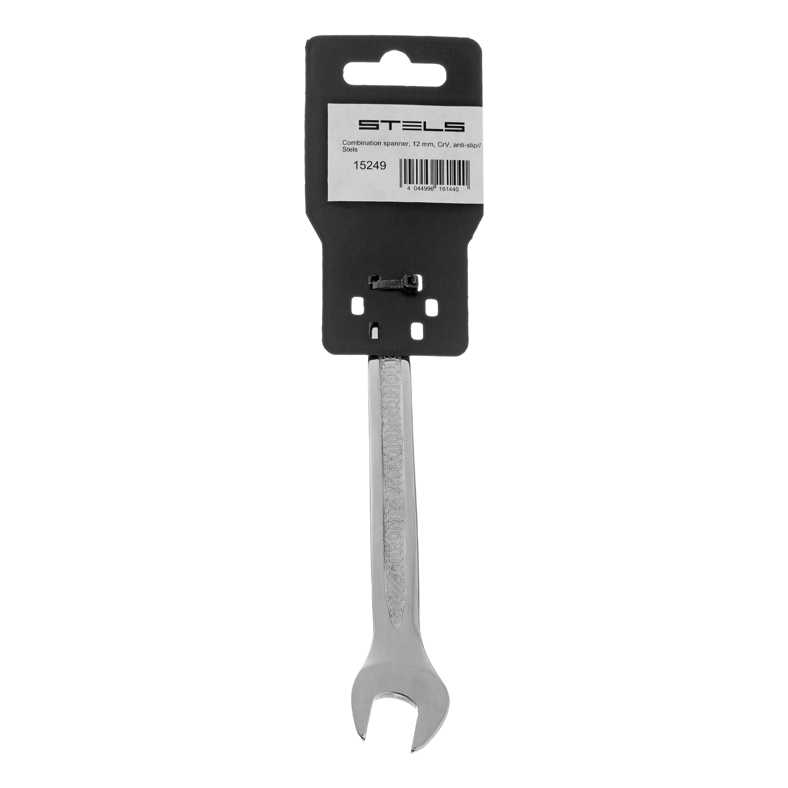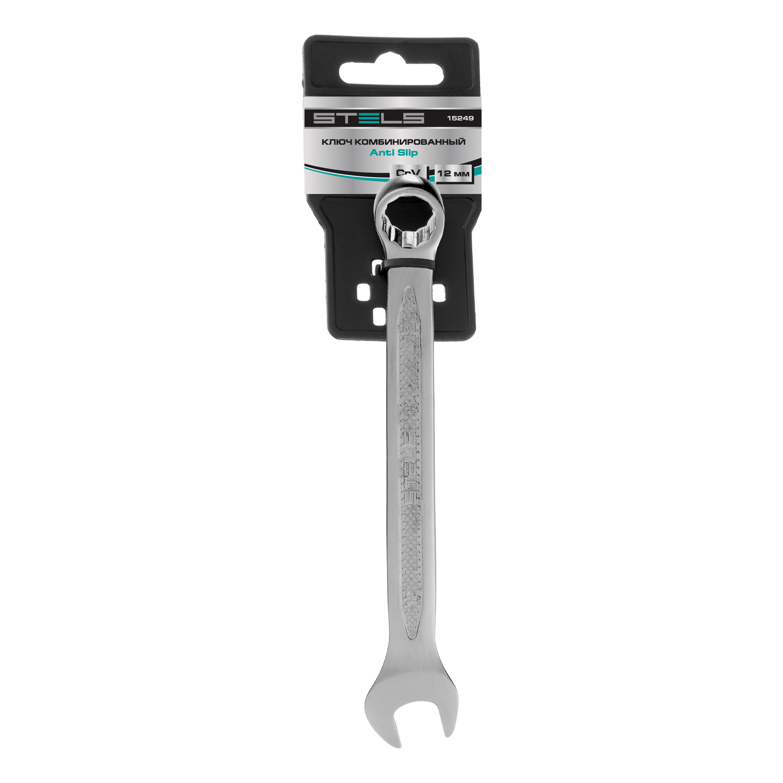 <p>Комбинированный ключ Stels 15249 из стали CrV, 12 мм, антислип, позволяет откручивать и закручивать резьбовые соединения. Универсален в применении, т.к. имеет кольцевую и рожковую головки. 12-гранный профиль накидного зева обеспечивает увеличенную площадь контакта с поверхностью крепежа, что минимизирует вероятность его деформации. Ключ будет полезен в автомастерской, для монтажа и демонтажа оборудования, пригодится для работ по дому.</p><h2>Преимущества</h2><ul><li>Высокий показатель прочности — инструмент изготовлен из стали хромованадиевой группы, твердость рабочей части составляет 42-50 HRC.</li><li>Улучшенные антикоррозионные свойства и повышенная износостойкость благодаря хромированному покрытию.</li><li>Удобство при выполнении монтажных работ — кольцевой зев смещен на 15 градусов относительно тела ключа.</li><li>Надежный хват — благодаря рельефной поверхности ключ не скользит в руке.</li></ul>