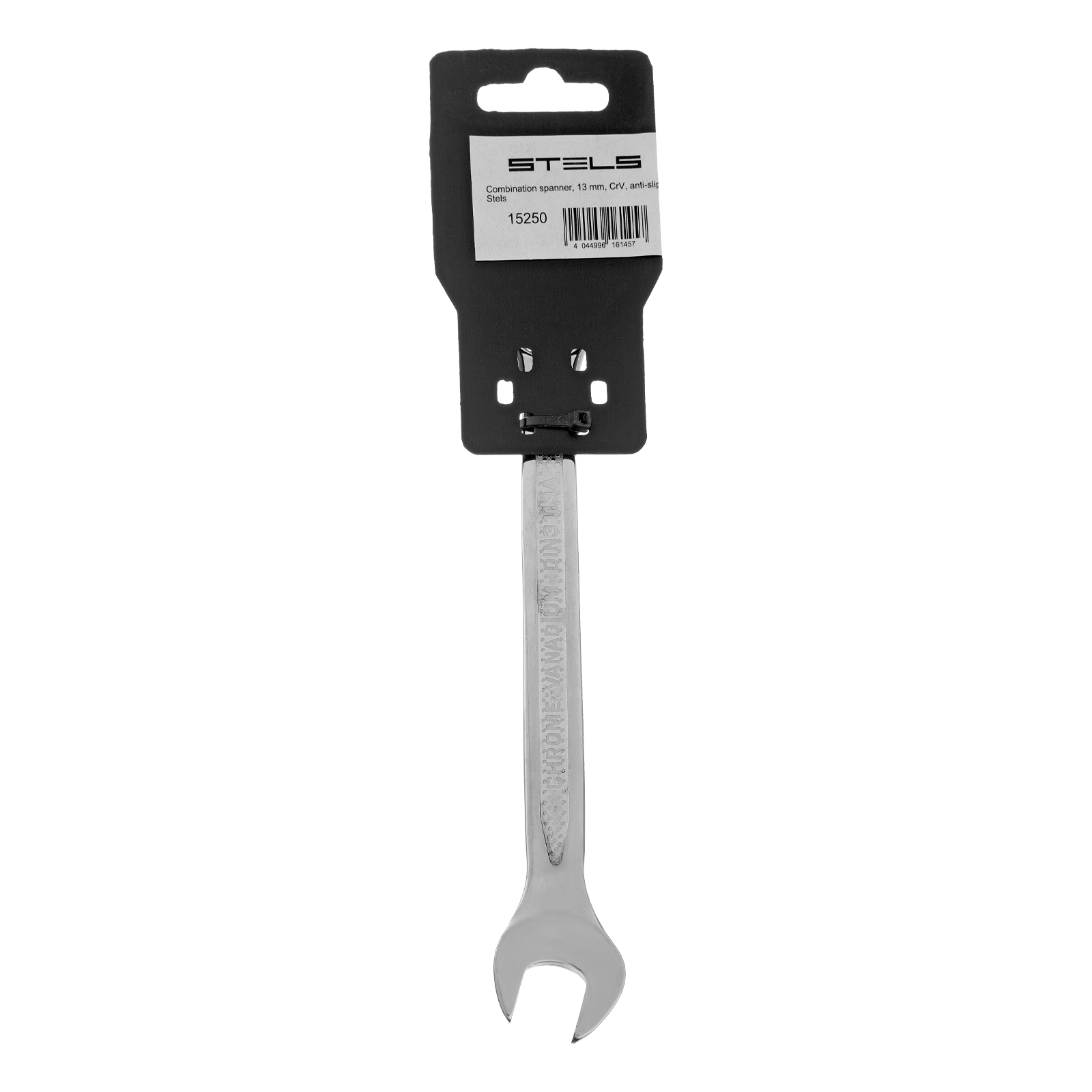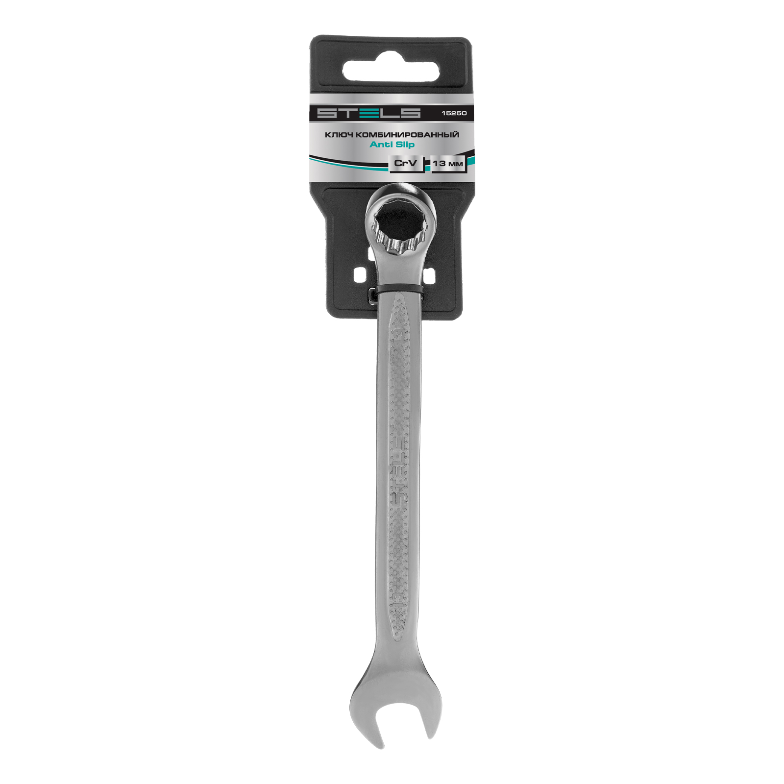 <p>Комбинированный ключ Stels 15250 из стали CrV, 13 мм, антислип, позволяет откручивать и закручивать резьбовые соединения. Универсален в применении, т.к. имеет кольцевую и рожковую головки. 12-гранный профиль накидного зева обеспечивает увеличенную площадь контакта с поверхностью крепежа, что минимизирует вероятность его деформации. Ключ будет полезен в автомастерской, для монтажа и демонтажа оборудования, пригодится для работ по дому.</p><h2>Преимущества</h2><ul><li>Высокий показатель прочности — инструмент изготовлен из стали хромованадиевой группы, твердость рабочей части составляет 42-50 HRC.</li><li>Улучшенные антикоррозионные свойства и повышенная износостойкость благодаря хромированному покрытию.</li><li>Удобство при выполнении монтажных работ — кольцевой зев смещен на 15 градусов относительно тела ключа.</li><li>Надежный хват — благодаря рельефной поверхности ключ не скользит в руке.</li></ul>