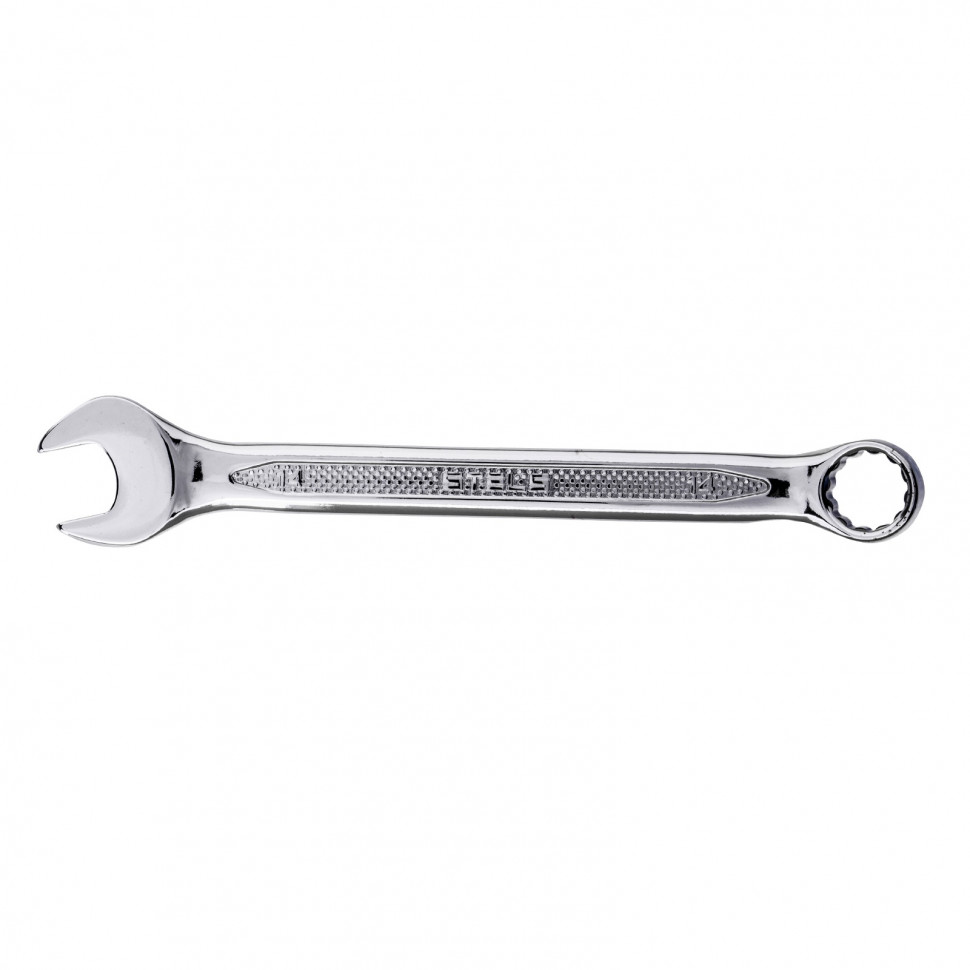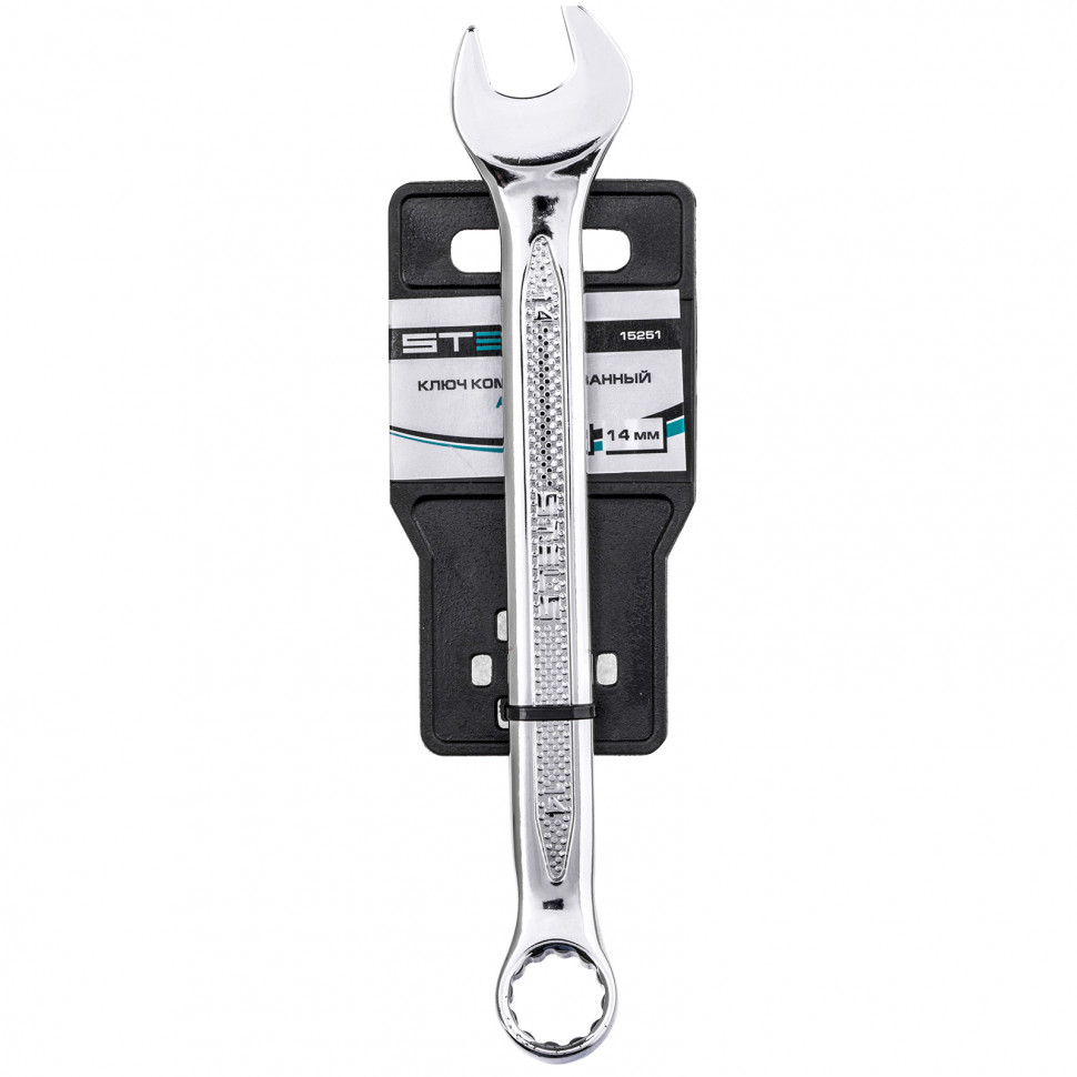 <p>Комбинированный ключ Stels 15251 из стали CrV, 14 мм, антислип, позволяет откручивать и закручивать резьбовые соединения. Универсален в применении, т.к. имеет кольцевую и рожковую головки. 12-гранный профиль накидного зева обеспечивает увеличенную площадь контакта с поверхностью крепежа, что минимизирует вероятность его деформации. Ключ будет полезен в автомастерской, для монтажа и демонтажа оборудования, пригодится для работ по дому.</p><h2>Преимущества</h2><ul><li>Высокий показатель прочности — инструмент изготовлен из стали хромованадиевой группы, твердость рабочей части составляет 42-50 HRC.</li><li>Улучшенные антикоррозионные свойства и повышенная износостойкость благодаря хромированному покрытию.</li><li>Удобство при выполнении монтажных работ — кольцевой зев смещен на 15 градусов относительно тела ключа.</li><li>Надежный хват — благодаря рельефной поверхности ключ не скользит в руке.</li></ul>