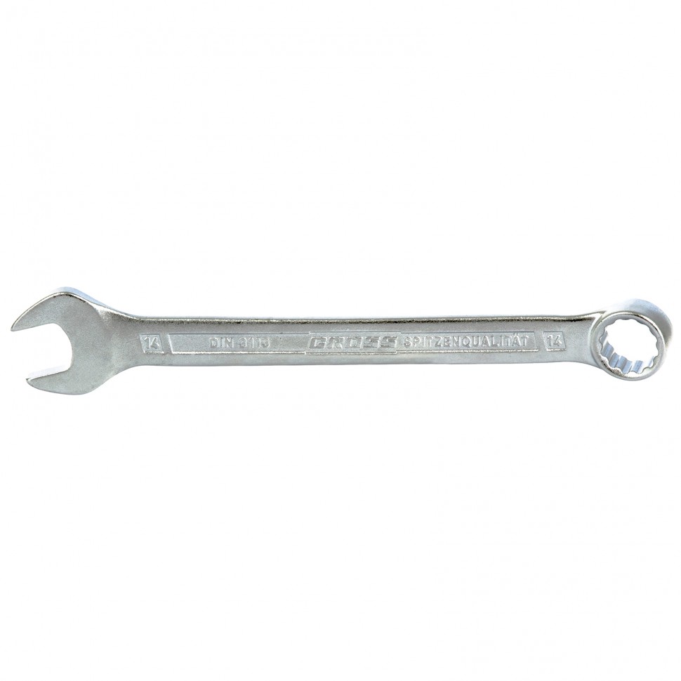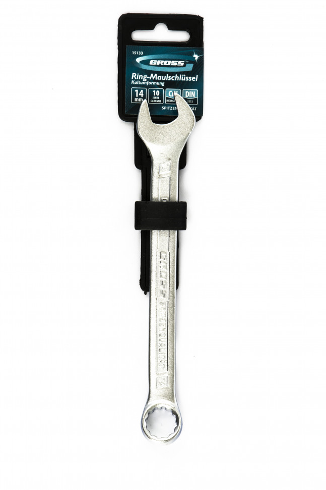 <p>Комбинированный ключ Gross 15133, 14 мм, холодный штамп, — ручной слесарно-монтажный инструмент из стали CrV, позволяющий закручивать и откручивать гаечные и болтовые соединения. Кольцевой зев с 12-гранной рабочей поверхностью крепко удерживает крепеж, не повреждая его. Ключ используется при ремонте автомобилей, сборке техники, будет полезен и в быту.</p><h2>Преимущества</h2><ul><li>Прочность и надежность — инструмент произведен методом холодной штамповки из высококачественной стали CrV-группы.</li><li>Устойчивость к механическим воздействиям — твердость материала рабочей части составляет 45-48 HRC.</li><li>Точность и эффективность работ — слегка изогнутая накидная рабочая часть смещена на 15 градусов относительно тела ключа.</li><li>Антикоррозийная стойкость — ключ защищен от ржавчины хромоникелевым покрытием.</li></ul>
