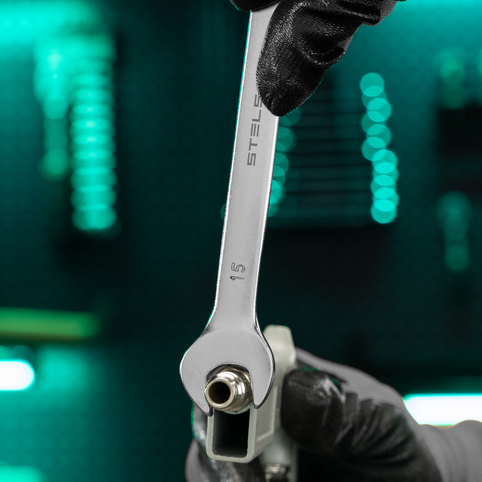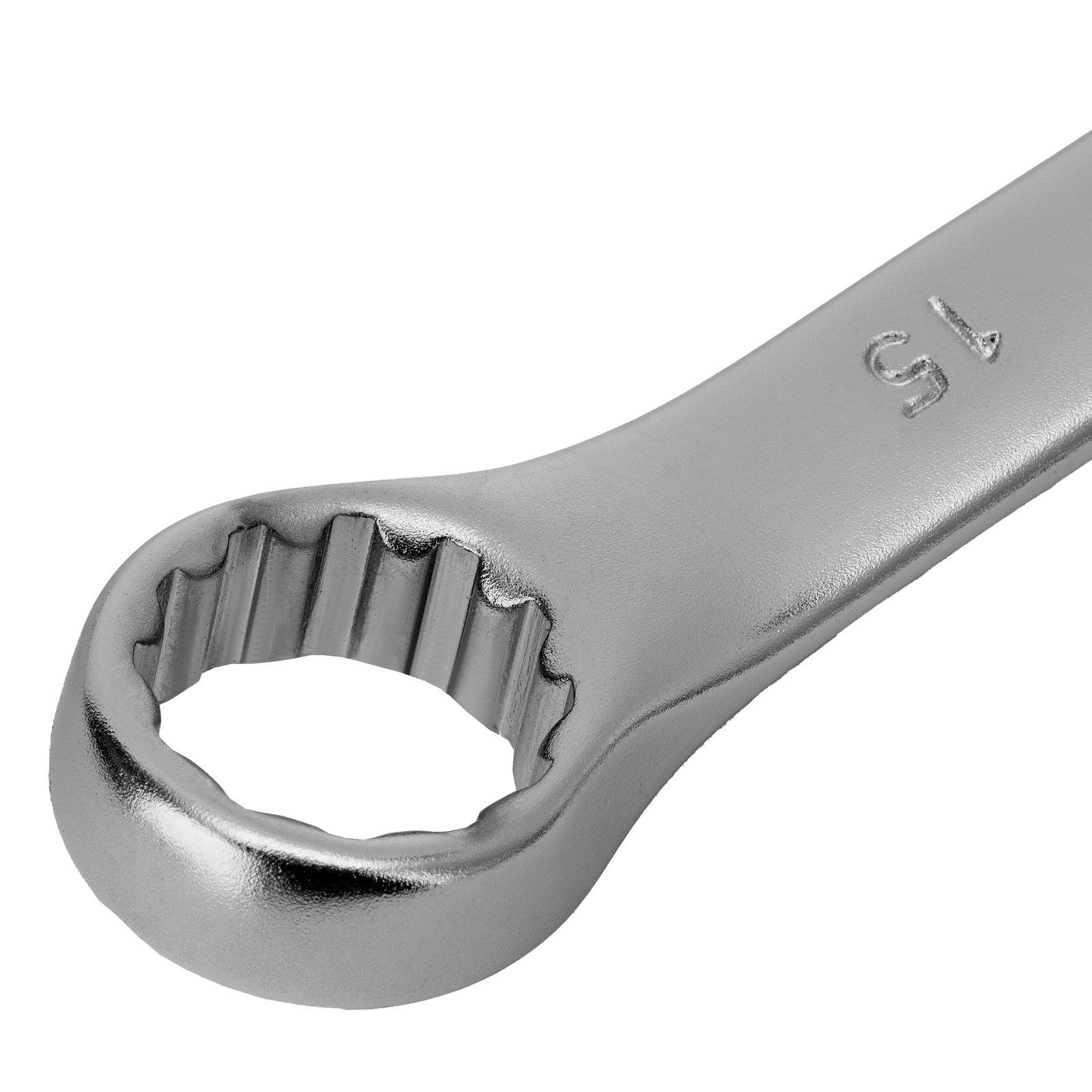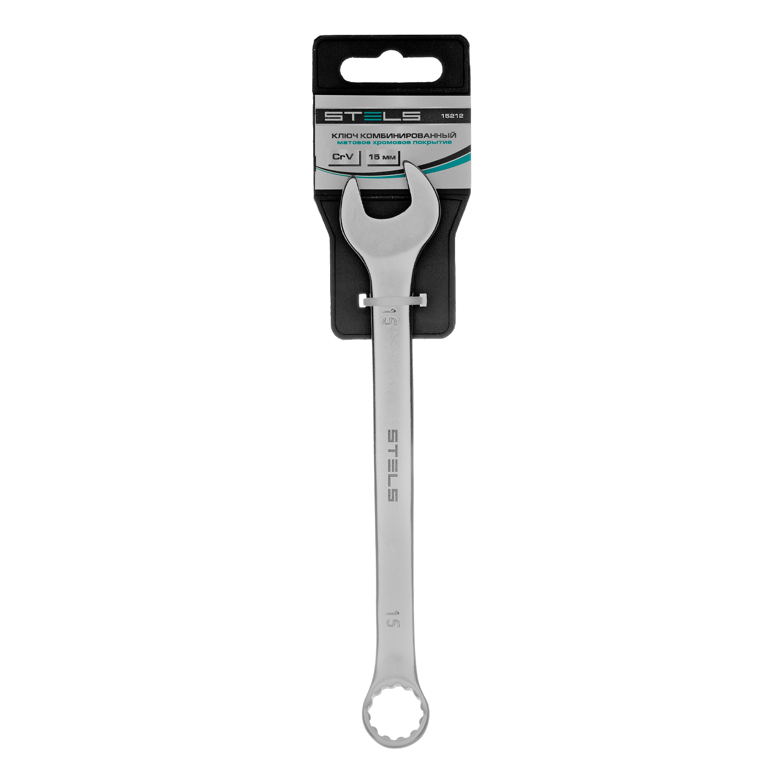 Комбинированный ключ Stels 15212 из стали CrV, 15 мм, покрытый матовым хромом, используется для закручивания и откручивания гаечных и болтовых соединений. Накидная головка имеет 12-гранную внутреннюю поверхность, что облегчает работу с крепежом и уменьшает опасность его повреждения. Ключ применяется в слесарных мастерских и автосервисах, а также будет полезен для решения бытовых задач.