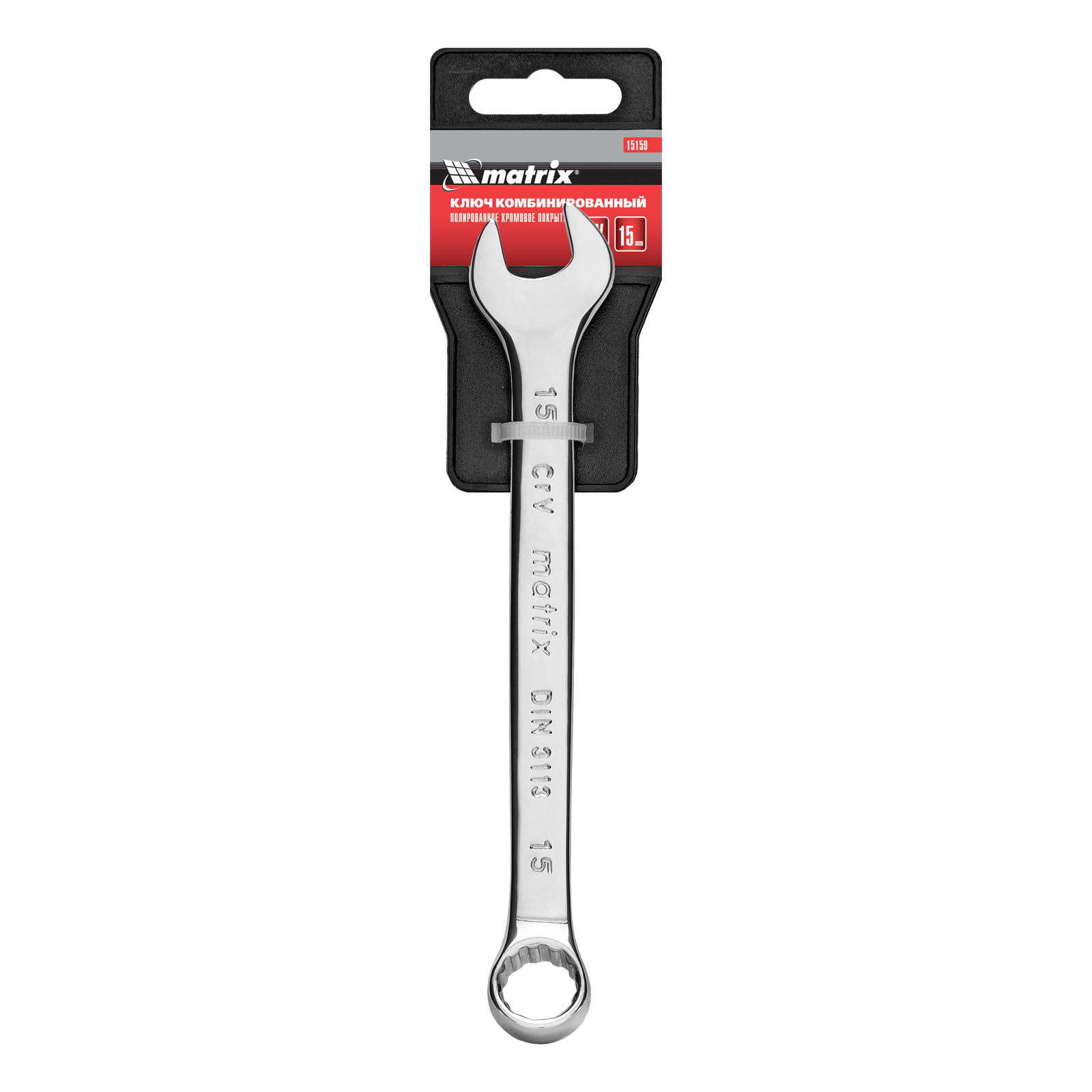 Комбинированный ключ Matrix 15159 размером 15 мм, из стали CrV, с покрытием «полированный хром», пригодится во время ремонтных работ дома или в гараже. С его помощью можно быстро монтировать и демонтировать крепежные элементы. Угол наклона кольцевого зева относительно плоскости инструмента составляет 15°, поэтому ключом удобно работать в труднодоступных местах.