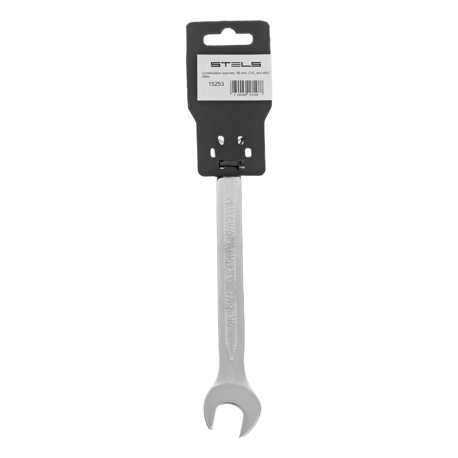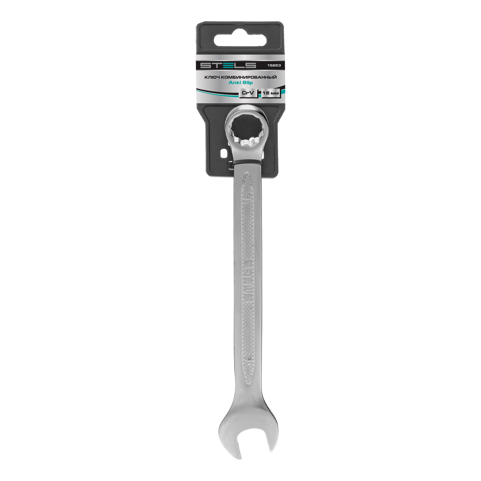 <p>Комбинированный ключ Stels 15253 из стали CrV, 16 мм, антислип, позволяет откручивать и закручивать резьбовые соединения. Универсален в применении, т.к. имеет кольцевую и рожковую головки. 12-гранный профиль накидного зева обеспечивает увеличенную площадь контакта с поверхностью крепежа, что минимизирует вероятность его деформации. Ключ будет полезен в автомастерской, для монтажа и демонтажа оборудования, пригодится для работ по дому.</p><h2>Преимущества</h2><ul><li>Высокий показатель прочности — инструмент изготовлен из стали хромованадиевой группы, твердость рабочей части составляет 42-50 HRC.</li><li>Улучшенные антикоррозионные свойства и повышенная износостойкость благодаря хромированному покрытию.</li><li>Удобство при выполнении монтажных работ — кольцевой зев смещен на 15 градусов относительно тела ключа.</li><li>Надежный хват — благодаря рельефной поверхности ключ не скользит в руке.</li></ul>