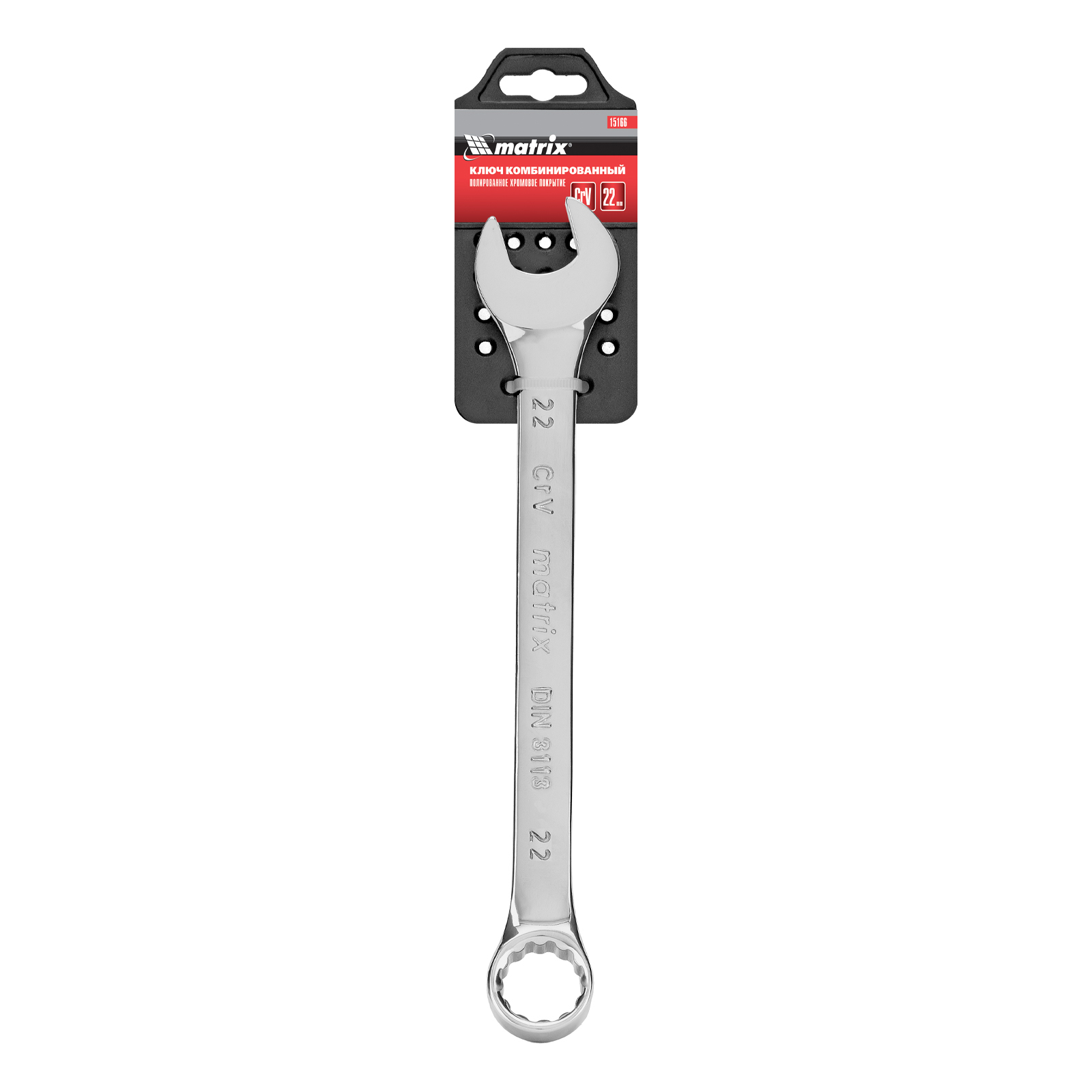 Комбинированный ключ Matrix 15166 размером 22 мм, из стали CrV, с покрытием «полированный хром», пригодится во время ремонтных работ дома или в гараже. С его помощью можно быстро монтировать и демонтировать крепежные элементы. Угол наклона кольцевого зева относительно плоскости инструмента составляет 15°, поэтому ключом удобно работать в труднодоступных местах.