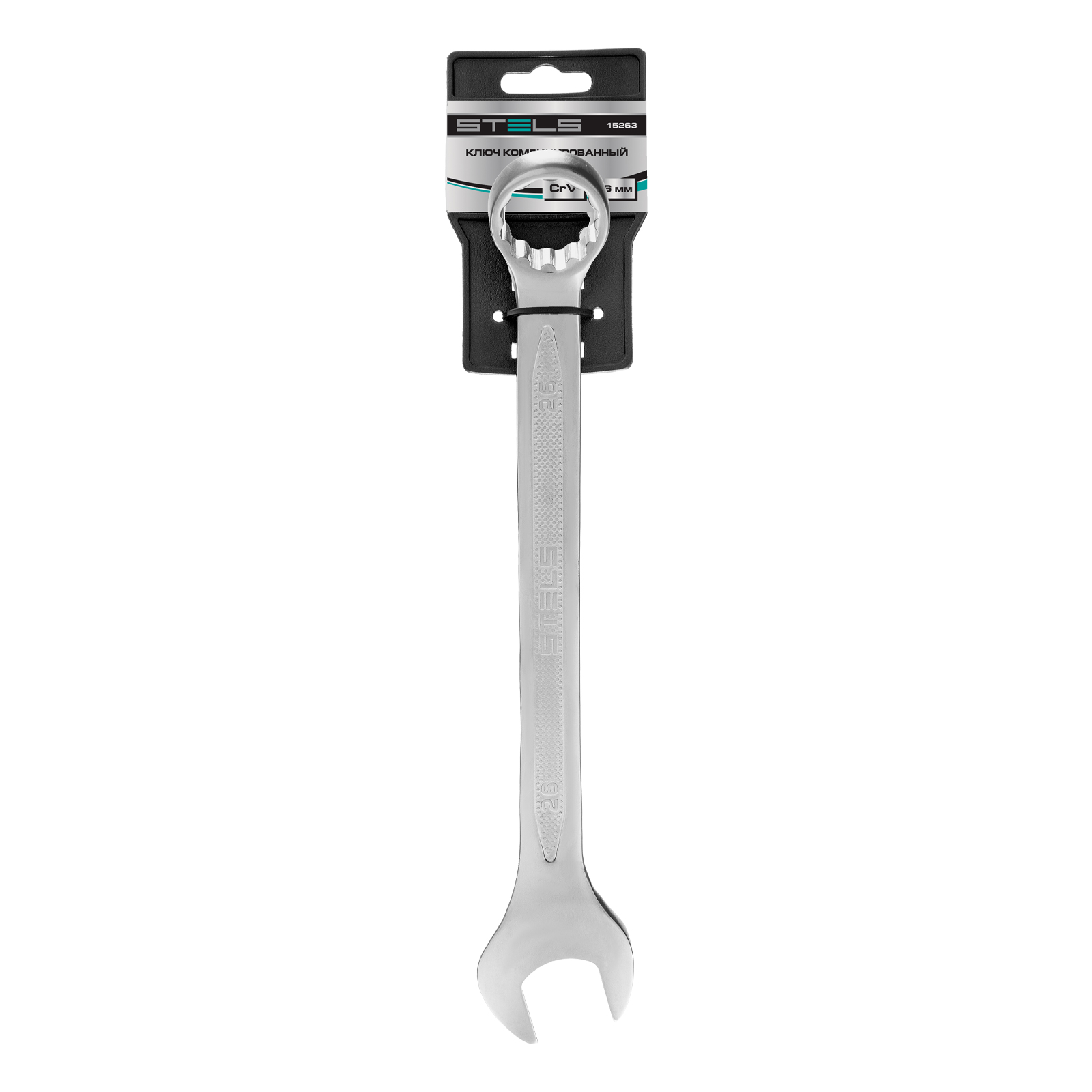 <p>Комбинированный ключ Stels 15263 из стали CrV, 26 мм, антислип, позволяет откручивать и закручивать резьбовые соединения. Универсален в применении, т.к. имеет кольцевую и рожковую головки. 12-гранный профиль накидного зева обеспечивает увеличенную площадь контакта с поверхностью крепежа, что минимизирует вероятность его деформации. Ключ будет полезен в автомастерской, для монтажа и демонтажа оборудования, пригодится для работ по дому.</p><h2>Преимущества</h2><ul><li>Высокий показатель прочности — инструмент изготовлен из стали хромованадиевой группы, твердость рабочей части составляет 42-50 HRC.</li><li>Улучшенные антикоррозионные свойства и повышенная износостойкость благодаря хромированному покрытию.</li><li>Удобство при выполнении монтажных работ — кольцевой зев смещен на 15 градусов относительно тела ключа.</li><li>Надежный хват — благодаря рельефной поверхности ключ не скользит в руке.</li></ul>