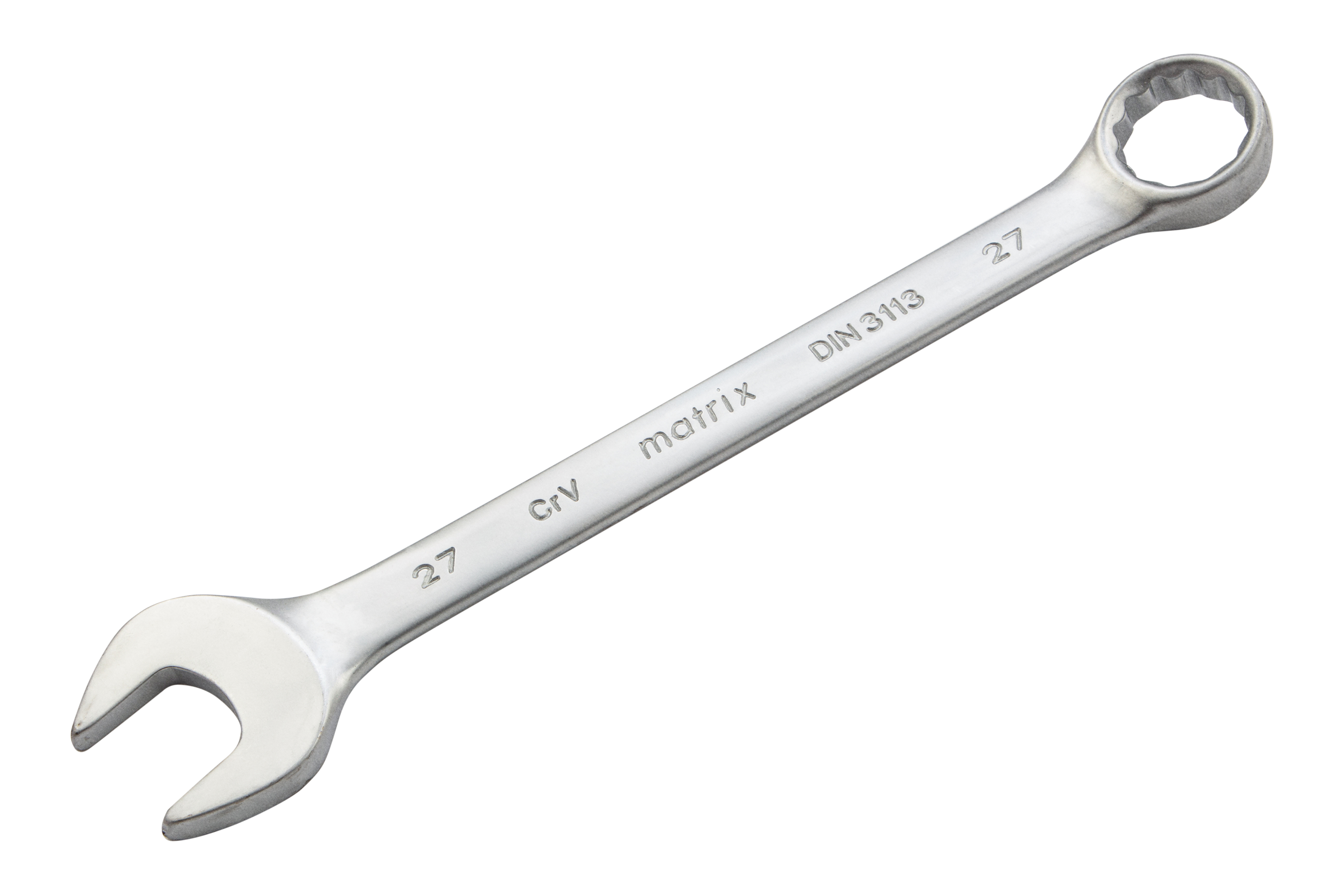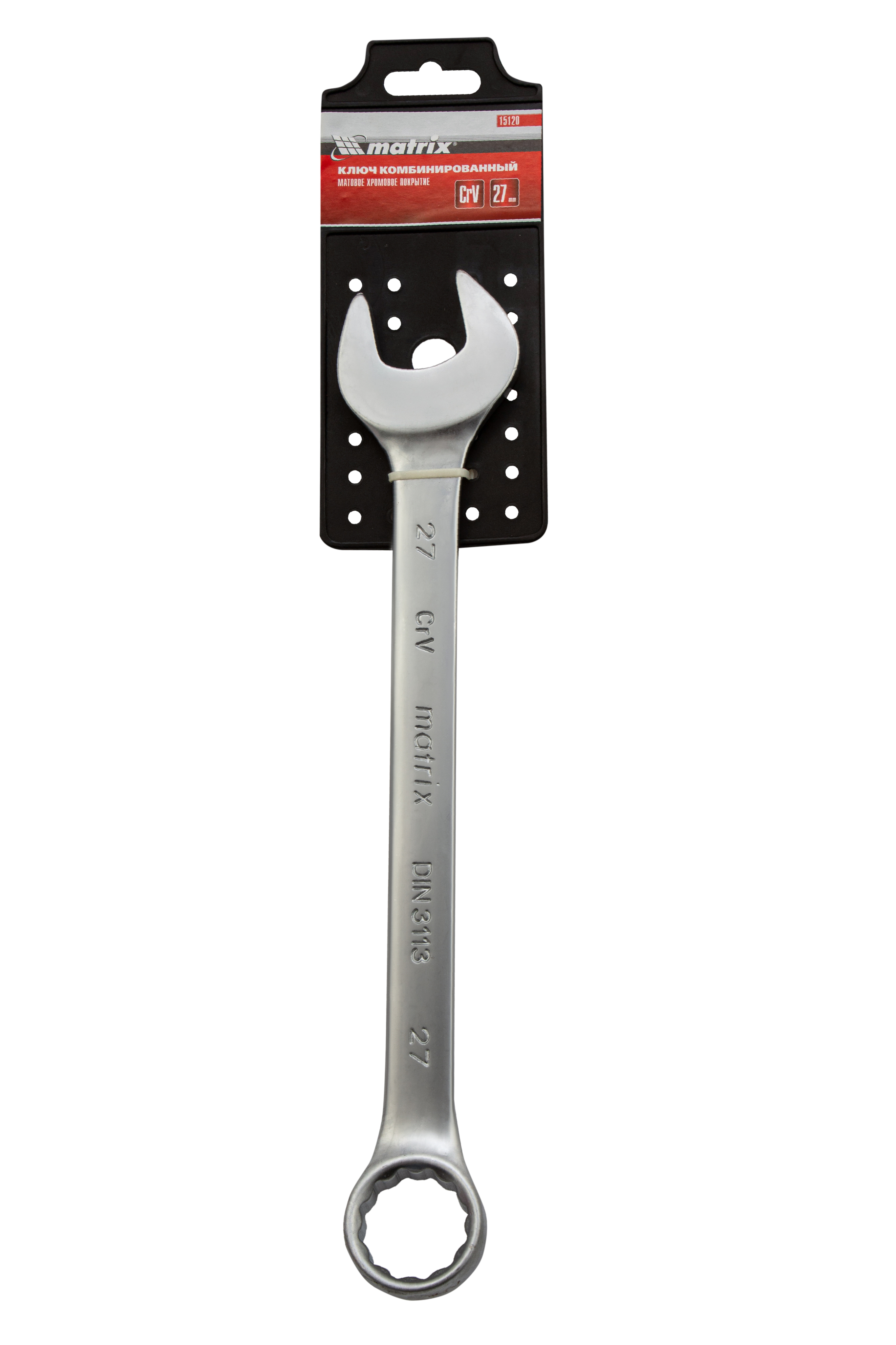 Комбинированный ключ Matrix 15120 размером 27 мм, из стали CrV, с покрытием «матовый хром», пригодится во время ремонтных работ дома или в гараже. С его помощью можно быстро монтировать и демонтировать крепежные элементы. Угол наклона кольцевого зева относительно плоскости инструмента составляет 15°, поэтому ключом удобно работать в труднодоступных местах.