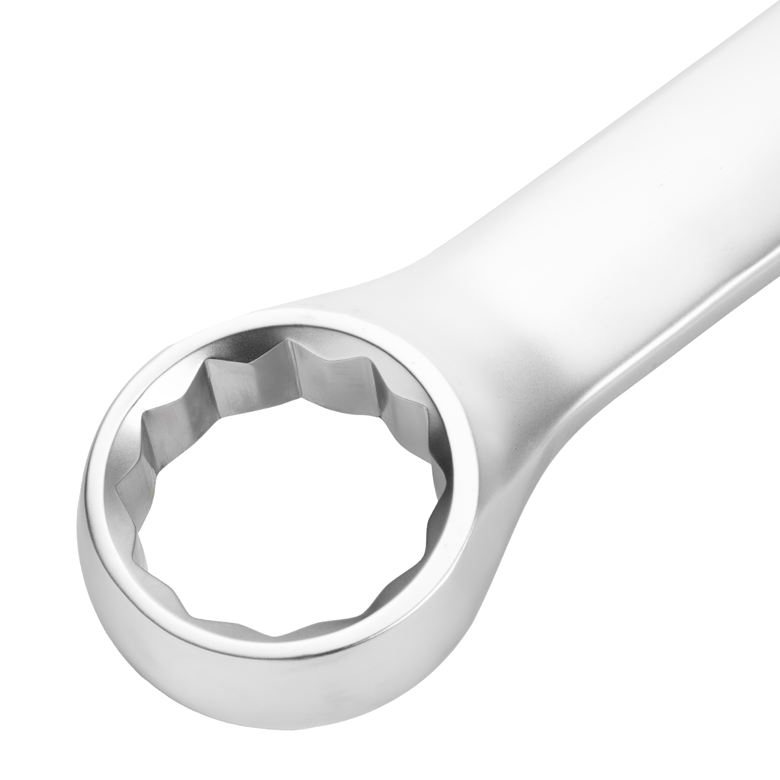 Комбинированный ключ Сибртех 14929 с никелированной поверхностью используется для работы с резьбовым крепежом размером 55 мм. Две рабочие части (рожковая и накидная) расширяют возможности применения инструмента. Кольцевой зев с 12 гранями подходит для работы с болтами и гайками как с шестигранным, так и с двенадцатигранным профилем. Инструмент применяется в автосервисах, на производстве, в строительстве и других сферах, где требуется монтаж крупного резьбового соединения.