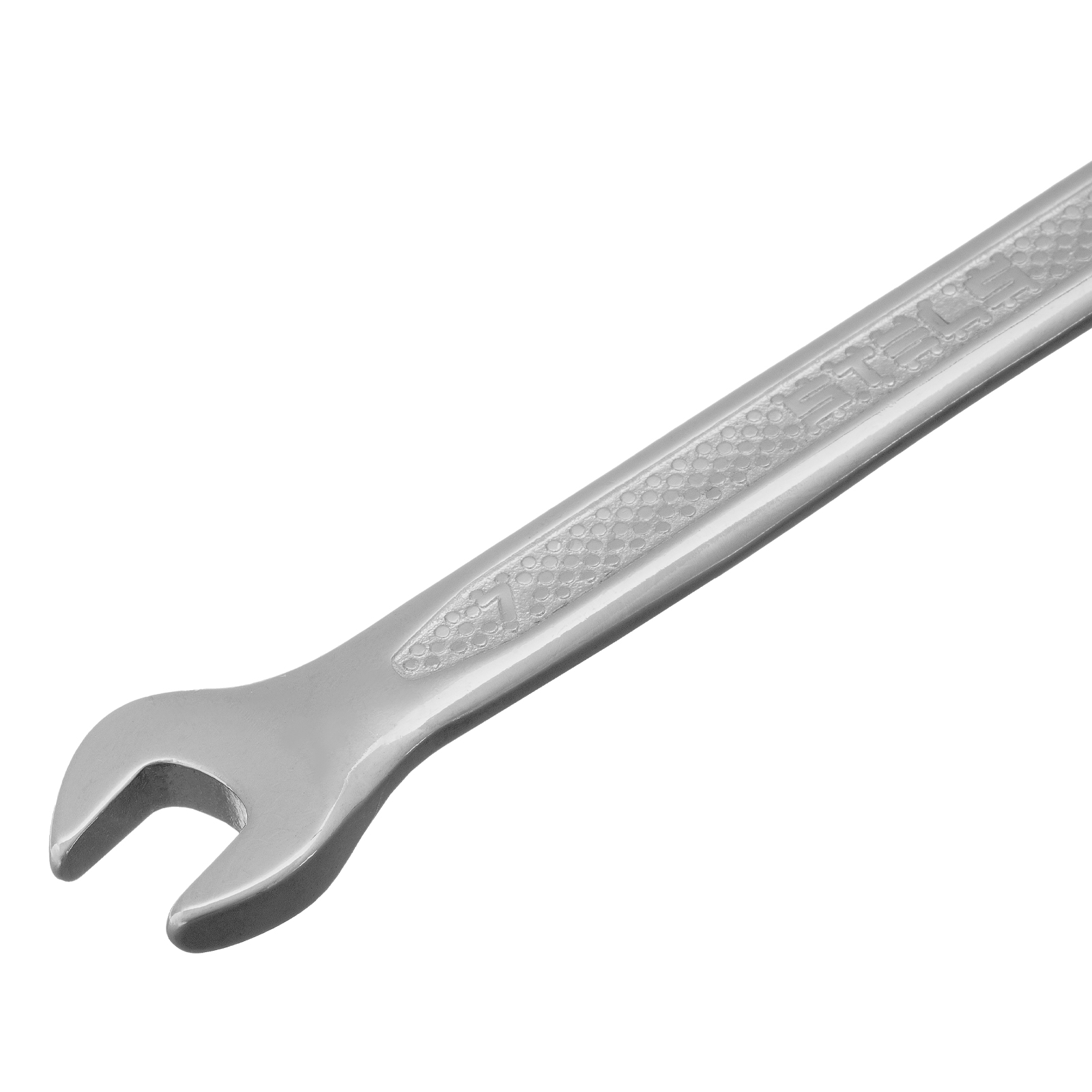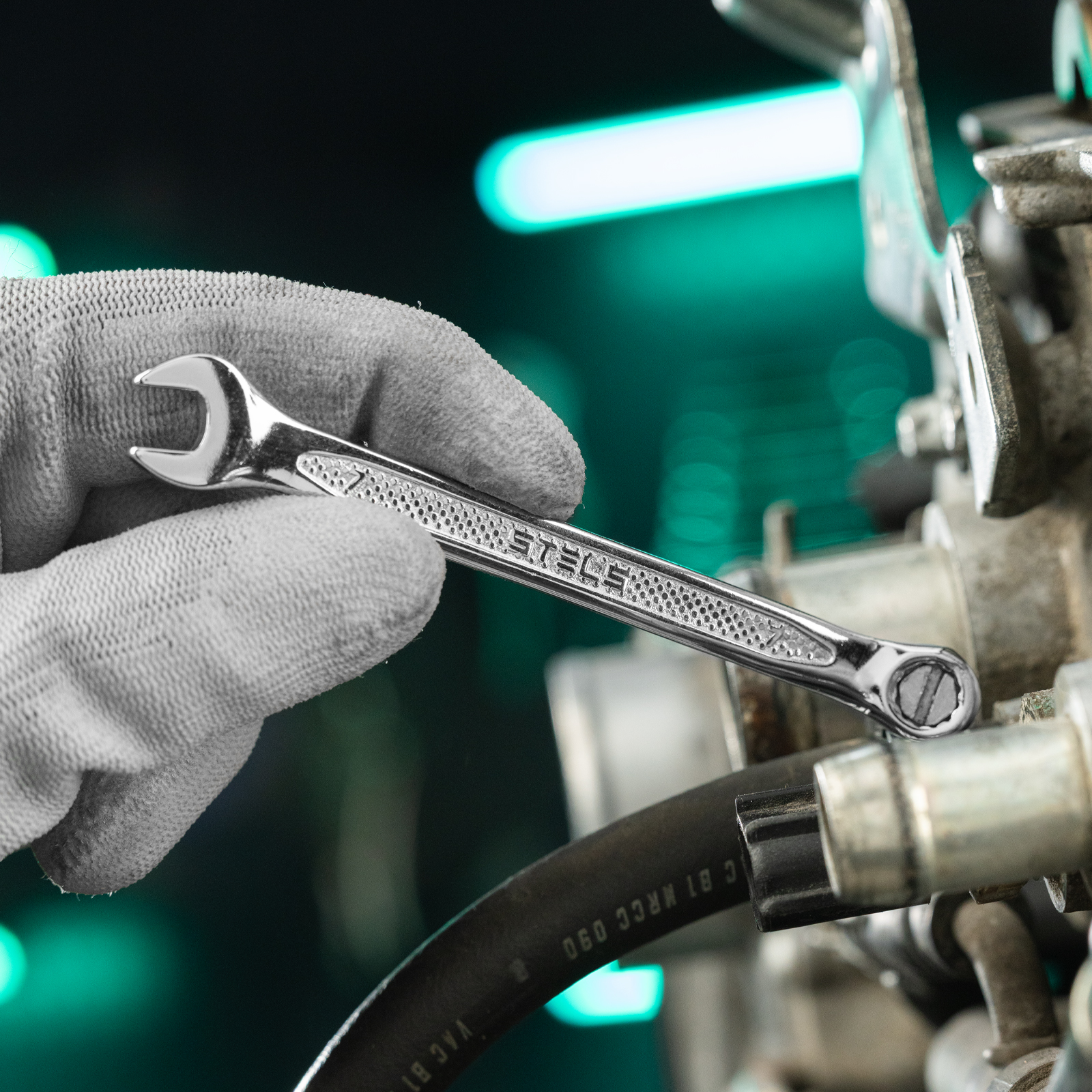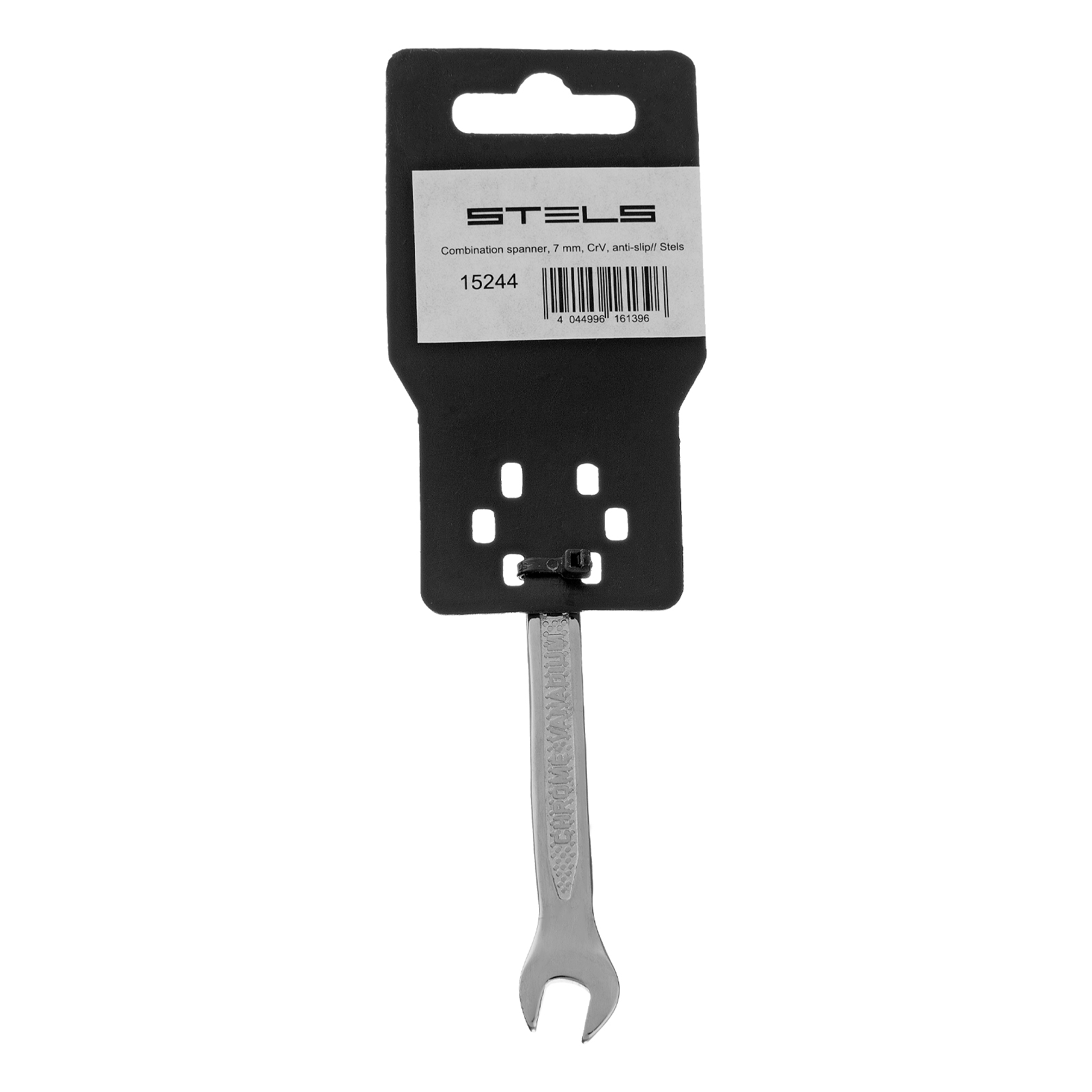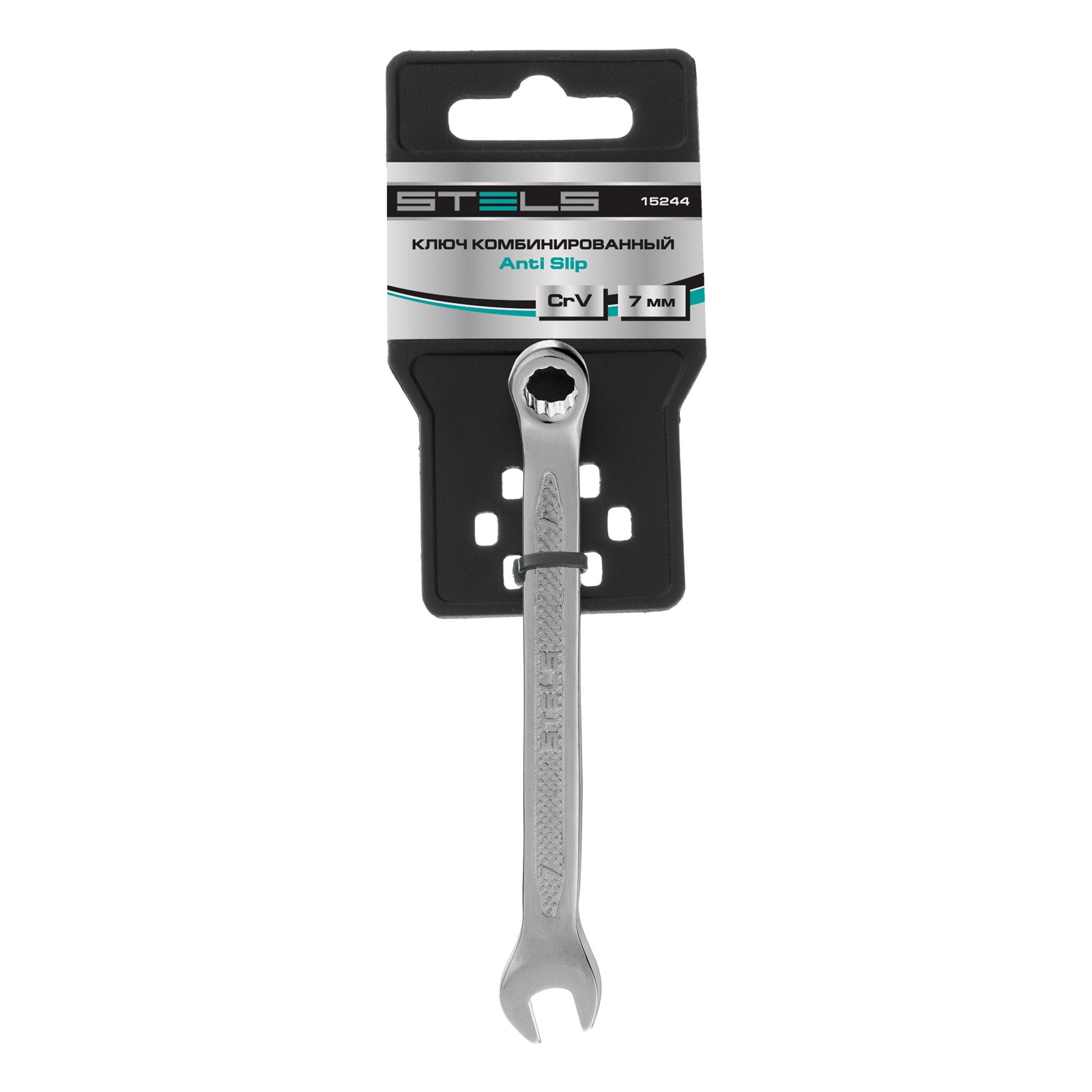 <p>Комбинированный ключ Stels 15244 из стали CrV, 7 мм, антислип, позволяет откручивать и закручивать резьбовые соединения. Универсален в применении, т.к. имеет кольцевую и рожковую головки. 12-гранный профиль накидного зева обеспечивает увеличенную площадь контакта с поверхностью крепежа, что минимизирует вероятность его деформации. Ключ будет полезен в автомастерской, для монтажа и демонтажа оборудования, пригодится для работ по дому.</p><h2>Преимущества</h2><ul><li>Высокий показатель прочности — инструмент изготовлен из стали хромованадиевой группы, твердость рабочей части составляет 42-50 HRC.</li><li>Улучшенные антикоррозионные свойства и повышенная износостойкость благодаря хромированному покрытию.</li><li>Удобство при выполнении монтажных работ — кольцевой зев смещен на 15 градусов относительно тела ключа.</li><li>Надежный хват — благодаря рельефной поверхности ключ не скользит в руке.</li></ul>