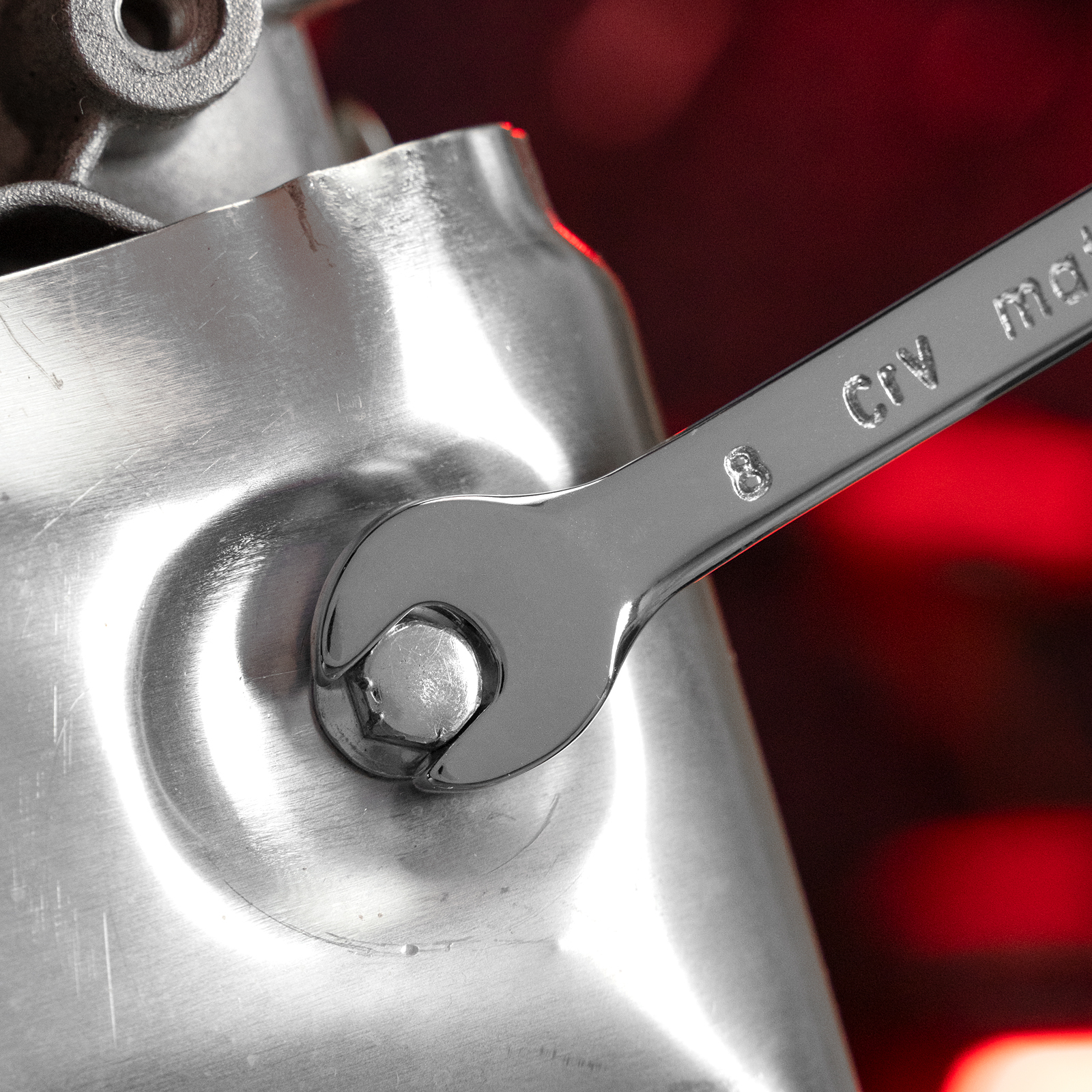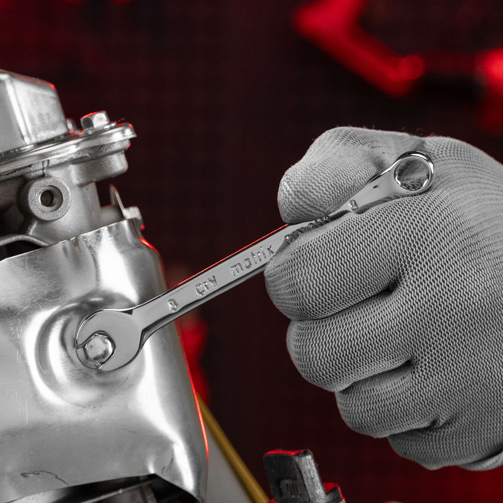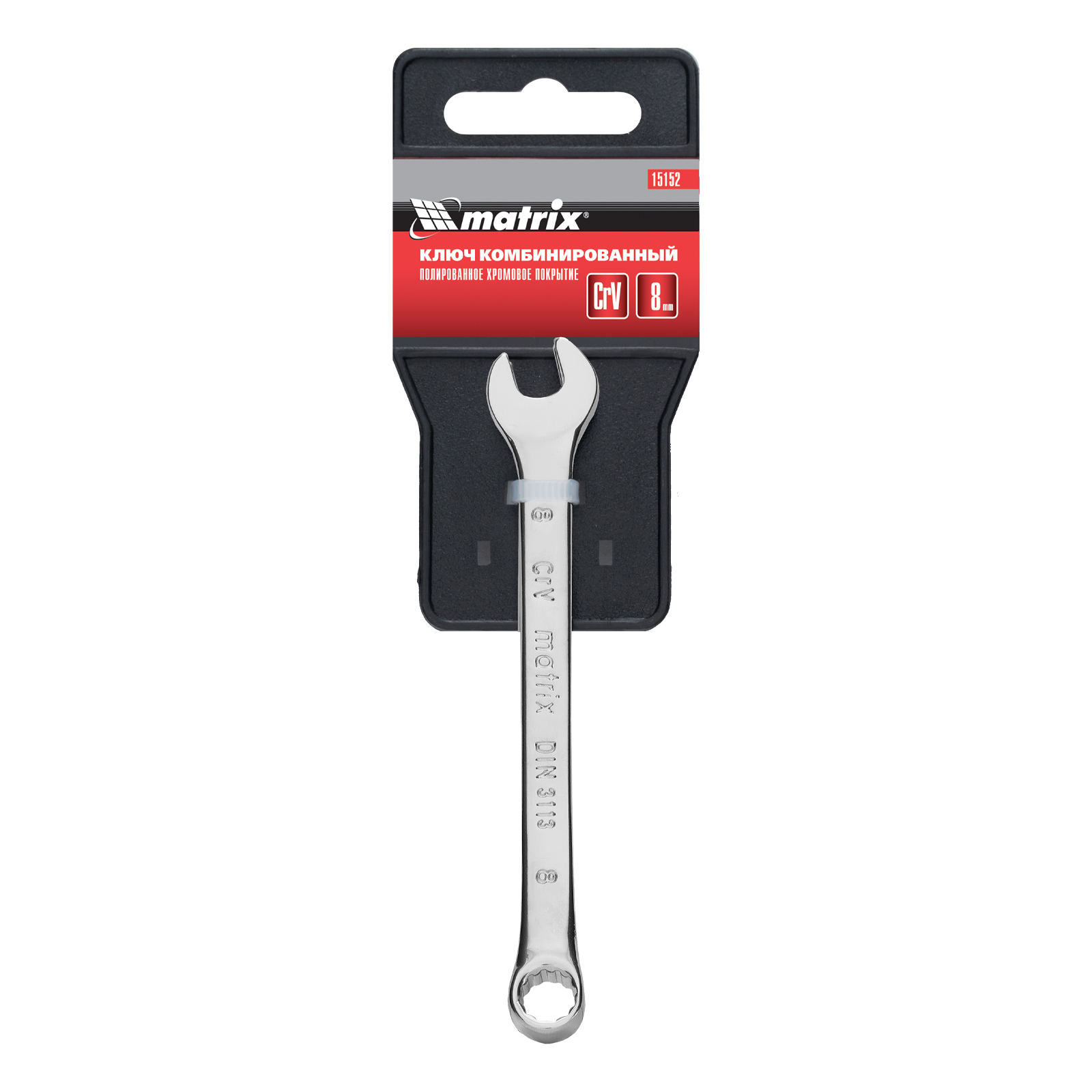 Комбинированный ключ Matrix 15152 размером 8 мм, из стали CrV, с покрытием «полированный хром», пригодится во время ремонтных работ дома или в гараже. С его помощью можно быстро монтировать и демонтировать крепежные элементы. Угол наклона кольцевого зева относительно плоскости инструмента составляет 15°, поэтому ключом удобно работать в труднодоступных местах.