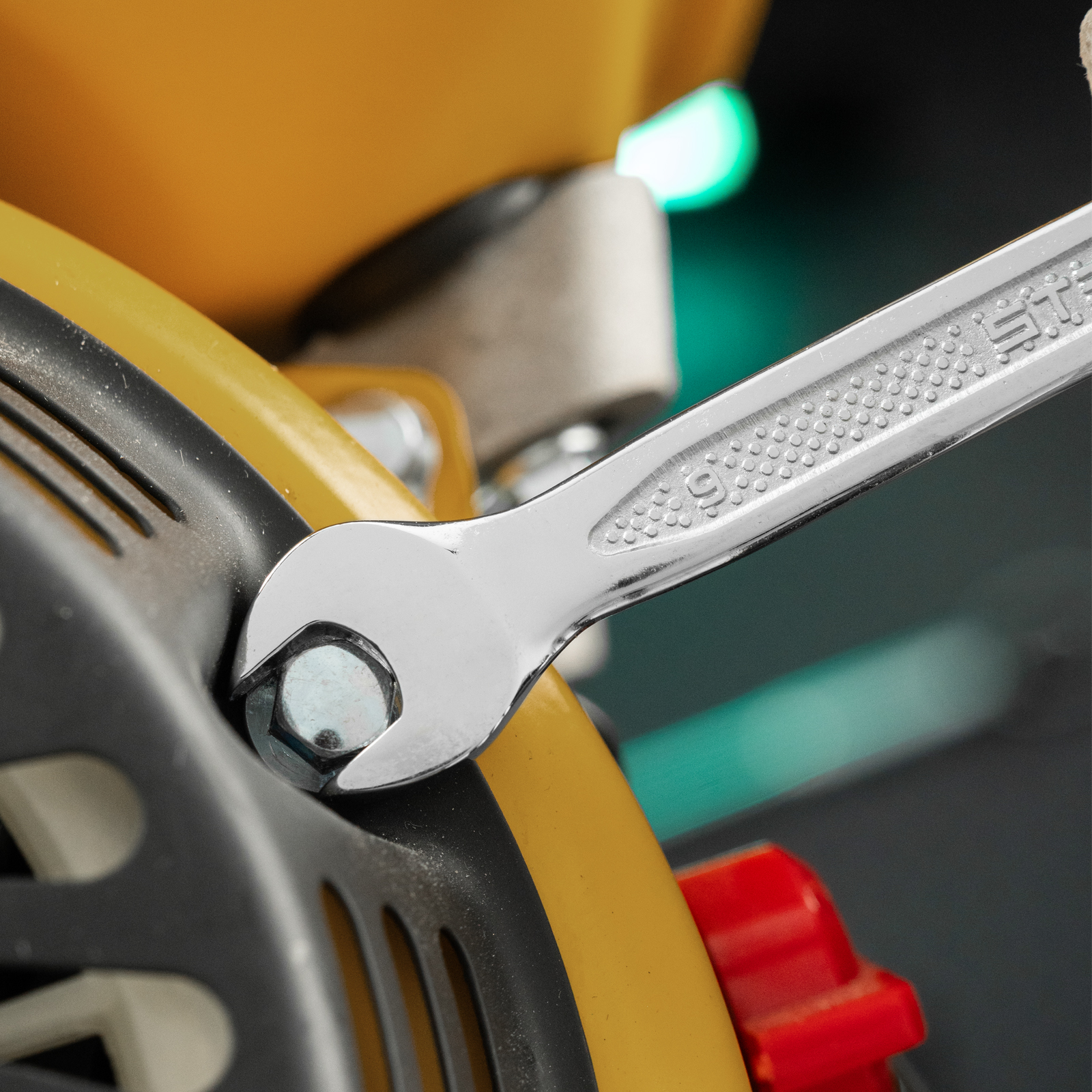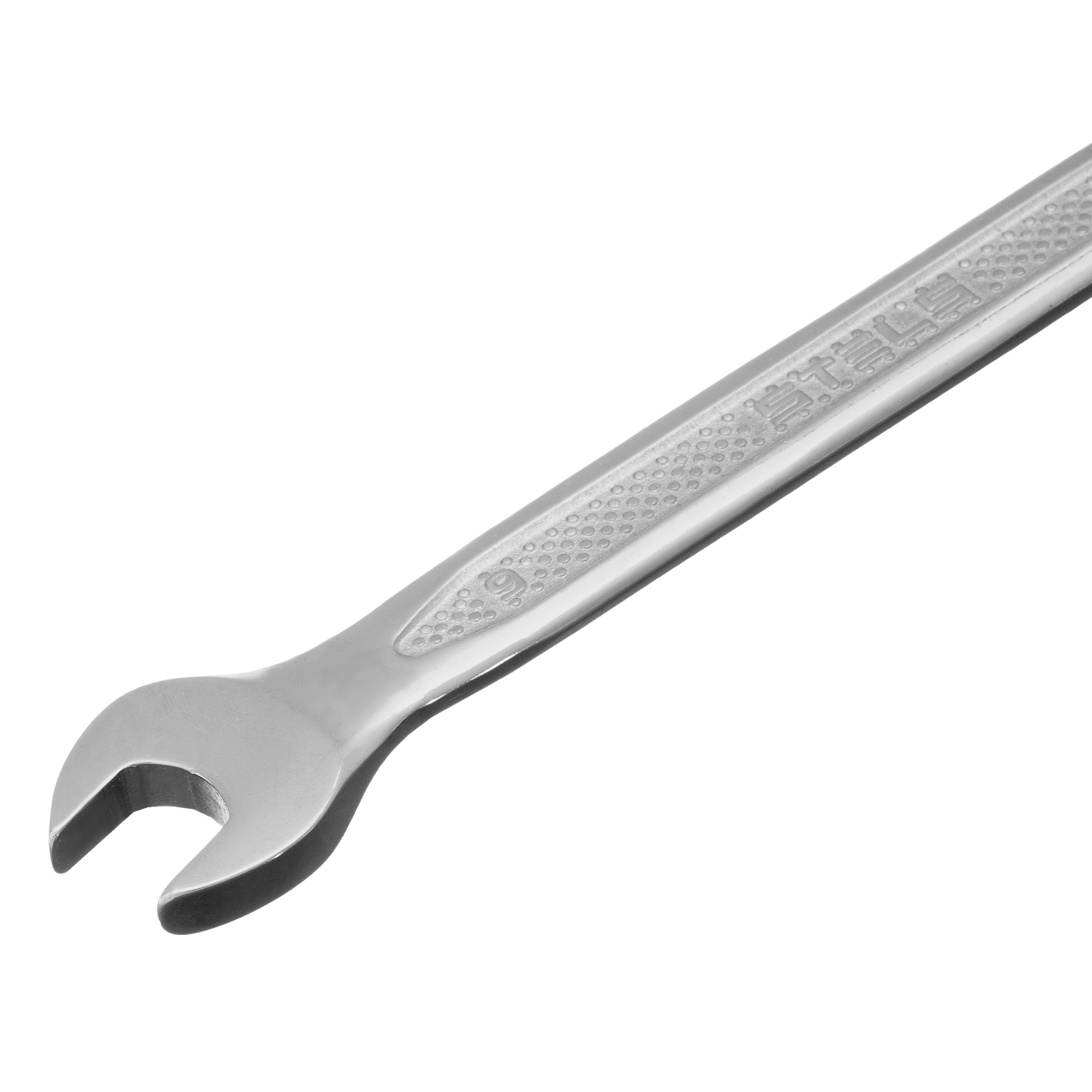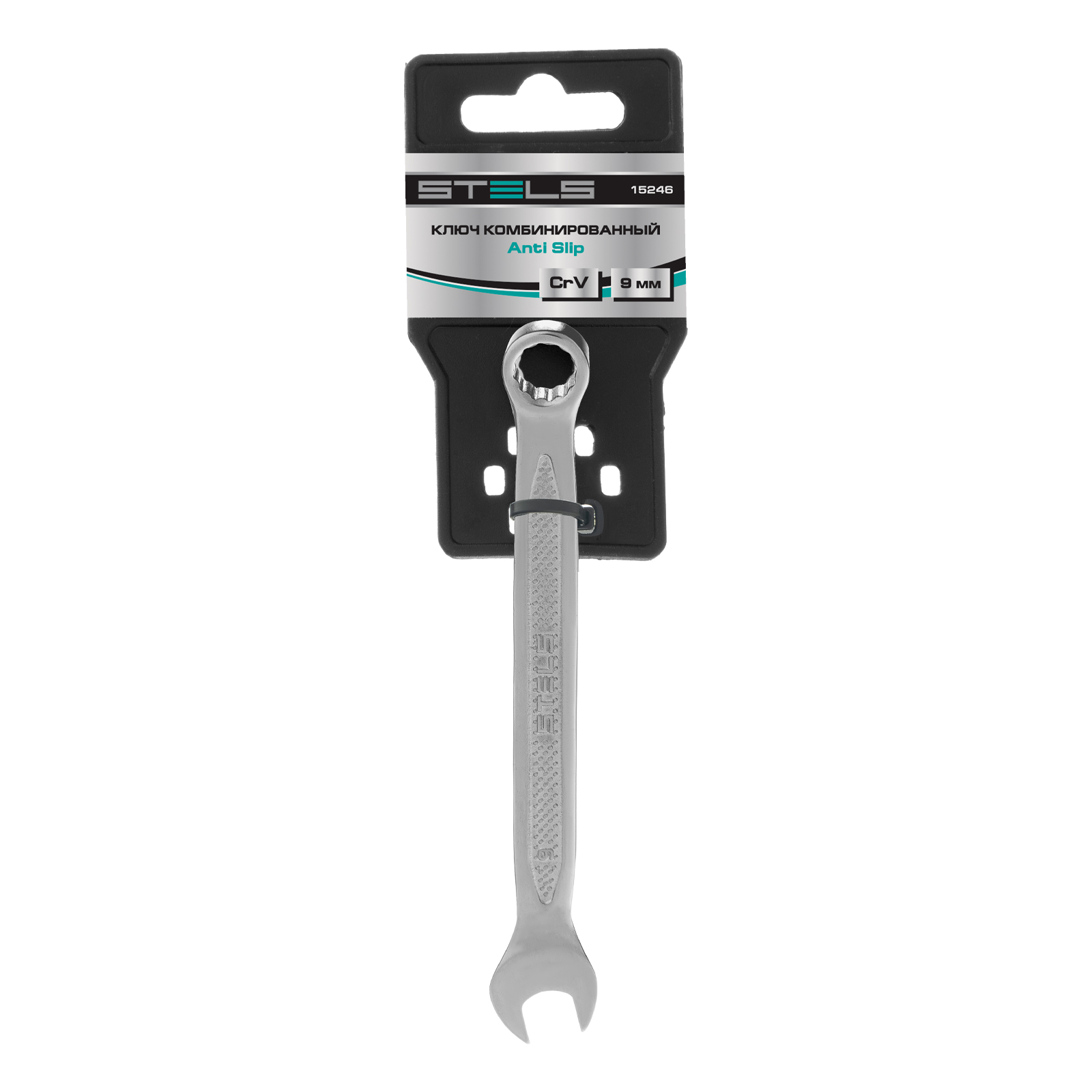 <p>Комбинированный ключ Stels 15246 из стали CrV, 9 мм, антислип, позволяет откручивать и закручивать резьбовые соединения. Универсален в применении, т.к. имеет кольцевую и рожковую головки. 12-гранный профиль накидного зева обеспечивает увеличенную площадь контакта с поверхностью крепежа, что минимизирует вероятность его деформации. Ключ будет полезен в автомастерской, для монтажа и демонтажа оборудования, пригодится для работ по дому.</p><h2>Преимущества</h2><ul><li>Высокий показатель прочности — инструмент изготовлен из стали хромованадиевой группы, твердость рабочей части составляет 42-50 HRC.</li><li>Улучшенные антикоррозионные свойства и повышенная износостойкость благодаря хромированному покрытию.</li><li>Удобство при выполнении монтажных работ — кольцевой зев смещен на 15 градусов относительно тела ключа.</li><li>Надежный хват — благодаря рельефной поверхности ключ не скользит в руке.</li></ul>