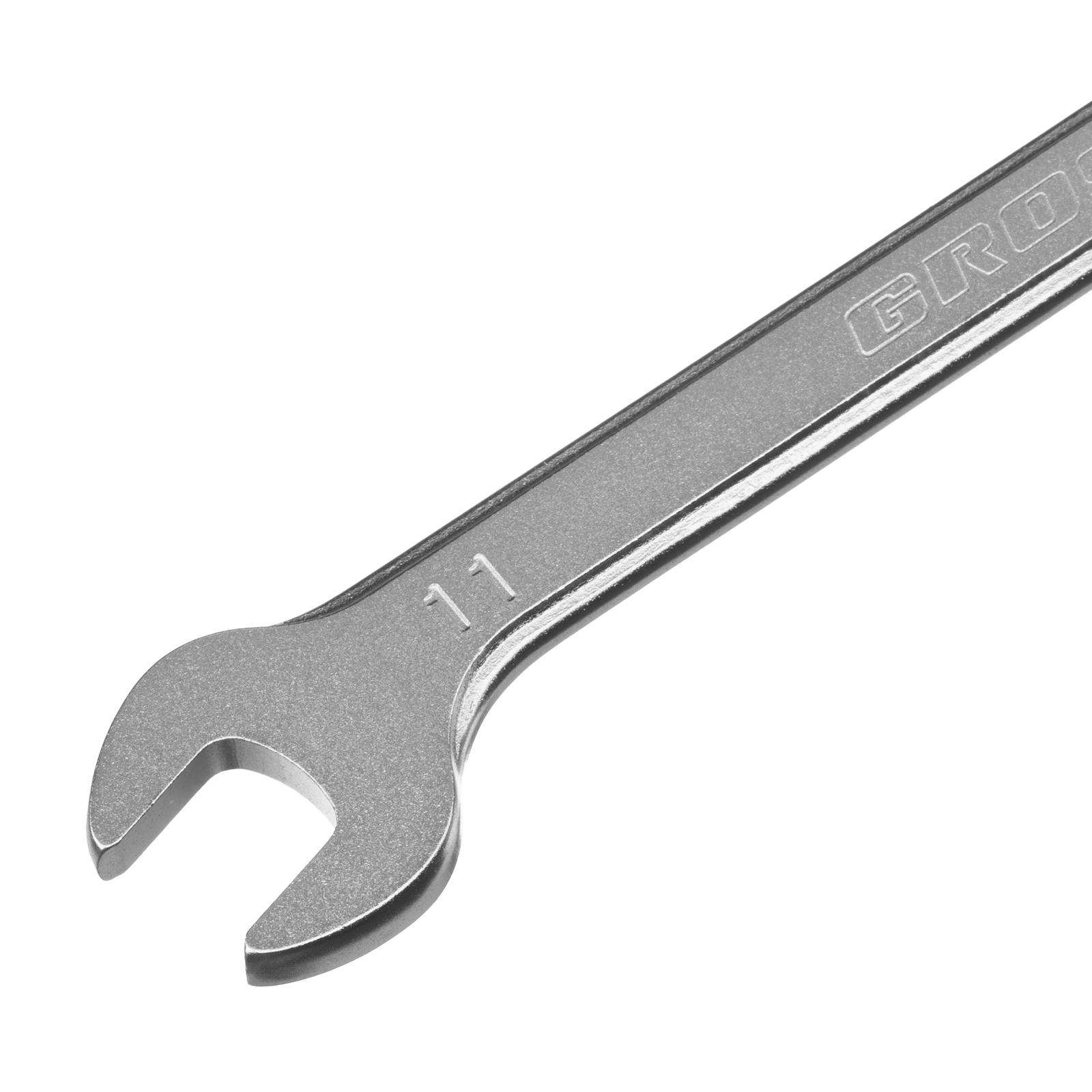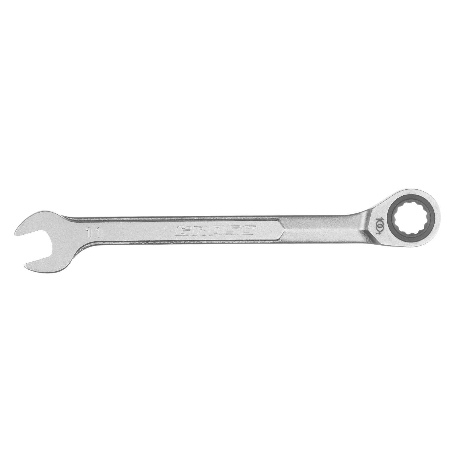 Комбинированный трещоточный ключ Gross 14849, 11 мм, используется при монтаже и демонтаже резьбовых соединений. Инструмент имеет как рожковую, так и накидную часть, что повышает его функциональность. У накидной части 12 внутренних граней, что увеличивает площадь соприкосновения с головкой крепежа и снижает риск ее деформации. Ключ применяется как в автосервисах, так и для самостоятельного ремонта автомобилей.