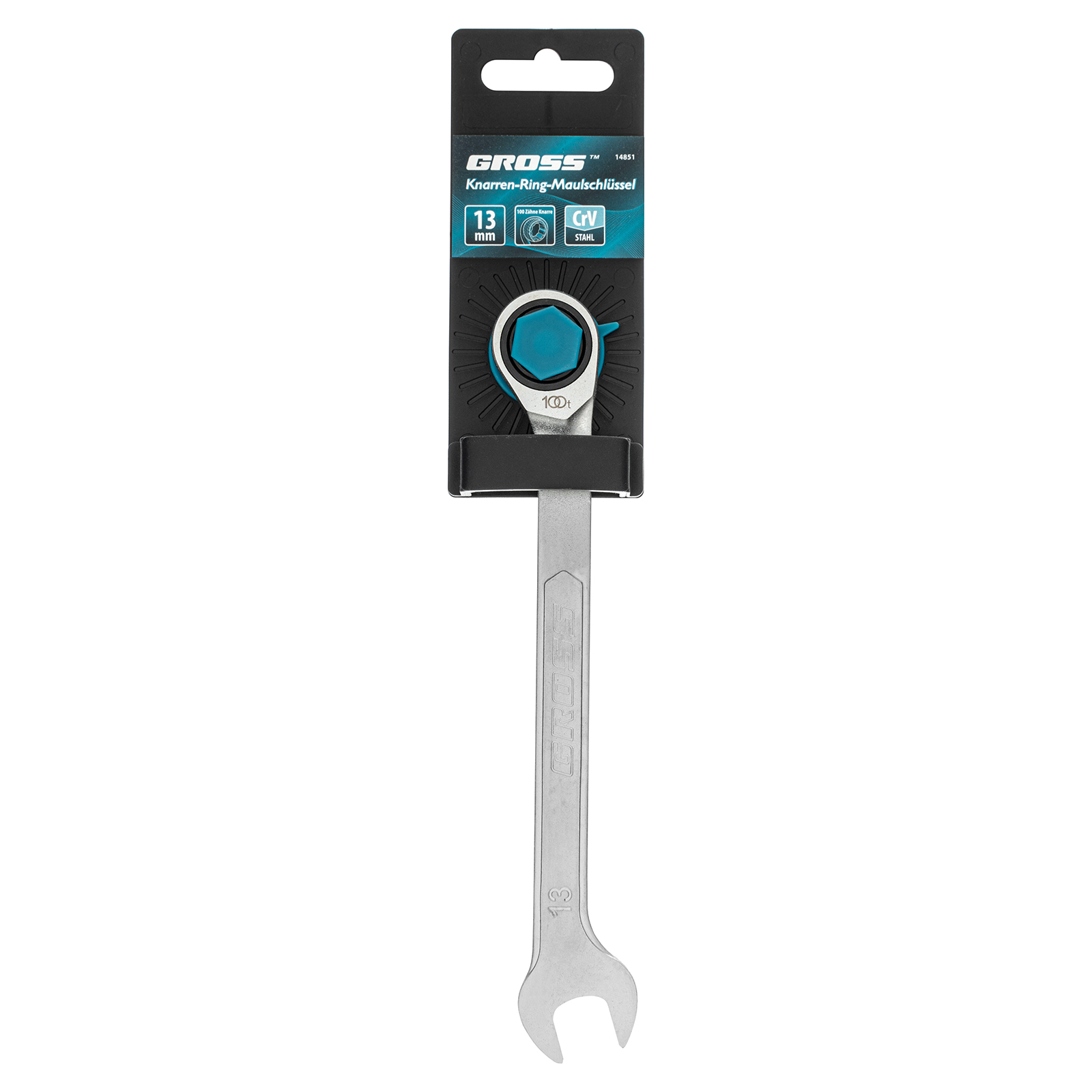 Комбинированный трещоточный ключ Gross 14851, 13 мм, используется при монтаже и демонтаже резьбовых соединений. Инструмент имеет как рожковую, так и накидную часть, что повышает его функциональность. У накидной части 12 внутренних граней, что увеличивает площадь соприкосновения с головкой крепежа и снижает риск ее деформации. Ключ применяется как в автосервисах, так и для самостоятельного ремонта автомобилей.