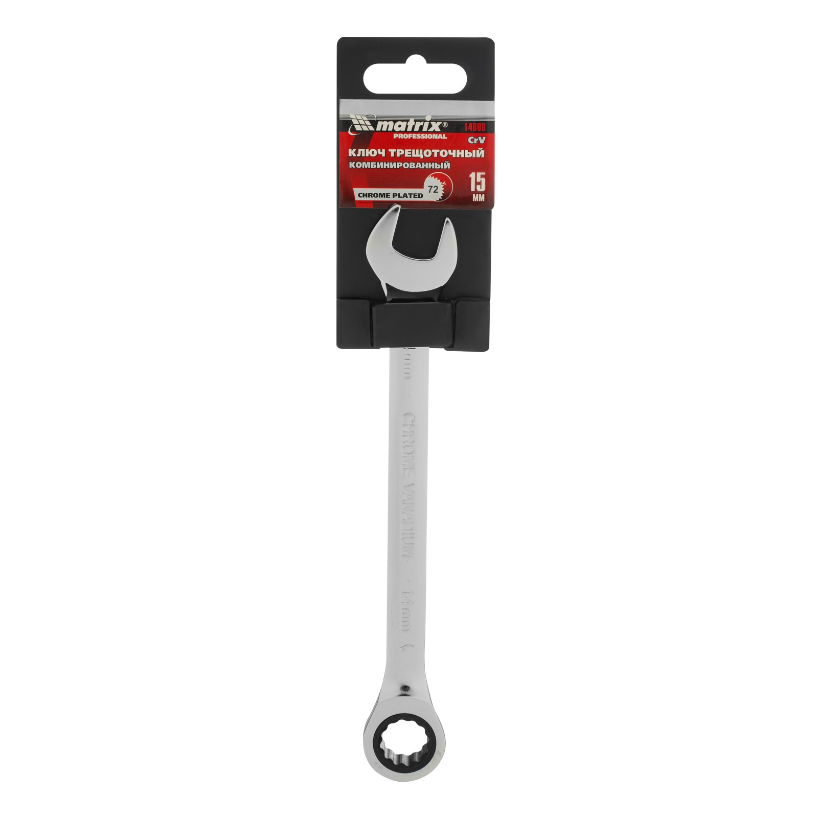 Комбинированный трещоточный ключ Matrix 14808 из стали CrV, с покрытием «зеркальный хром», размером 15 мм, позволяет быстро откручивать и закручивать болты и гайки. Рожковую часть удобно использовать там, где нет возможности полного охвата детали, а трещоточный механизм повышает удобство работы в труднодоступных местах.