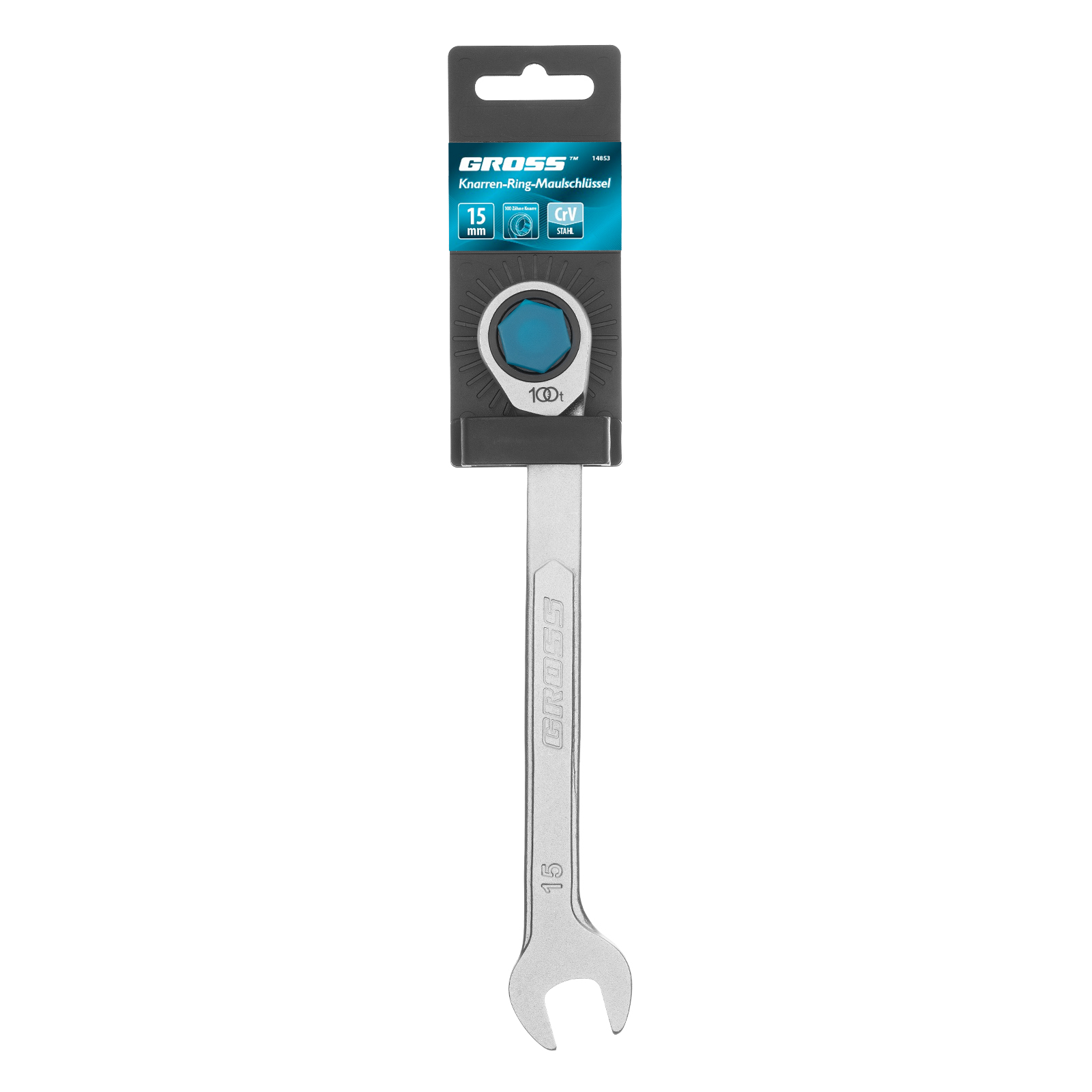 Комбинированный трещоточный ключ Gross 14853, 15 мм, используется при монтаже и демонтаже резьбовых соединений. Инструмент имеет как рожковую, так и накидную часть, что повышает его функциональность. У накидной части 12 внутренних граней, что увеличивает площадь соприкосновения с головкой крепежа и снижает риск ее деформации. Ключ применяется как в автосервисах, так и для самостоятельного ремонта автомобилей.