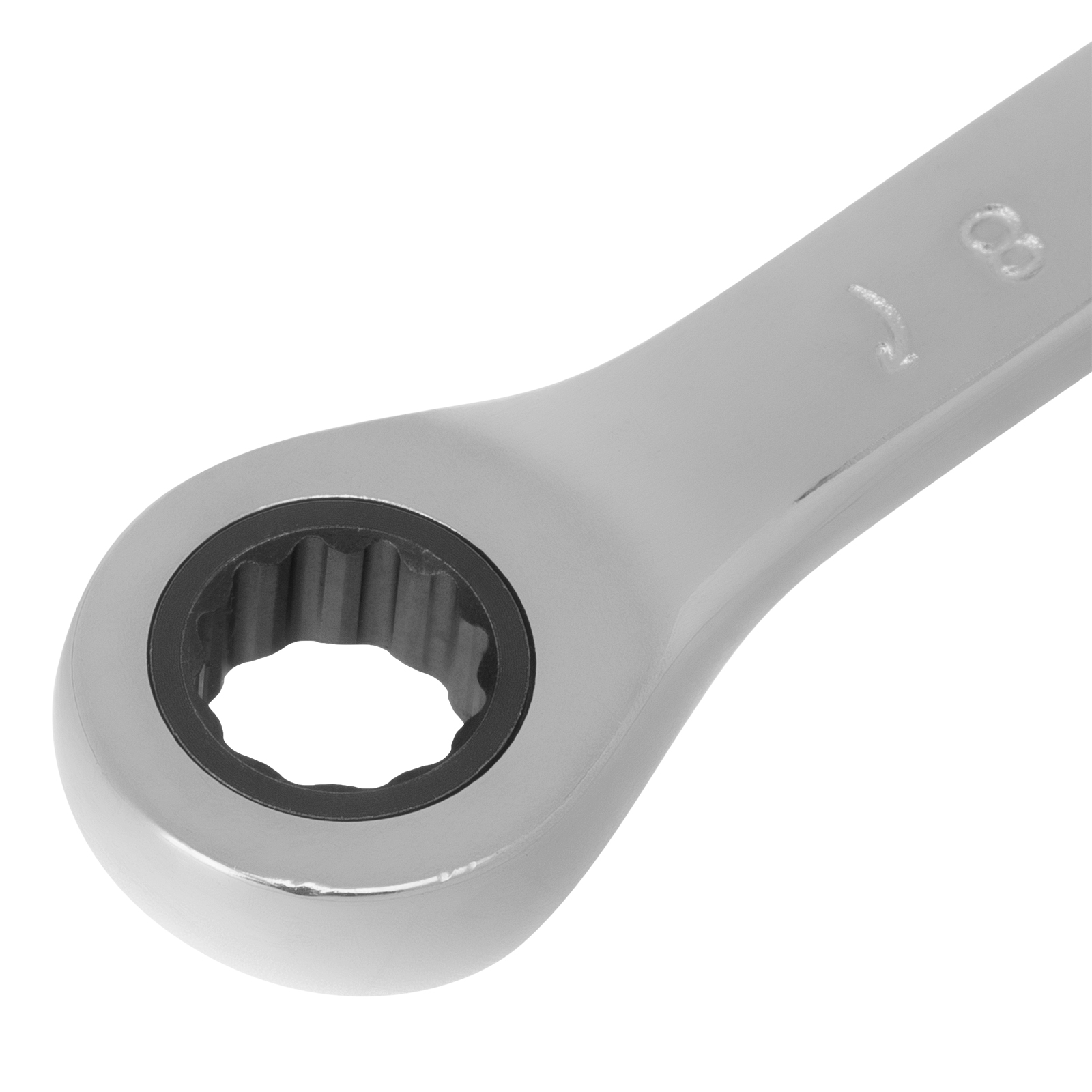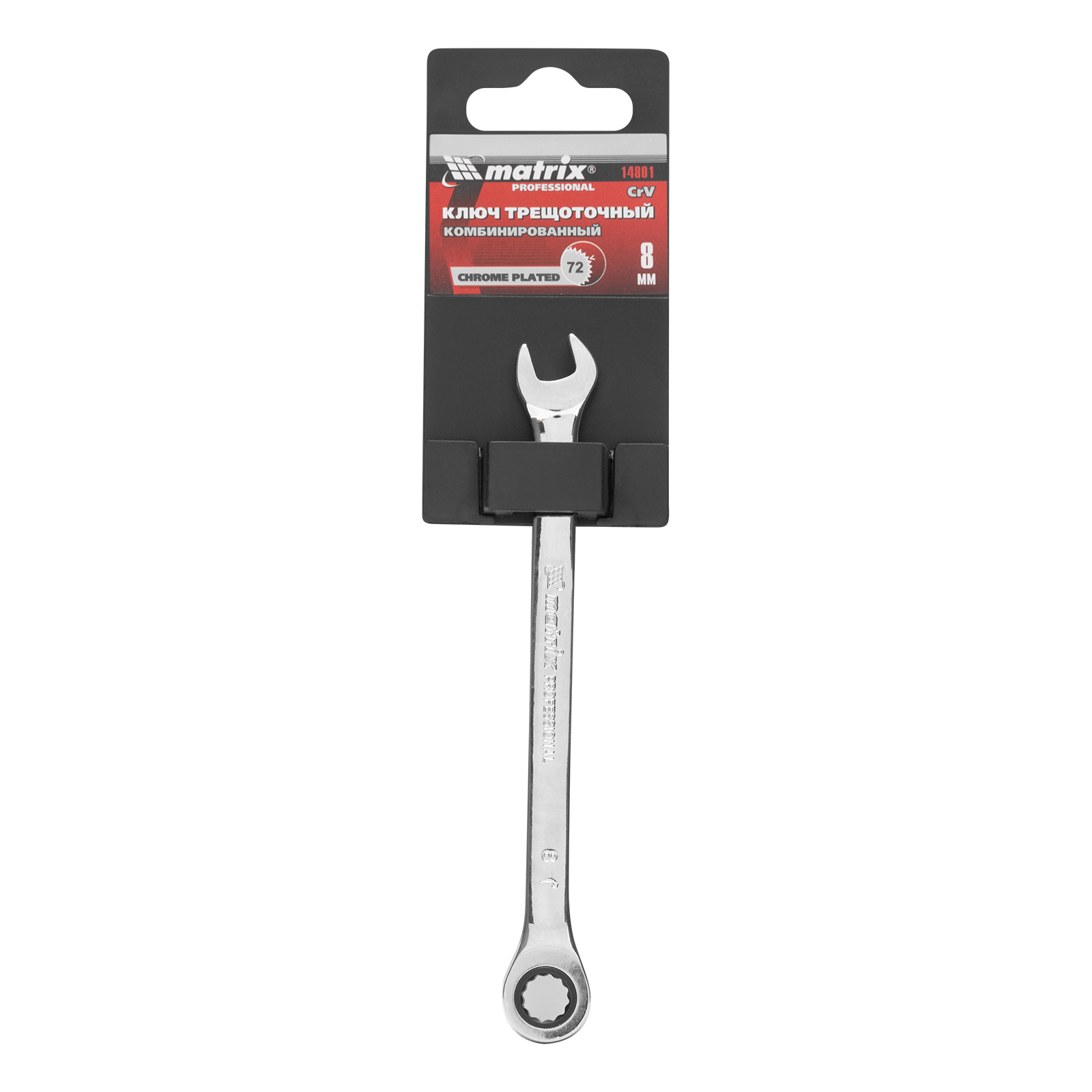 Комбинированный трещоточный ключ Matrix 14801 из стали CrV, с покрытием «зеркальный хром», размером 8 мм, позволяет быстро откручивать и закручивать болты и гайки. Рожковую часть удобно использовать там, где нет возможности полного охвата детали, а трещоточный механизм повышает удобство работы в труднодоступных местах.