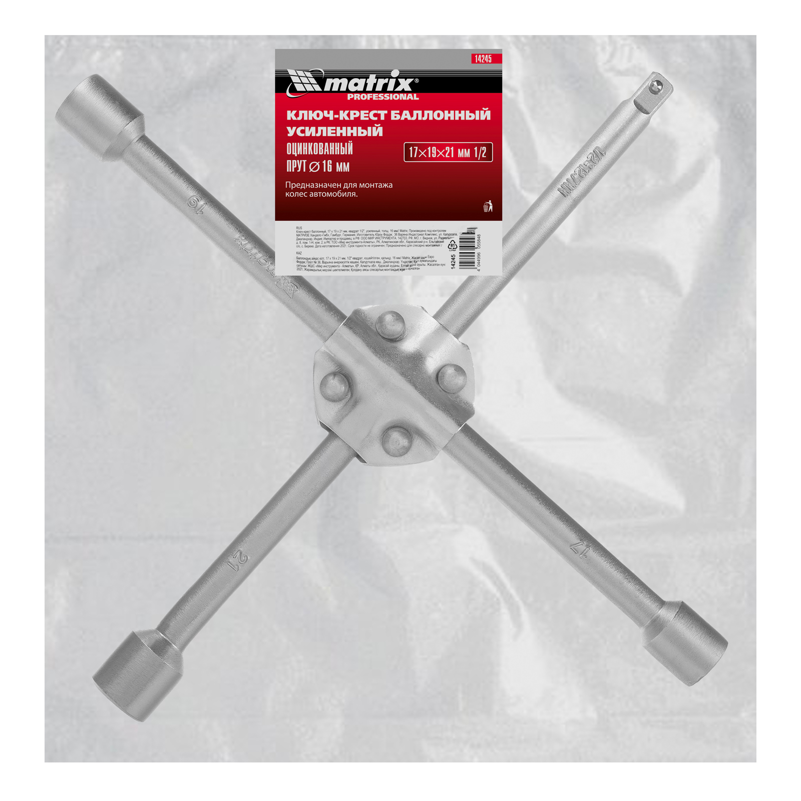 Ключ-крест баллонный усиленный Matrix 14245 размером 17 х 19 х 21 мм, с прутками толщиной 16 мм и присоединительным квадратом 1/2", применяется при установке и снятии автомобильных колес. Универсальный инструмент подходит для крепежа распространенных размеров 17, 19, 21 мм. Равномерно воздействует на крепежные изделия, не повреждая их. Используется на станциях техобслуживания и шиномонтажа, пригодится для самостоятельного ремонта машины или замены колеса в поездке.