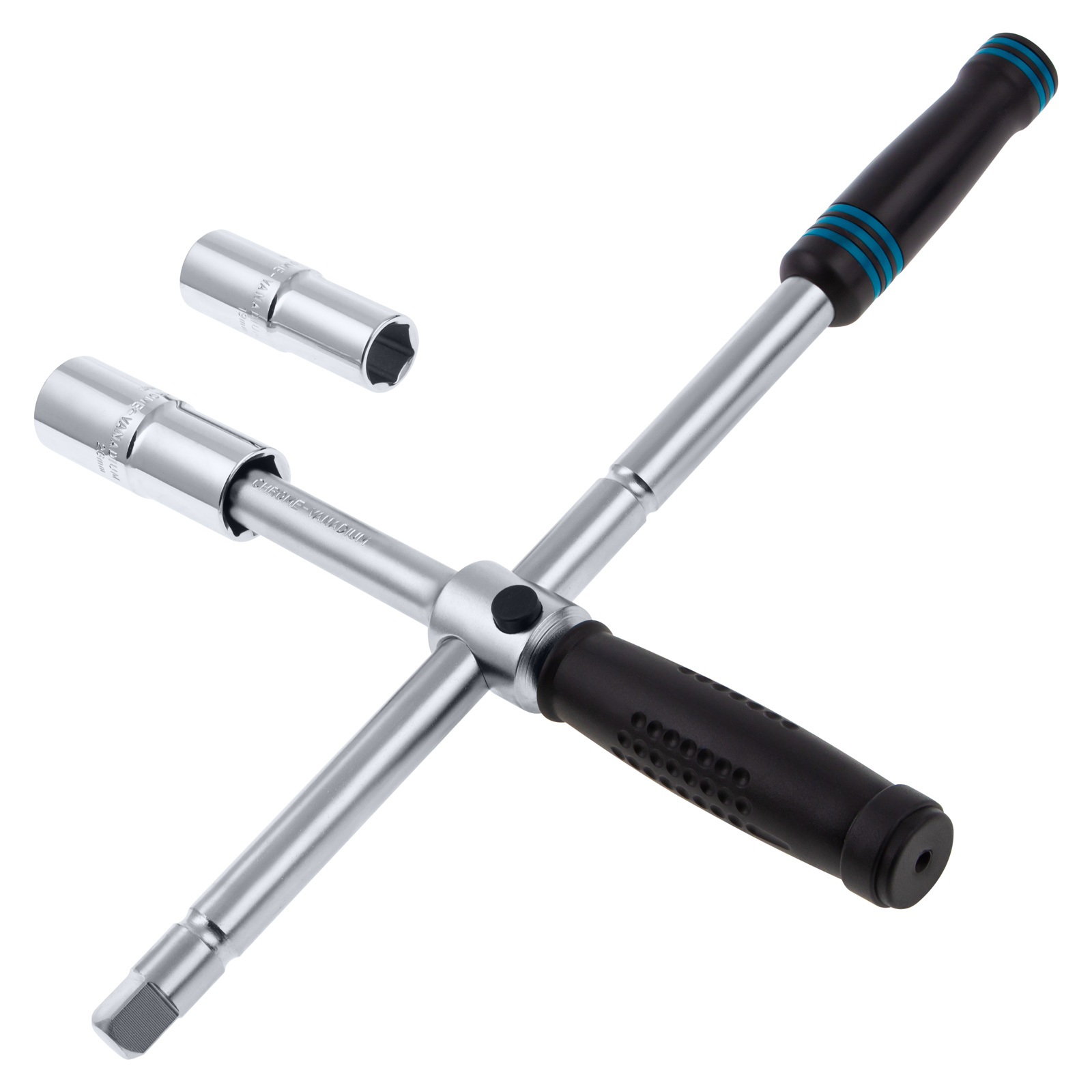 Складной баллонный ключ-крест с изменяющимся рычагом Gross 14270 из стали CrV, хромированный, с головками на 17, 19, 21, 23 мм, предназначен для откручивания и закручивания колесных крепежей. Поставляется с двумя двусторонними торцевыми головками под 4 размера резьбовых соединений. Запатентованный механизм фиксации телескопической рукоятки позволяет изменять длину рычага и оптимально дозировать величину крутящего момента. Инструмент рекомендован для профессионального использования, также может применяться для самостоятельного обслуживания автомобиля.