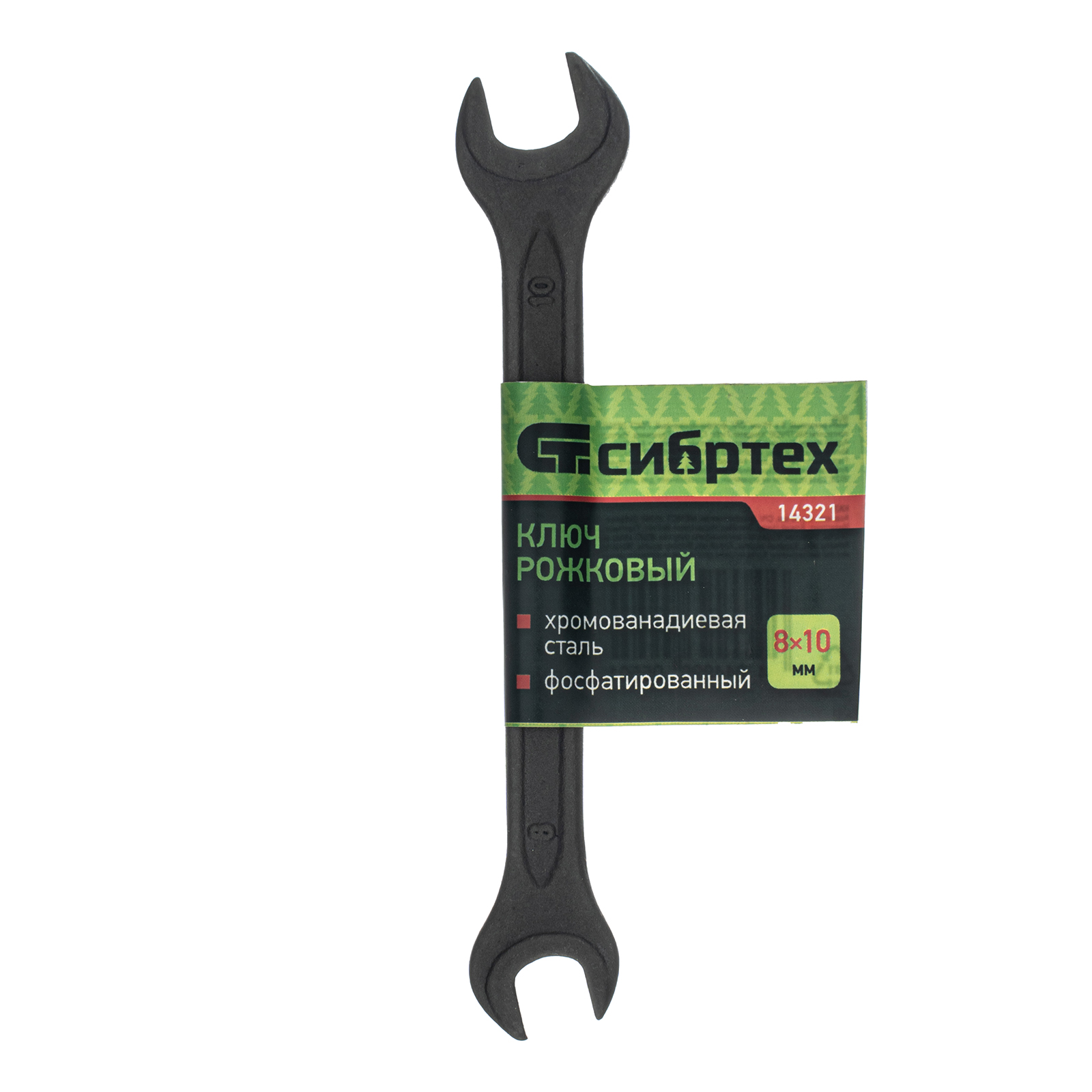 <p>Фосфатированный рожковый ключ Сибртех 14321, 8 х 10 мм, из стали CrV, ГОСТ 2839, используется для монтажа и демонтажа шестигранных резьбовых крепежей. Удобен для работы в труднодоступных местах, т.к. губки расположены под углом к оси тела ключа. Инструмент будет полезен в сервисном центре, авторемонтной мастерской, при монтаже оборудования, а также пригодится дома или на даче.</p><h2>Преимущества</h2><ul><li>Прочность и устойчивость к механическим нагрузкам — ключ изготовлен из кованой стали хромованадиевой группы методом горячей ковки, прошел отжиг, закалку и последующий отпуск.</li><li>Повышенная износостойкость — твердость рабочих частей составляет 42-47 HRC, что соответствует требованиям ГОСТа.</li><li>Долговечность — инструмент фосфатирован для защиты от коррозии.</li></ul>