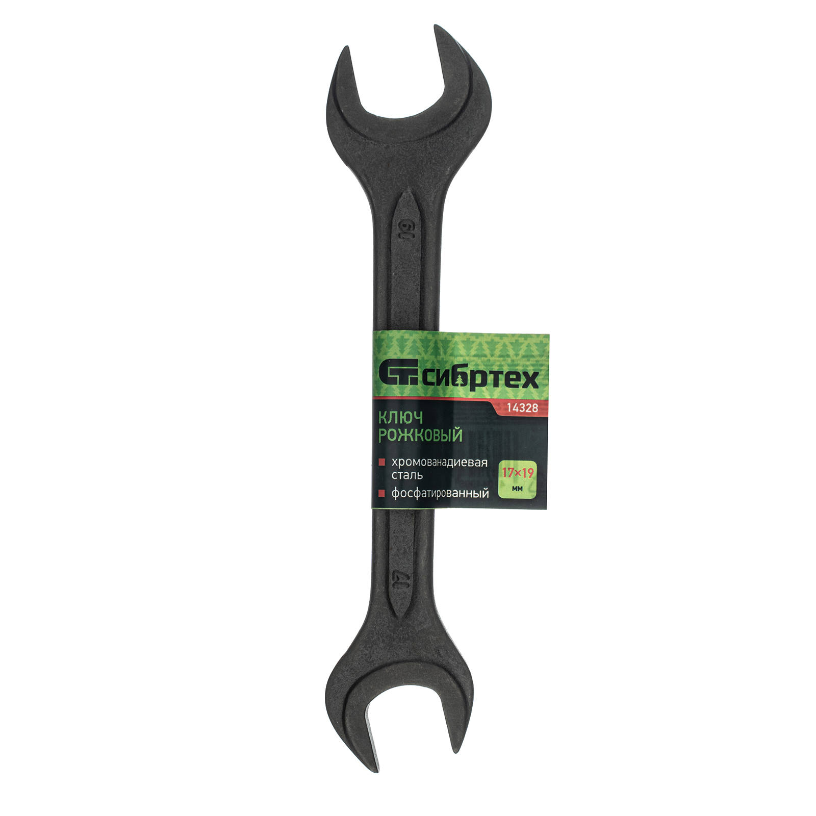 <p>Фосфатированный рожковый ключ Сибртех 14328, 17 х 19 мм, из стали CrV, ГОСТ 2839, используется для монтажа и демонтажа шестигранных резьбовых крепежей. Ключ является двусторонним — на каждом конце имеются губки с размером зева 17 и 19 мм соответственно. Удобен для работы в труднодоступных местах, т.к. губки расположены под углом к оси тела ключа. Инструмент будет полезен в сервисном центре, авторемонтной мастерской, при монтаже оборудования, а также пригодится дома или на даче.</p><h2>Преимущества</h2><ul><li>Прочность и устойчивость к механическим нагрузкам — ключ изготовлен из кованой стали хромованадиевой группы методом горячей ковки, прошел отжиг, закалку и последующий отпуск.</li><li>Повышенная износостойкость — твердость рабочих частей составляет 42-47 HRC, что соответствует требованиям ГОСТа.</li><li>Долговечность — инструмент фосфатирован для защиты от коррозии.</li></ul>