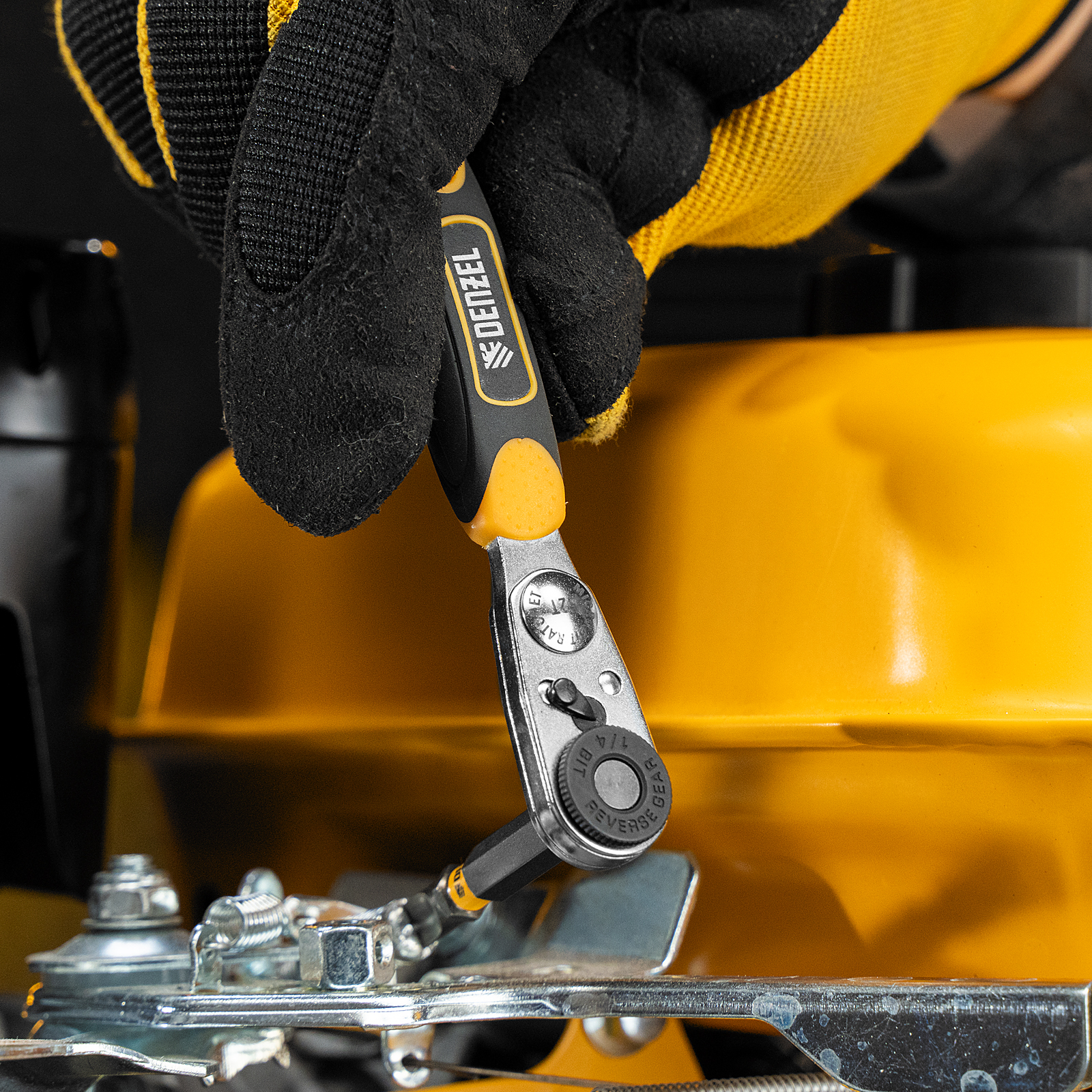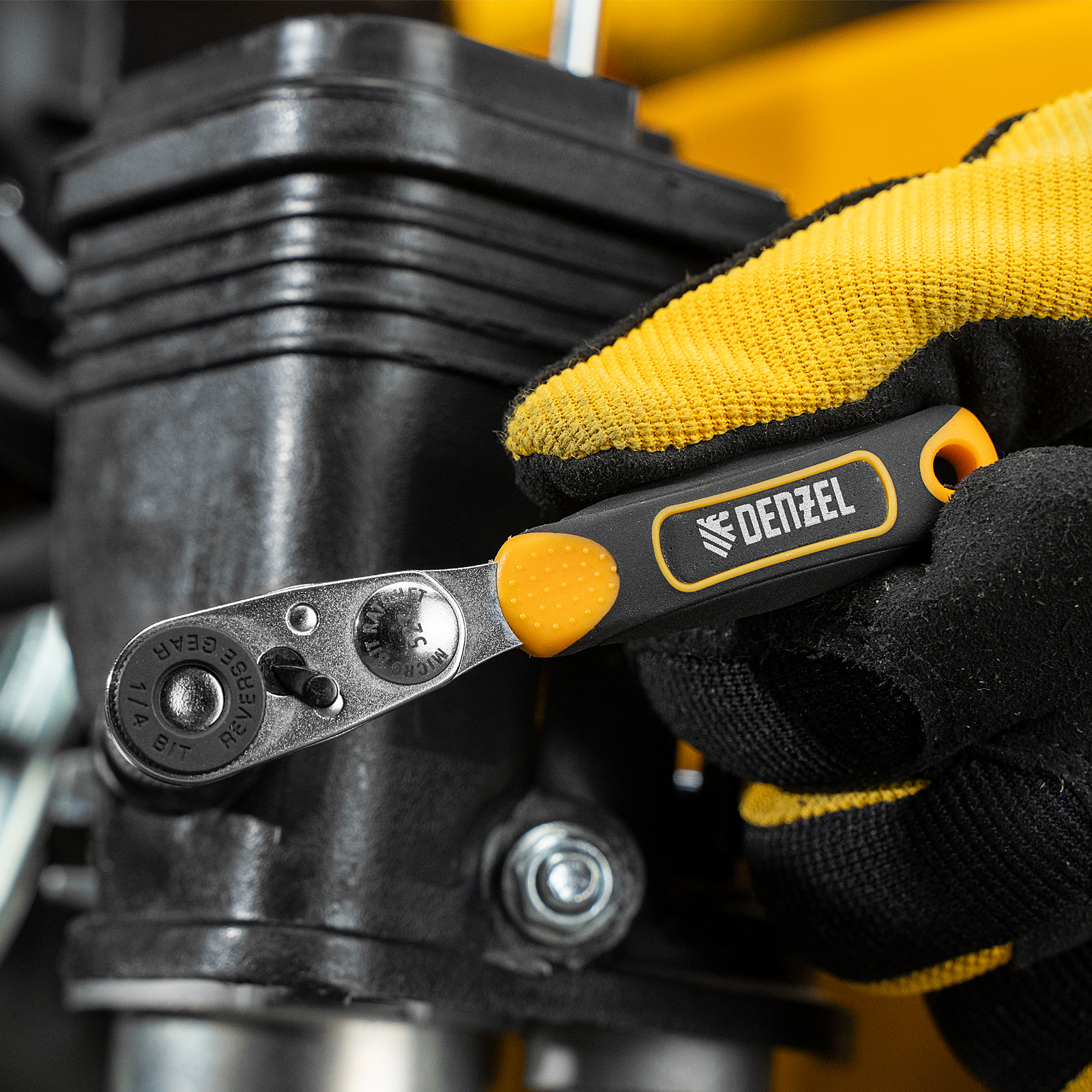Ключ-трещотка для бит Denzel 11633 с присоединительным размером 1/4 дюйма, из стали CrMo, с адаптером для торцевых головок, предназначен для ремонта техники, сборки и установки оборудования. Благодаря высокому крутящему моменту 40 Нм и стальному храповому механизму с 52 зубьями инструмент обеспечивает легкую и плавную работу с резьбовыми соединениями. Ключ будет полезен в автосервисе, на даче, дома или в гараже.