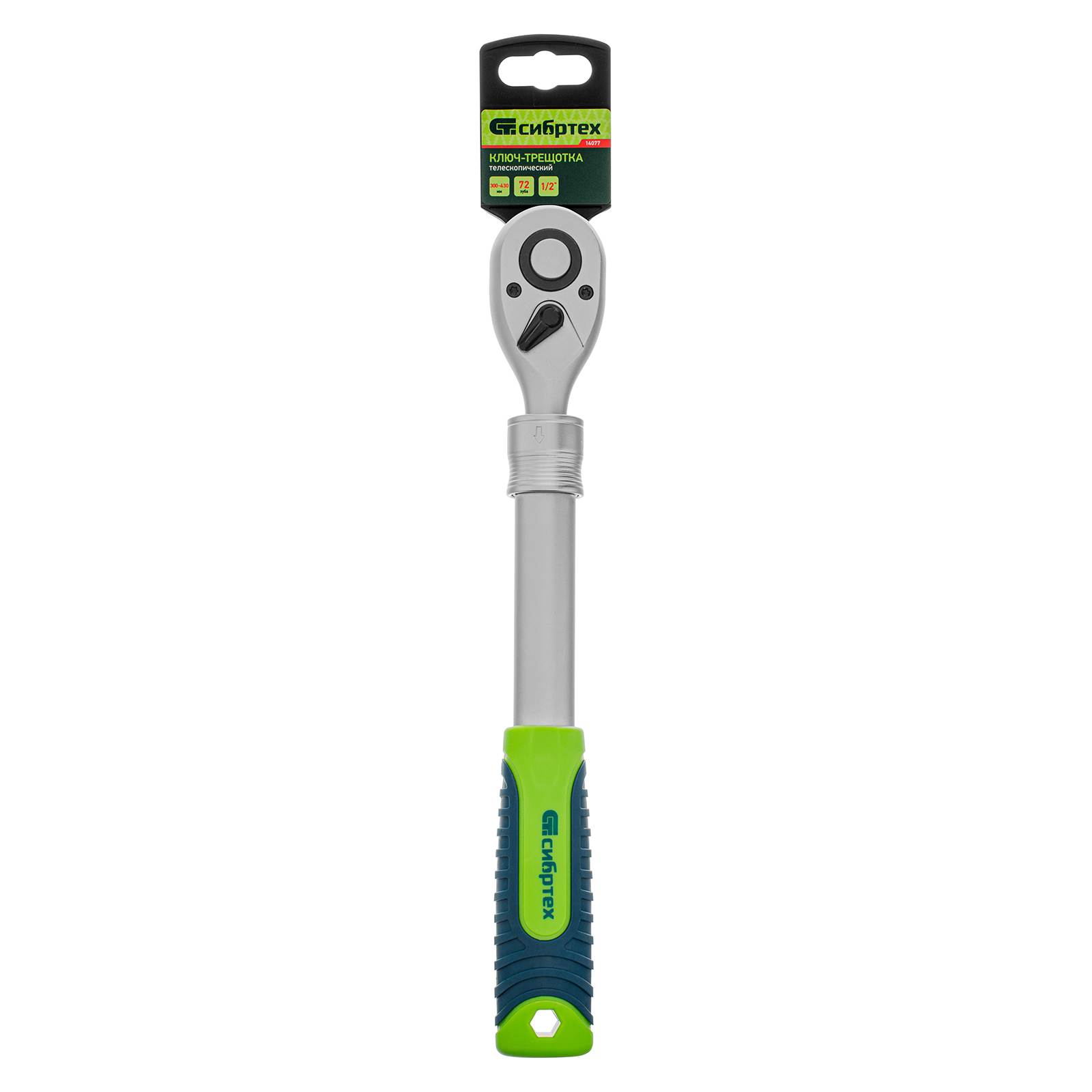 Ключ-трещотка 1/2″ Сибртех 14077 с телескопической рукояткой длиной 300-430 мм, храповым механизмом с 72 зубьями и функцией быстрого сброса, — инструмент для работы с резьбовым крепежом. Используется совместно с торцевыми головками, удлинителями, адаптерами. Телескопическая рукоятка упрощает работу с труднодоступным крепежом, а также позволяет увеличить прикладываемое усилие. Трещоточный механизм с 72 зубьями облегчает работу, угол поворота составляет 5°, что удобно в условиях ограниченного пространства. Инструмент пригодится в мастерской и гараже.