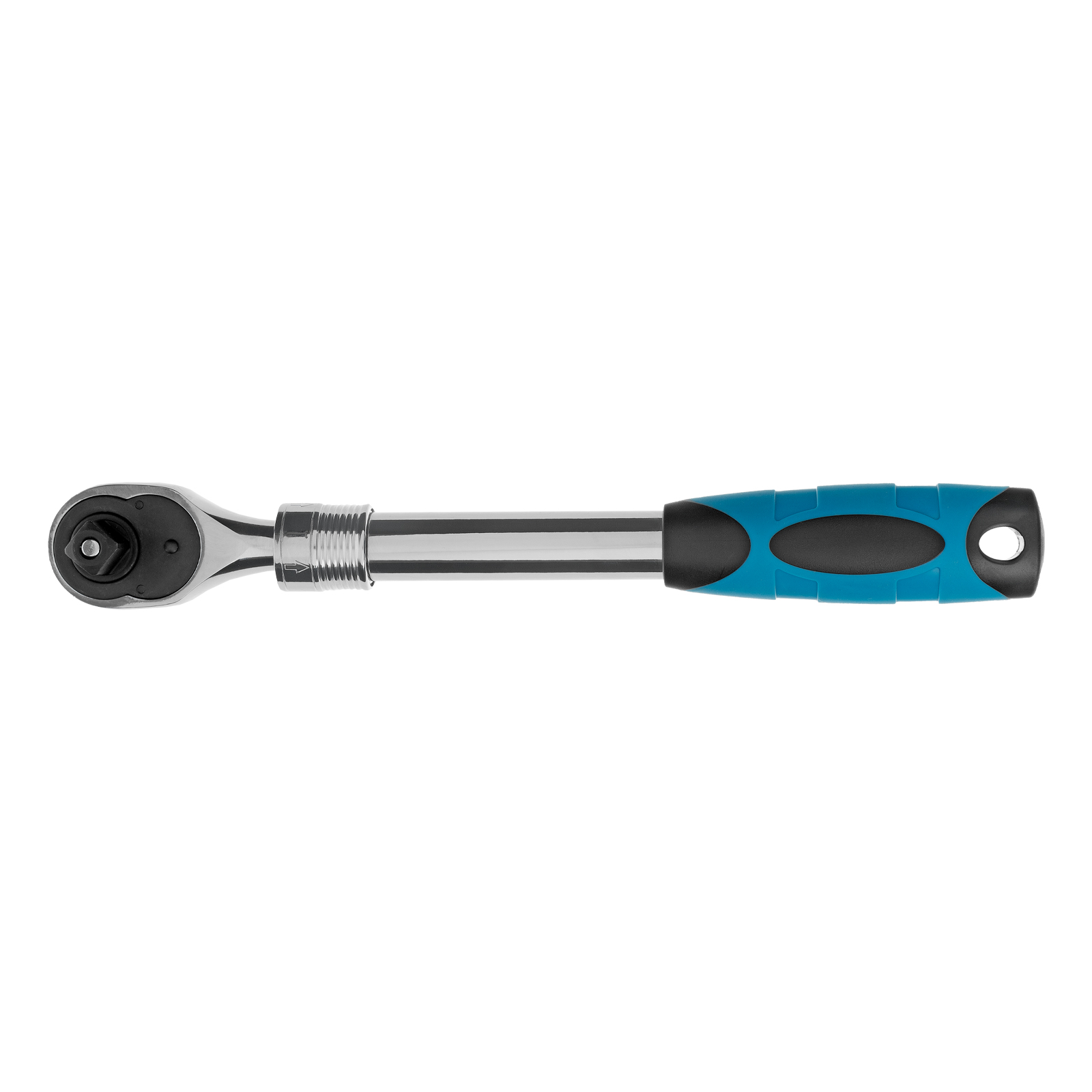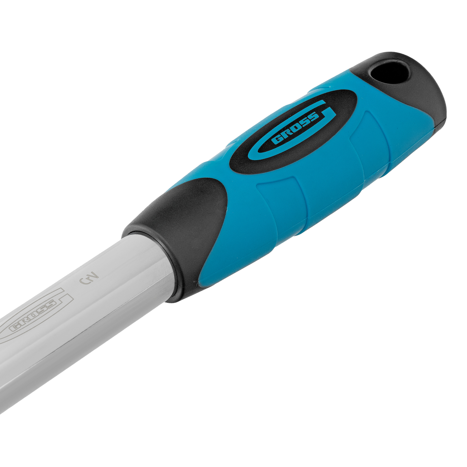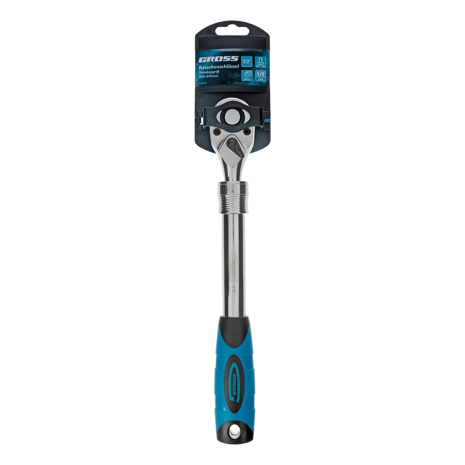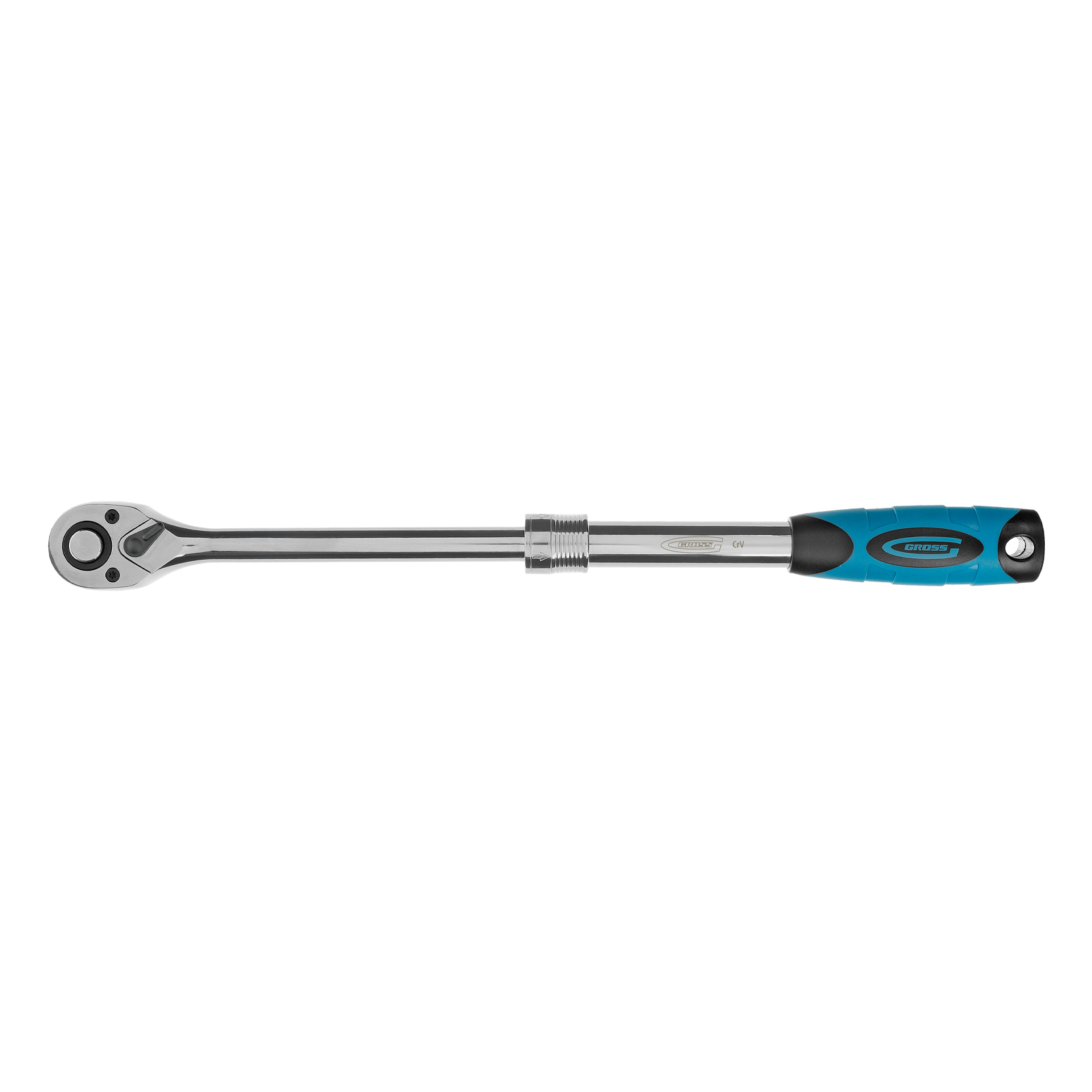 Телескопический хромированный трещоточный ключ Gross 14070, 305-445 мм, из стали CrV, с присоединительным квадратом 1/2 дюйма и 2-компонентной рукояткой, предназначен для монтажных работ с резьбовыми соединениями. Особенно удобен для работы в труднодоступных местах, т.к. имеет запатентованный механизм фиксации телескопической рукоятки. Ее длину можно изменить с 305 до 445 мм. Инструмент используется в слесарных мастерских, автосервисах, пригодится и в быту.